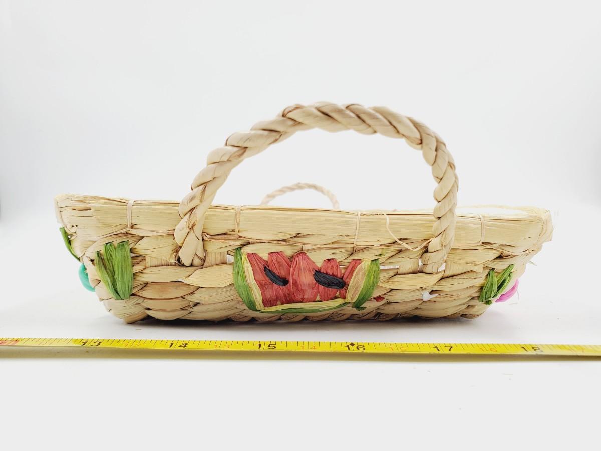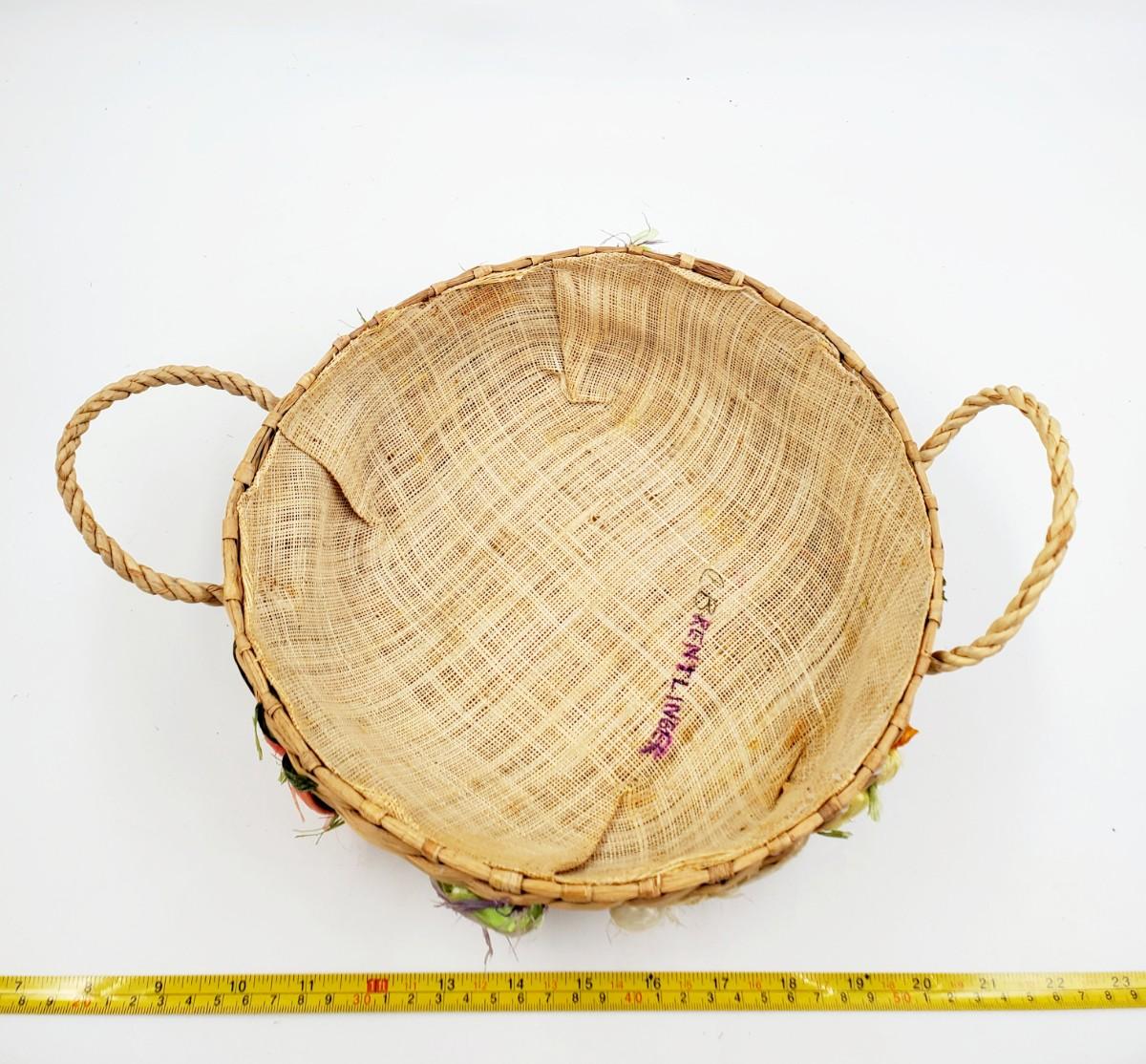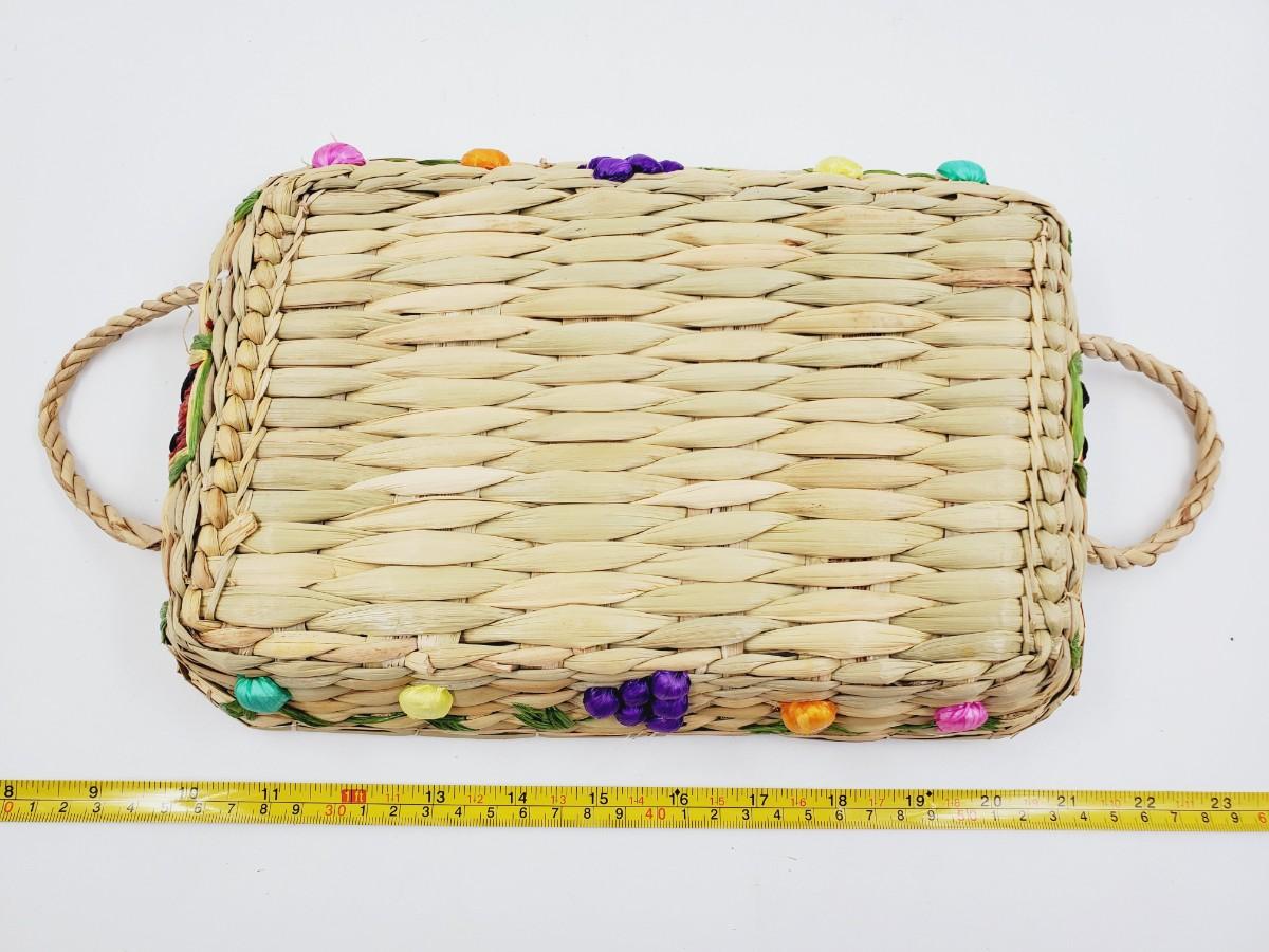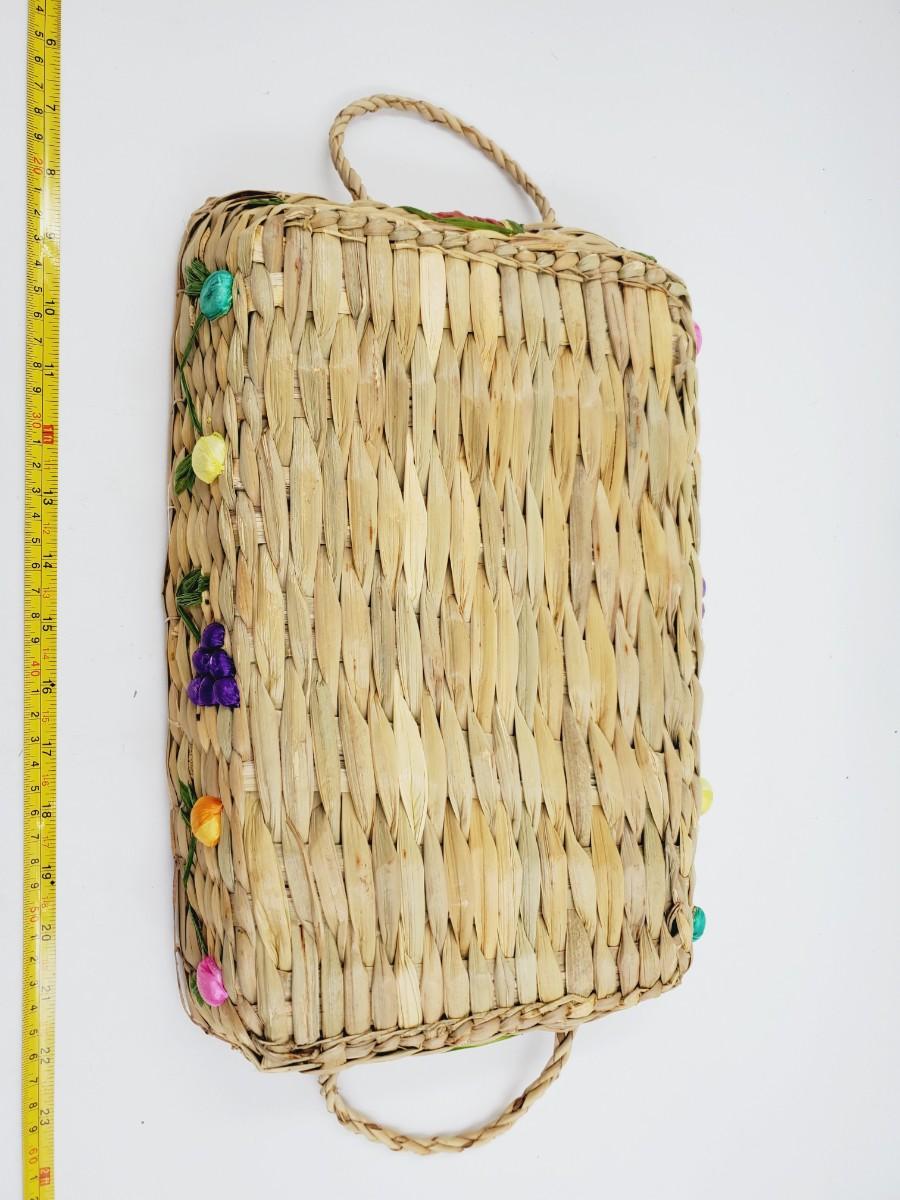 2 rectangular baskets lined with plastic, pretty colored rafia fruit around the outside of the baskets. Round burlap lined basket with pretty raffia vegetables decorating the outer basket. Good condition