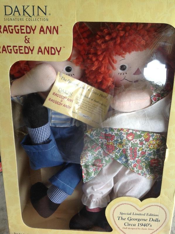 Raggedy Ann and Andy the Georgene Dolls c. 1940's , old stock collectable vintage Dolls, comes with coa , item s new unopened in original packaging, message for questions