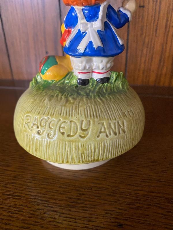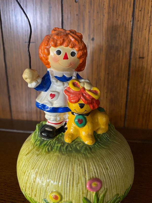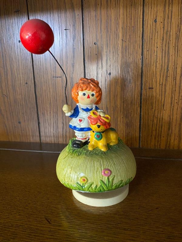 Raggedy Ann music box figurine. Works but is a bit slow going, maybe age and dust. 1981 Schmid.
