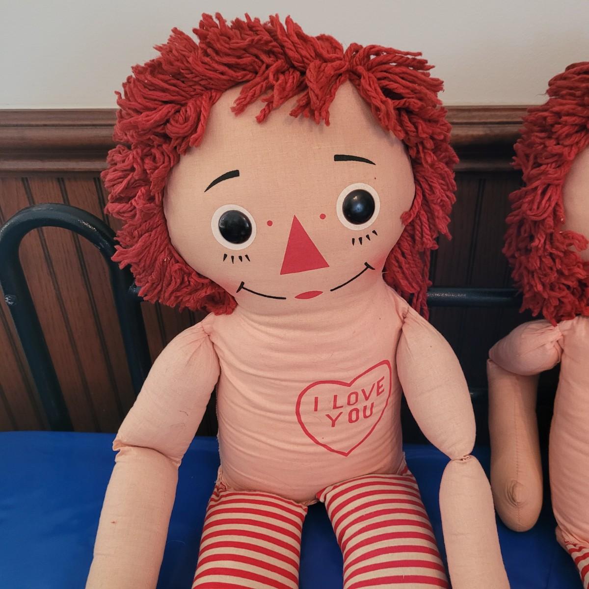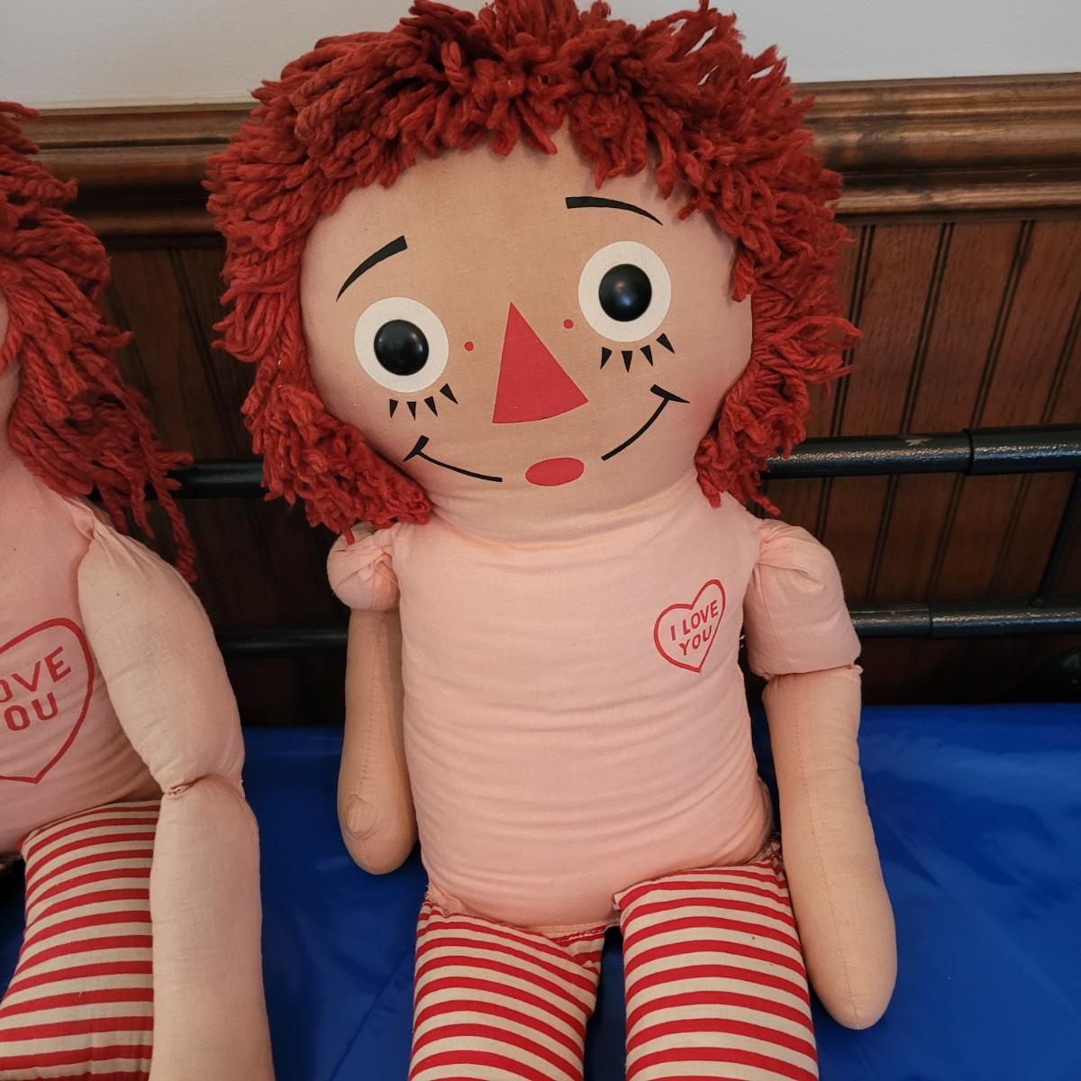 Two Raggedy Anne dolls and two dolls in the style of Strawberry Shortcake make up this lot. Large dolls measure approximately 32" long. Shipping available.