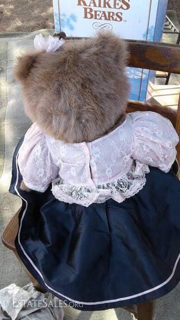 Robert Raikes Bears "Kitty". 24" high. Wooden Face, 1986 Limited Edition W/Certificate. Gently used and well=loved! "This high-stepping gal will steal your heart in her old-fashioned pink lace blouse and full moire fabric Can-Can skirt."