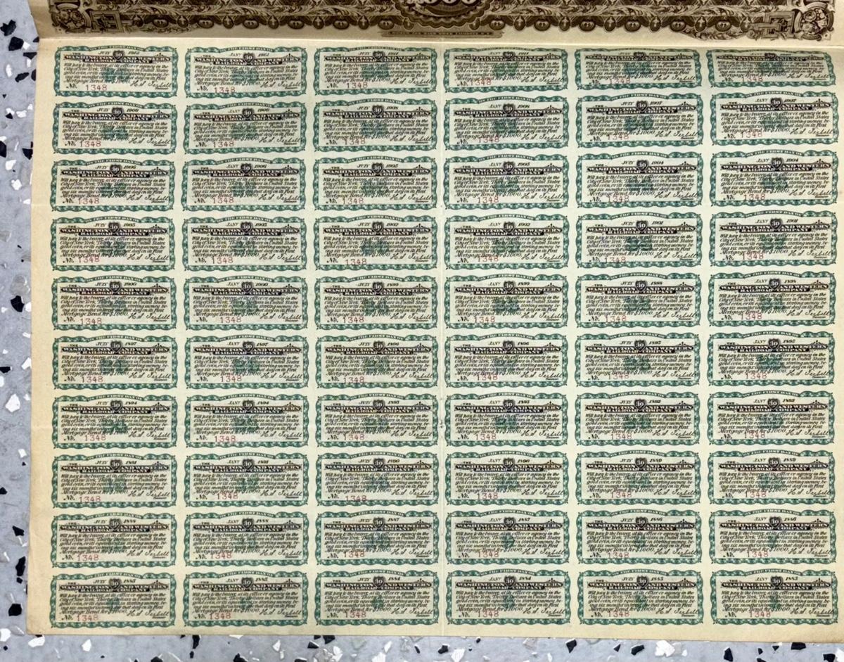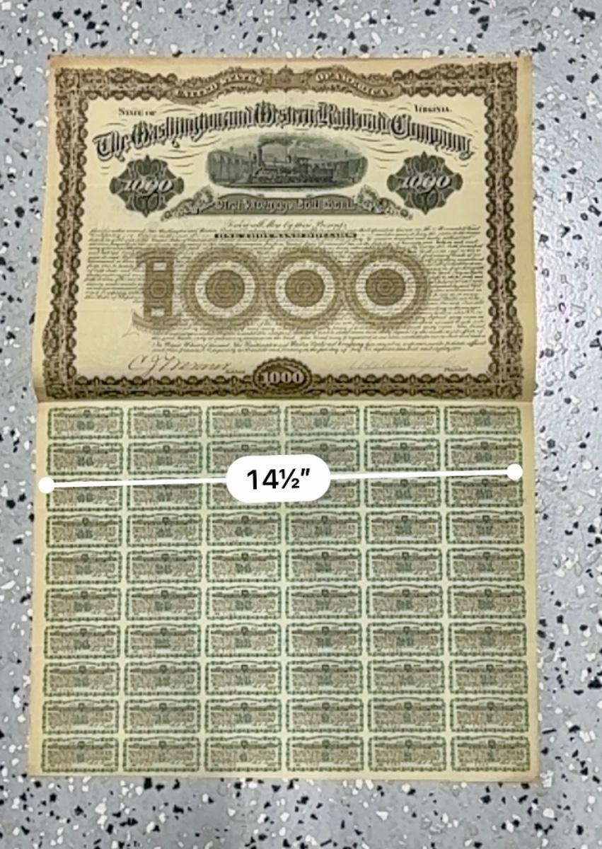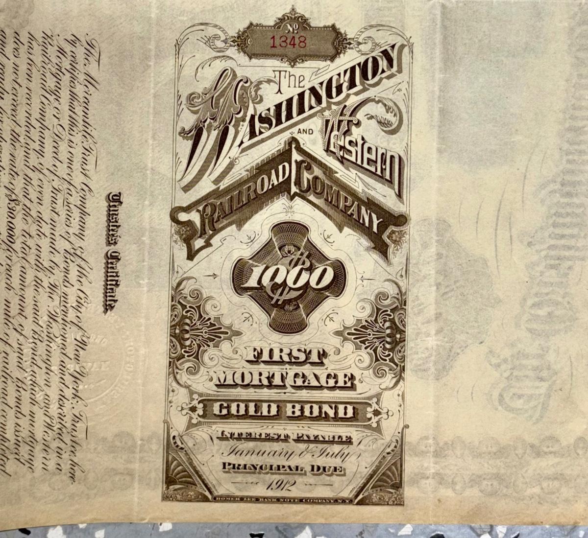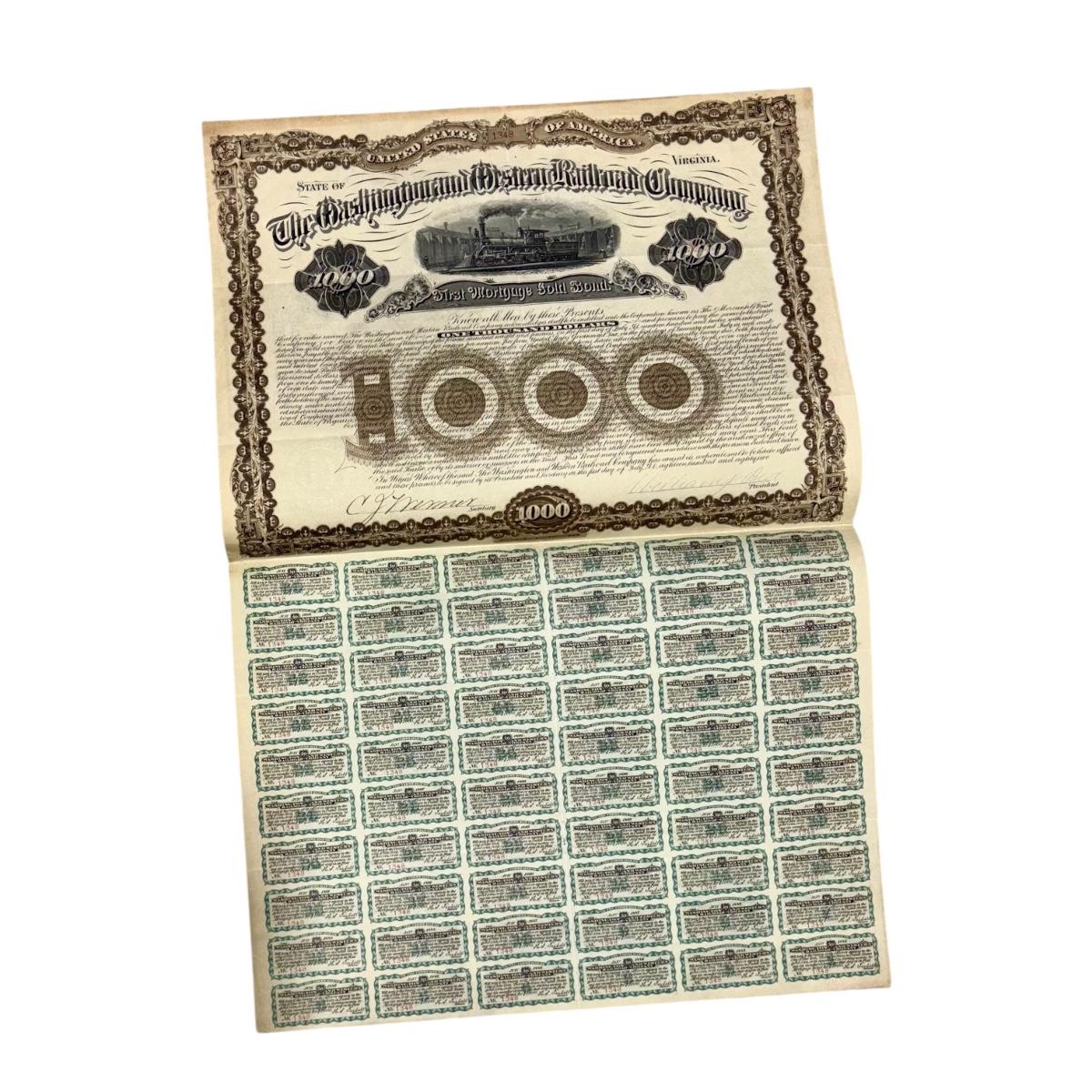 Railroad - $1,000 First Mortgage Gold Bond W/60 Coupons Attached, Washington & Western RR Co., 1882
