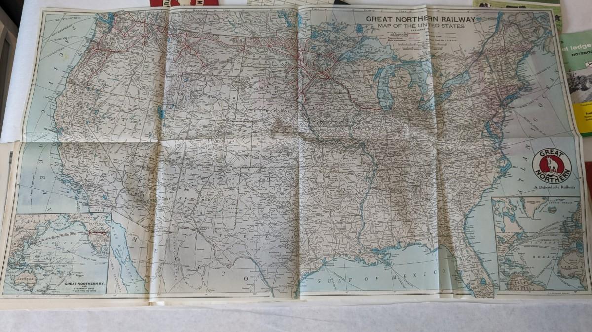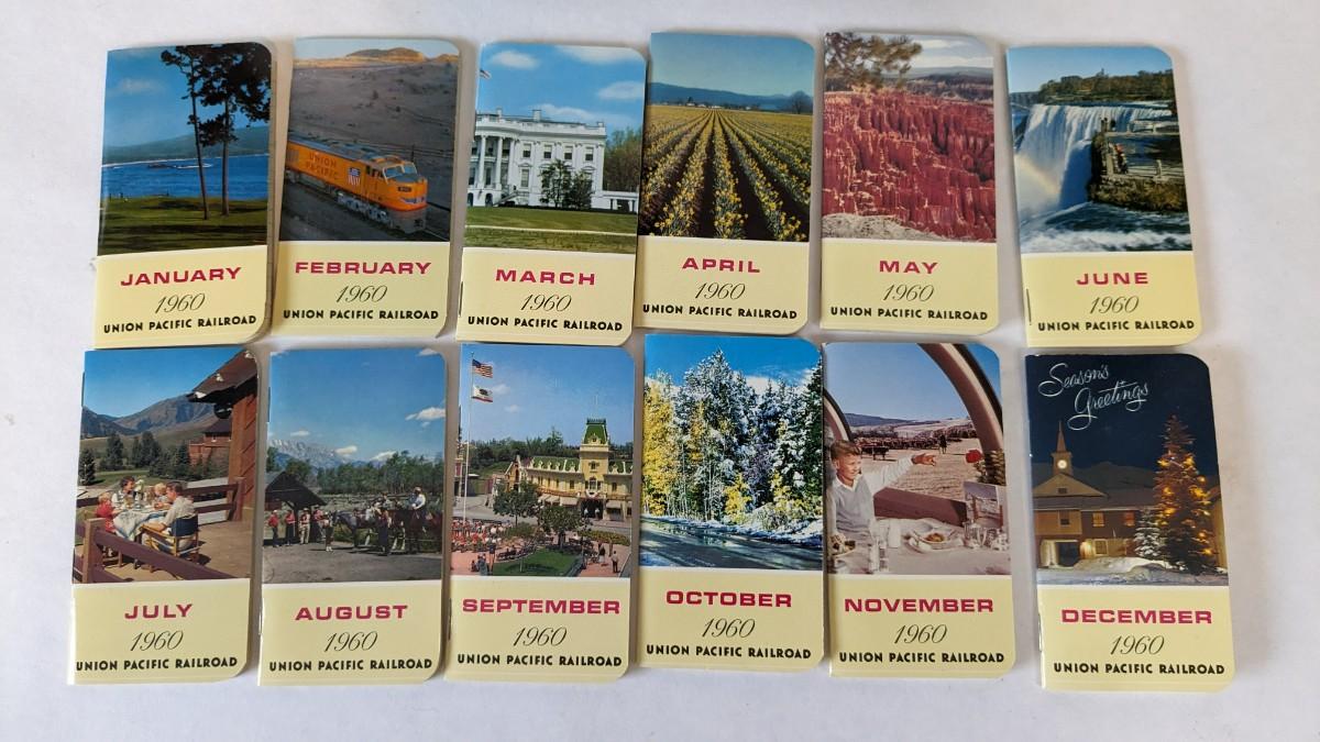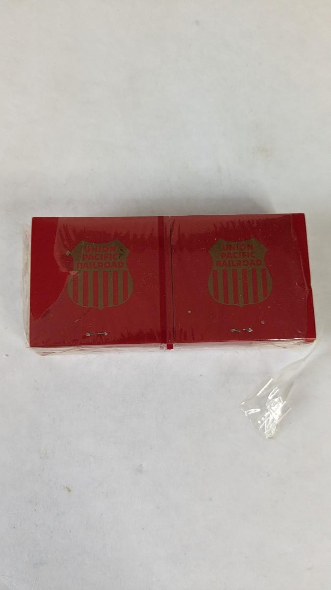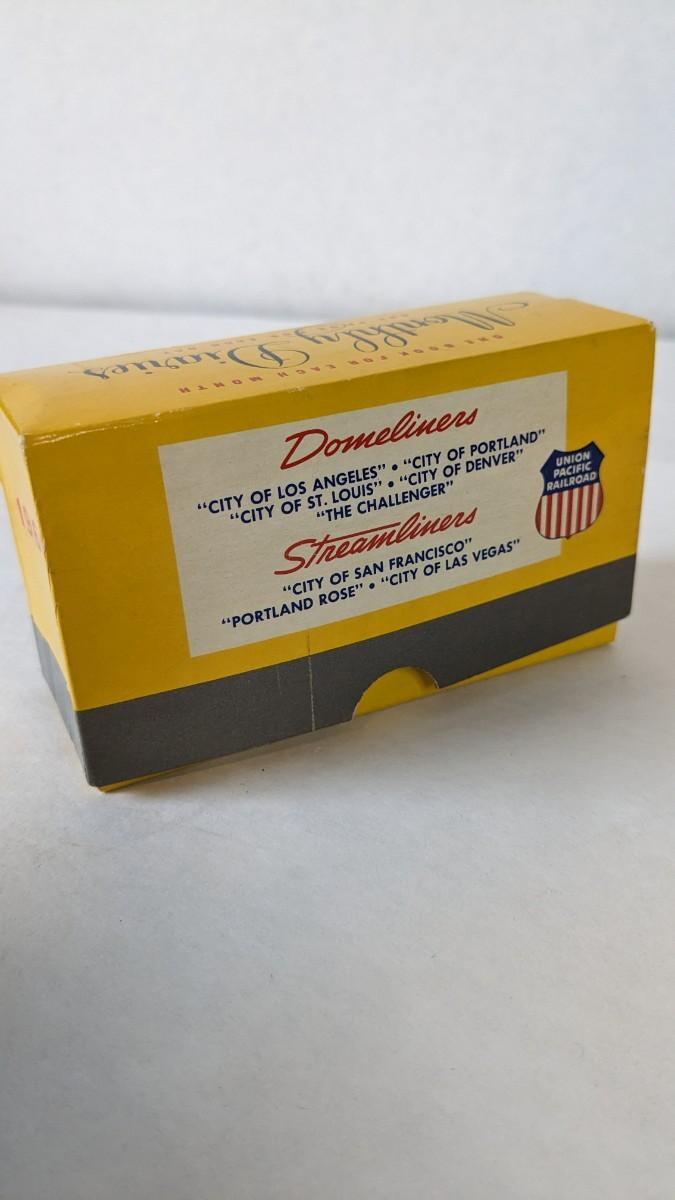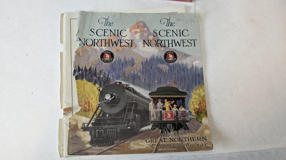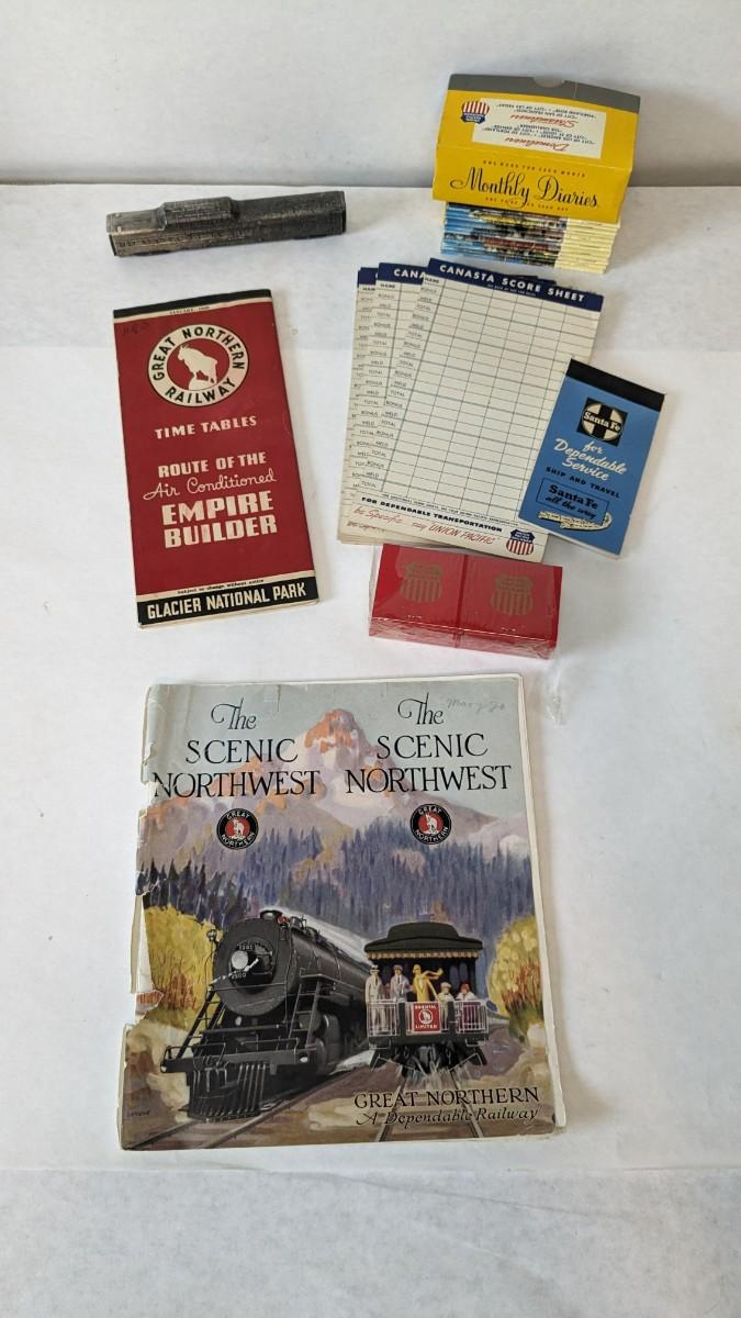 1946 Great Northern Railway Time Tables and map booklet in great condition, a scenic Northwest publication also from Great Northern that shows separation of back and front covers but inside is in good shape. Union Pacific unopened matchbooks, Union Pacific Canasta score cards, Santa Fe notepad with calendar in cover from 1955. Union Pacific Monthly Diaries from 1960 in original cardboard box and in fantastic condition. Finally, a hollow cast 6 1/8" Burlington Silver Dome replica that shows patina. All in all a fantastic collection for any railroad enthusiast and collector!