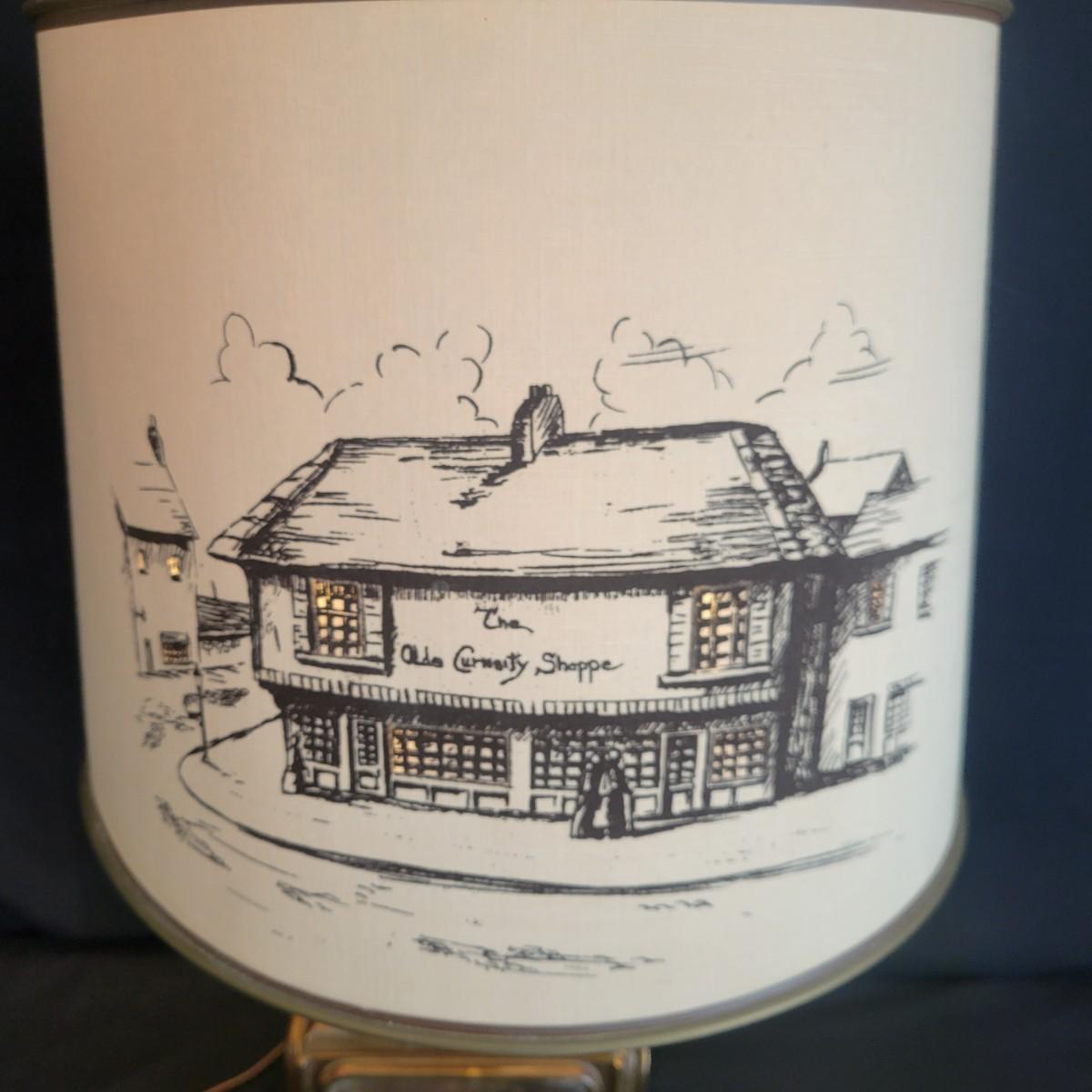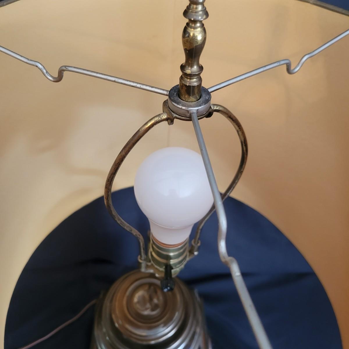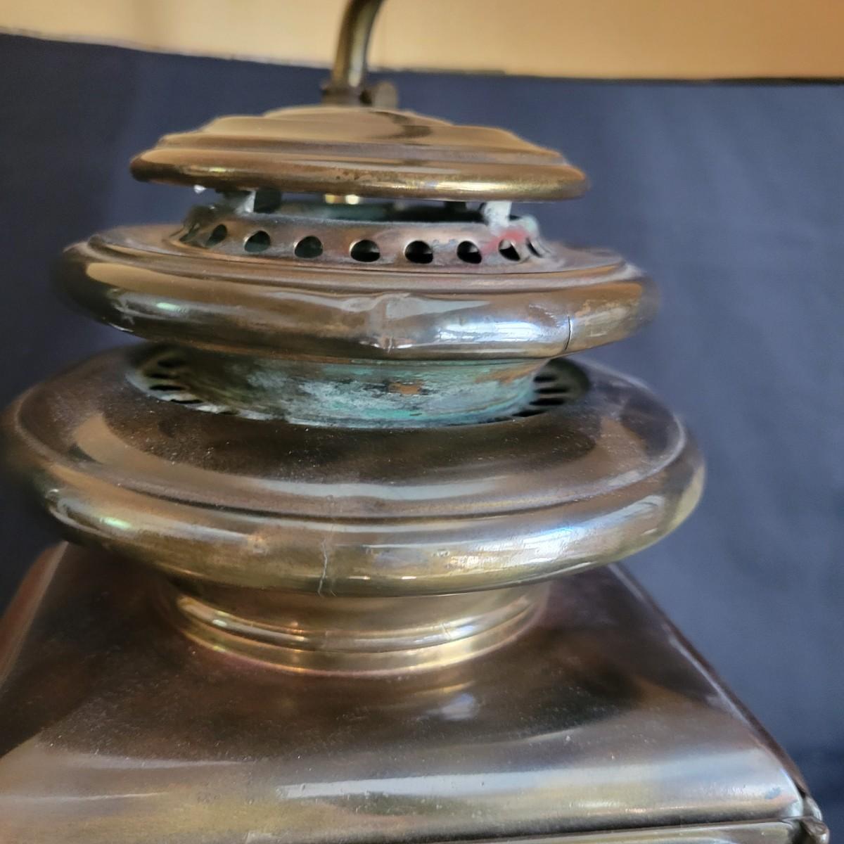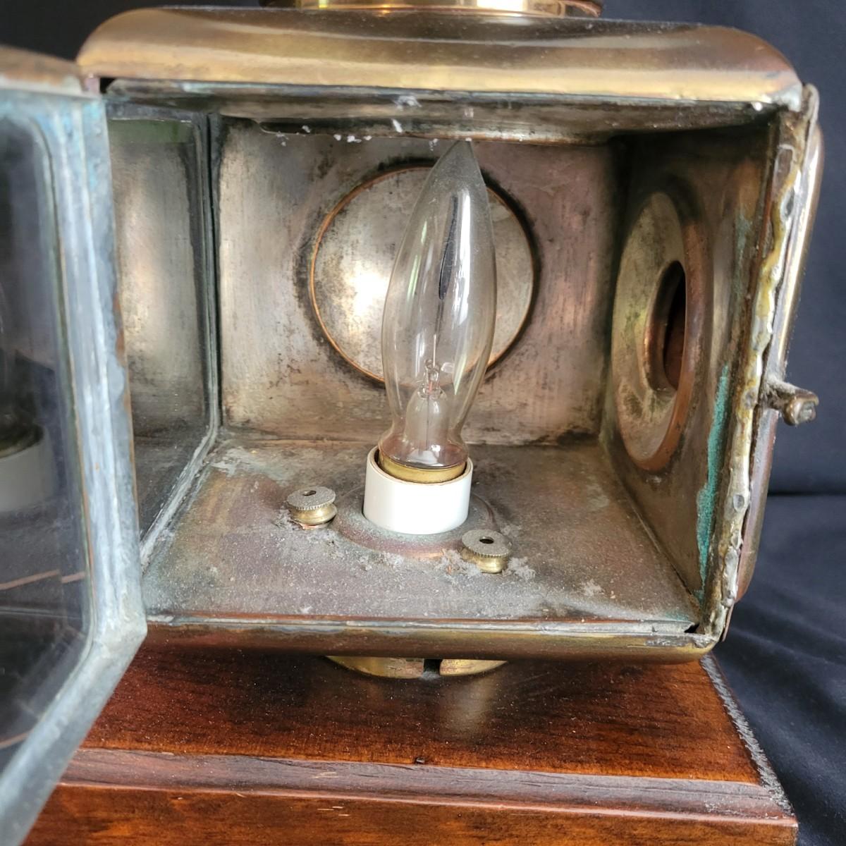 A brass railroad lantern that has been converted into a table lamp. The lantern has three beveled glass windows with one that opens. The lamp has a 3 way switch that appears to be modified to turn the lantern on separately from the lamp. It measures approximately 7.5" x 7" x 26"H. Shipping available