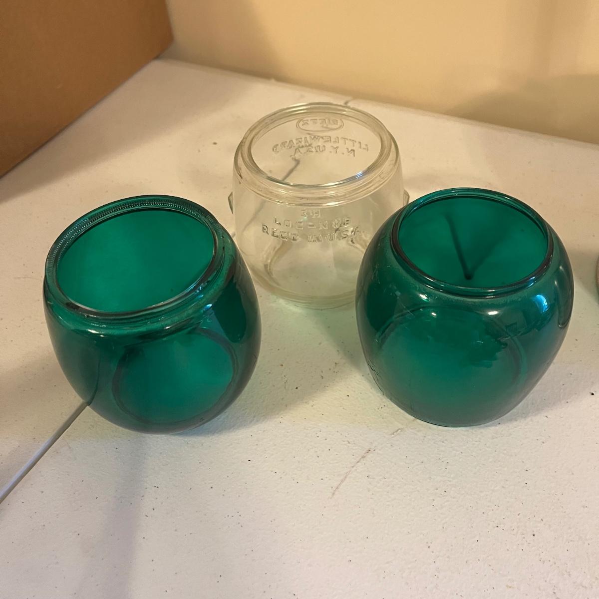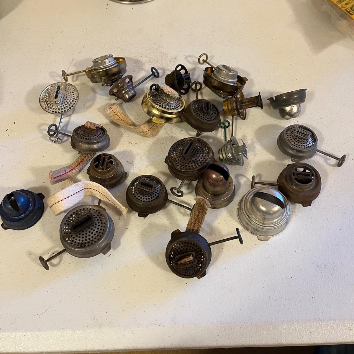 This is a large group of railroad lantern parts that includes a hook, three glass globes, a funnel, burners, and many more parts. See pictures for inventory and details.
