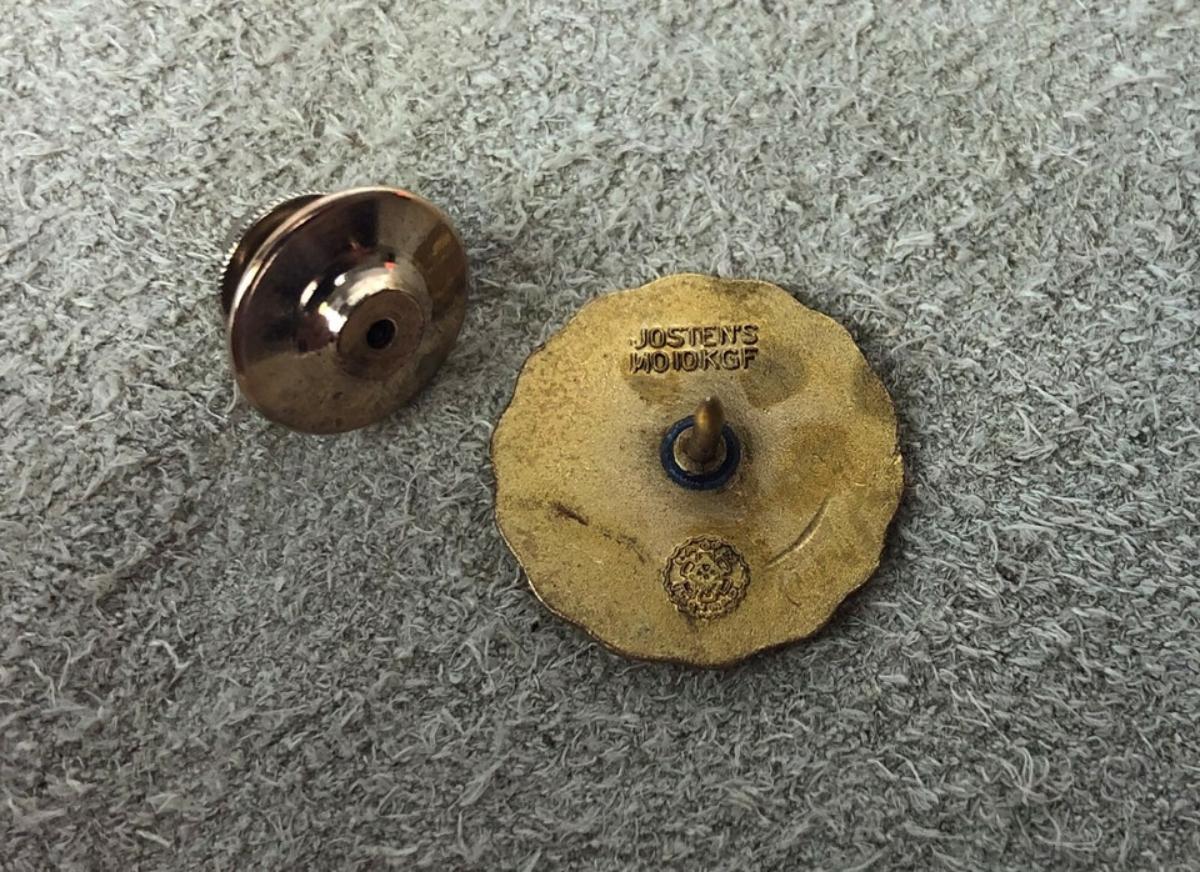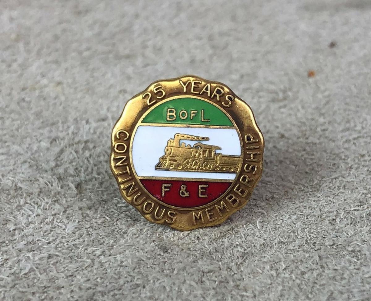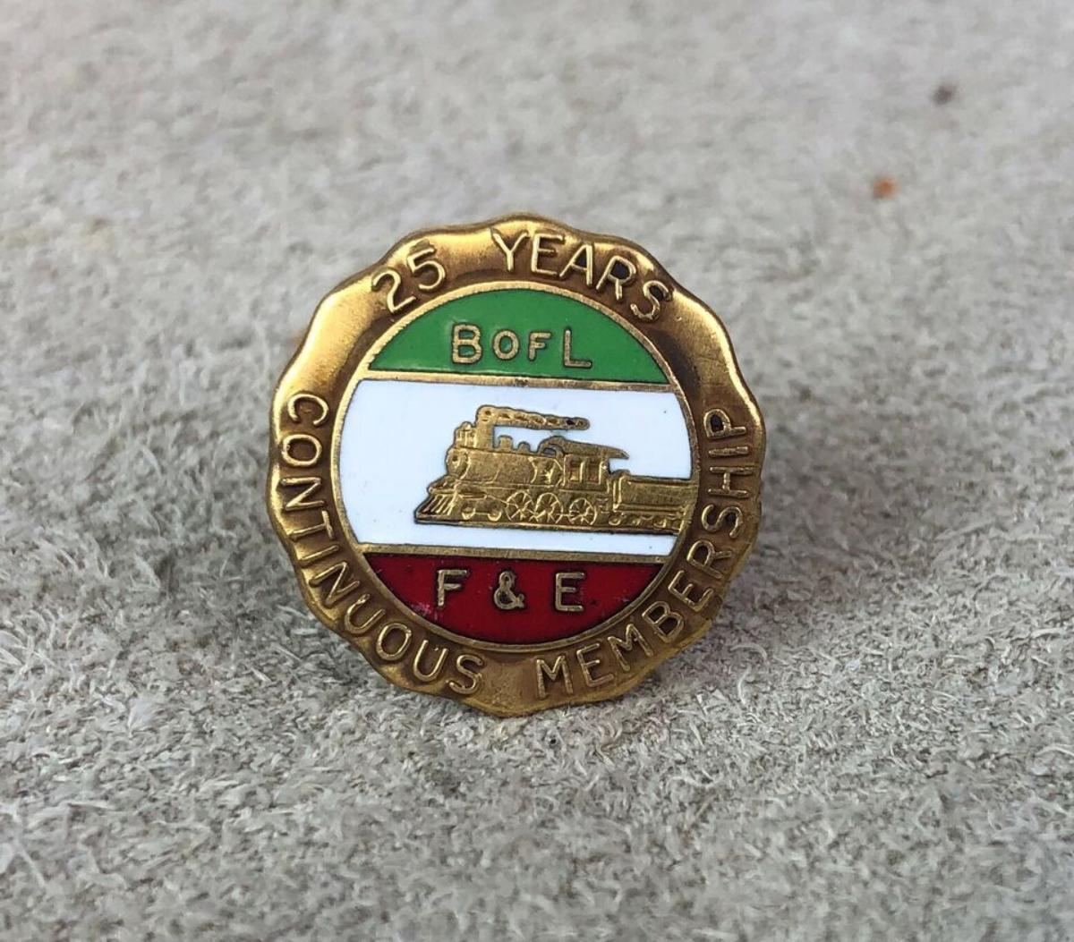 25 year continuous membership lapel pin from the Brotherhood of Locomotive Firemen and Enginemen (B of LF&E) a North American railroad fraternal benefit society and trade union in the 19th and 20th centuries...Organized in 1873...Merged in 1969...Very good condition on this gold-filled union pin...Made by Josten's.