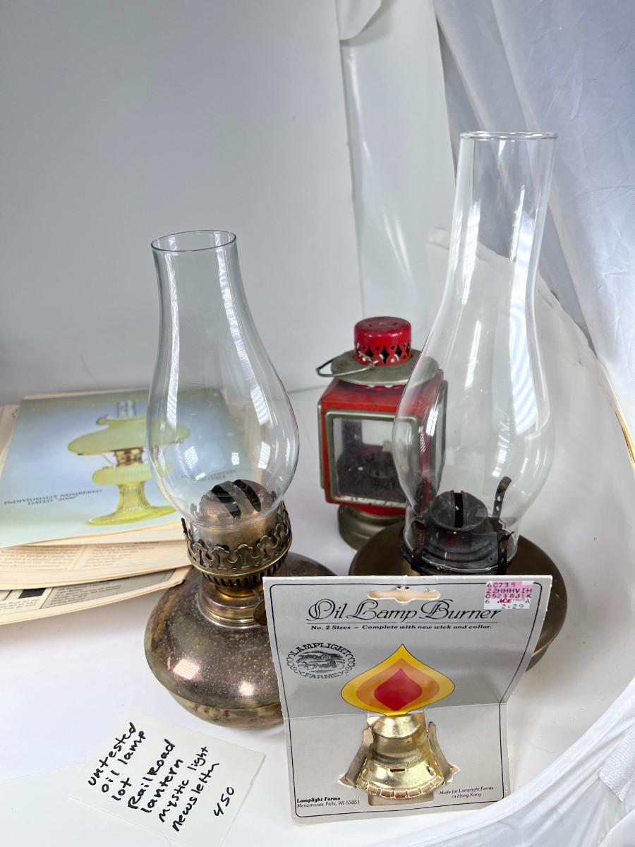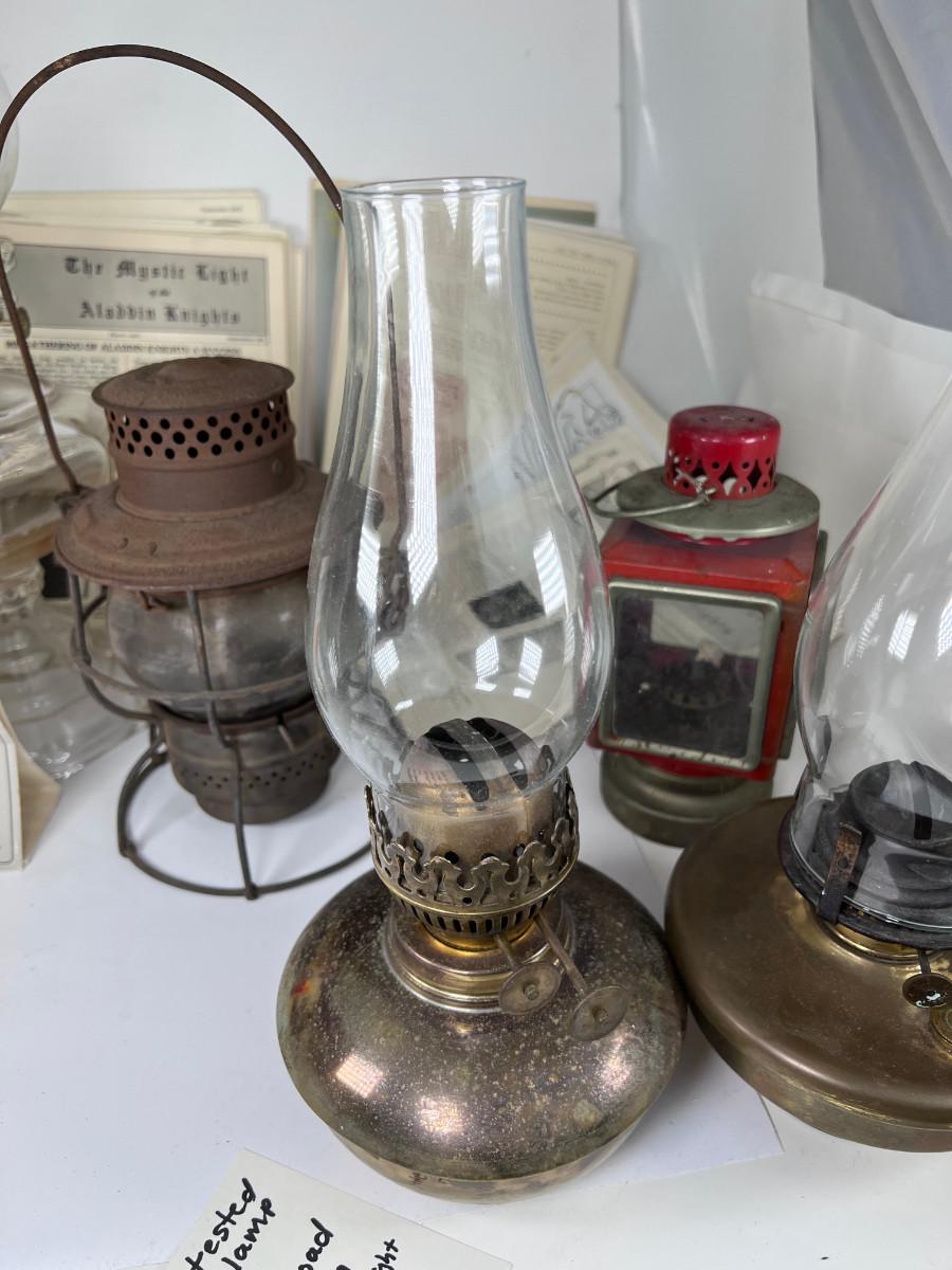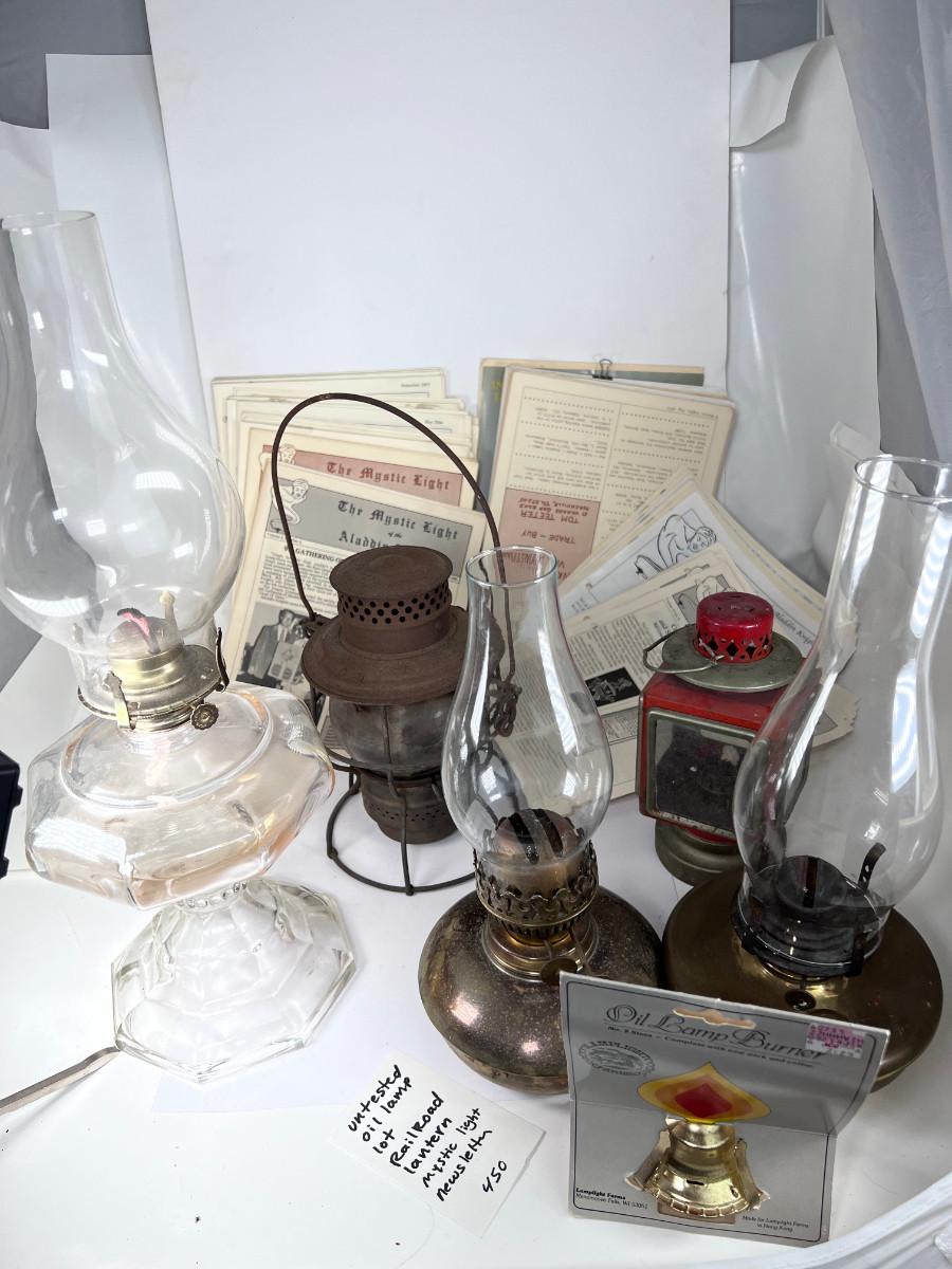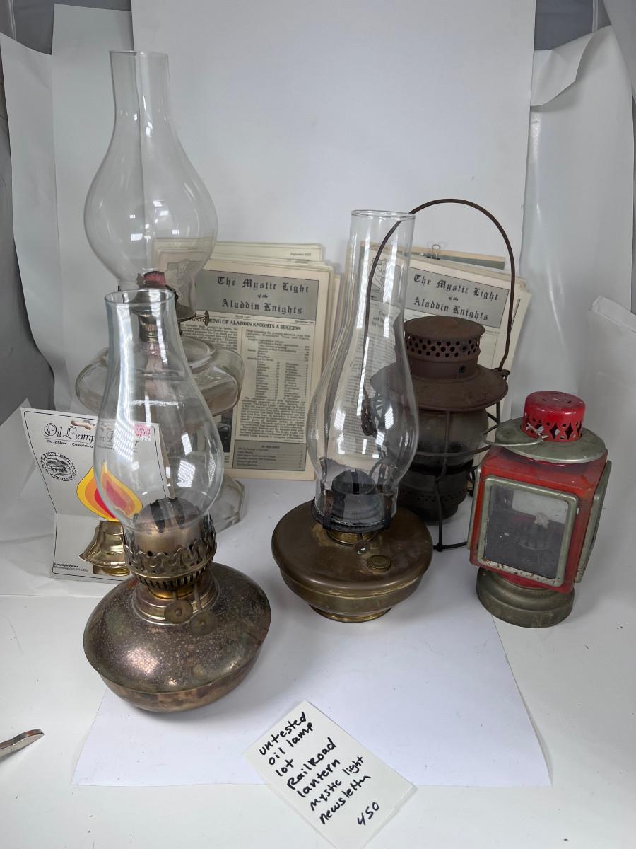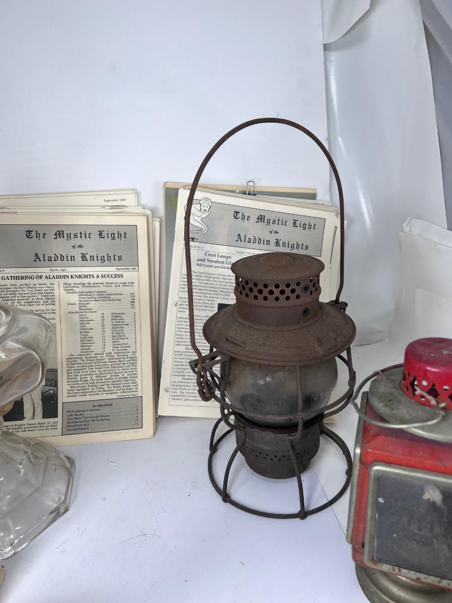 Rusted railway lantern, pole top vintage oil lamp, 2 brass oil lamps 1 with duplex burner, vintage glass chimneys, glass oil lamp with bubble chimney, extra burner. Large amount of Aladdin newsletters and brochures. Railway lantern needs clean up but looks to be marked "New York Railroad" which is highly collectible. Brass oil lamps as as is and have dins and one of the fuel caps is incorrect. The little red lantern also needs work. The big glass lantern has Kerosene stain. Be aware if you want this lot shipped it will be over $100.00 for all.