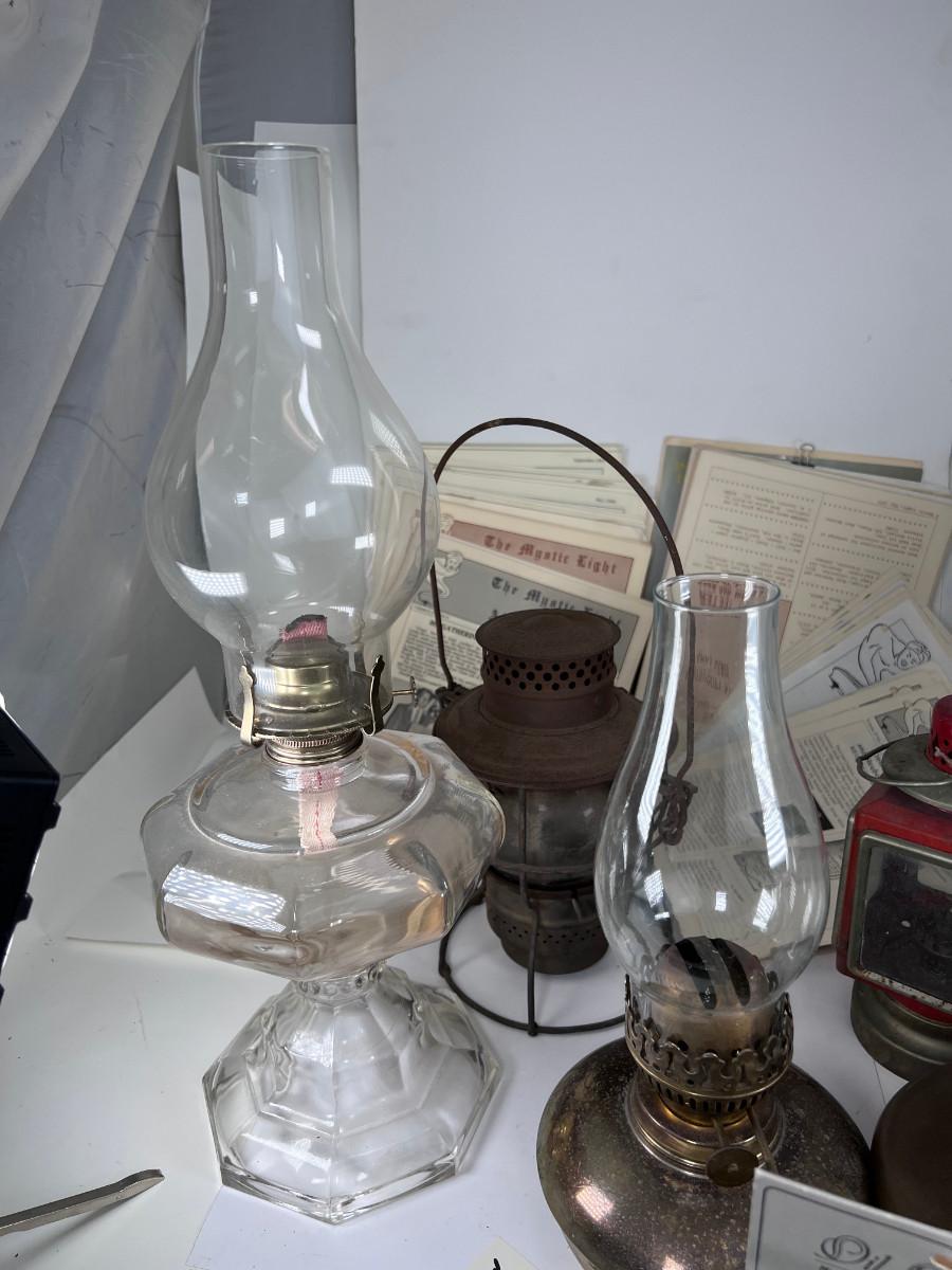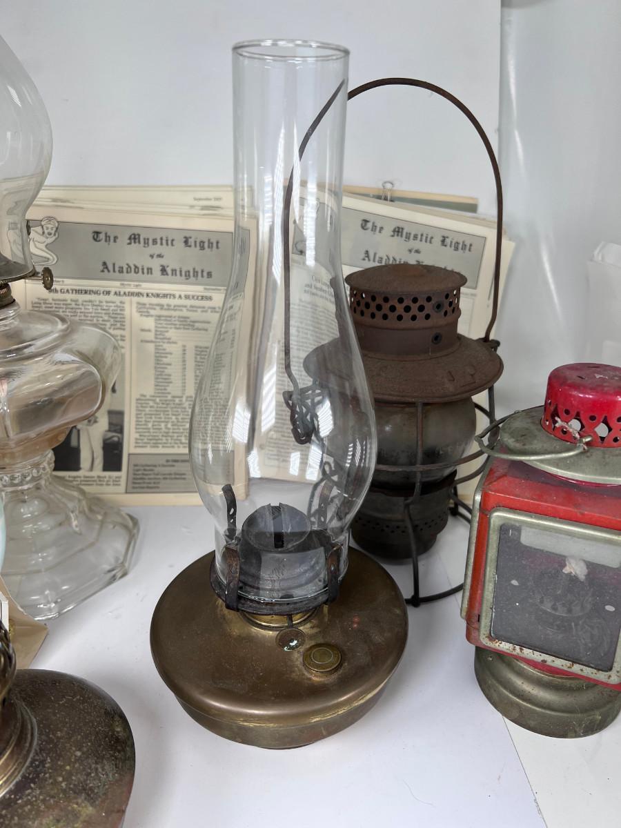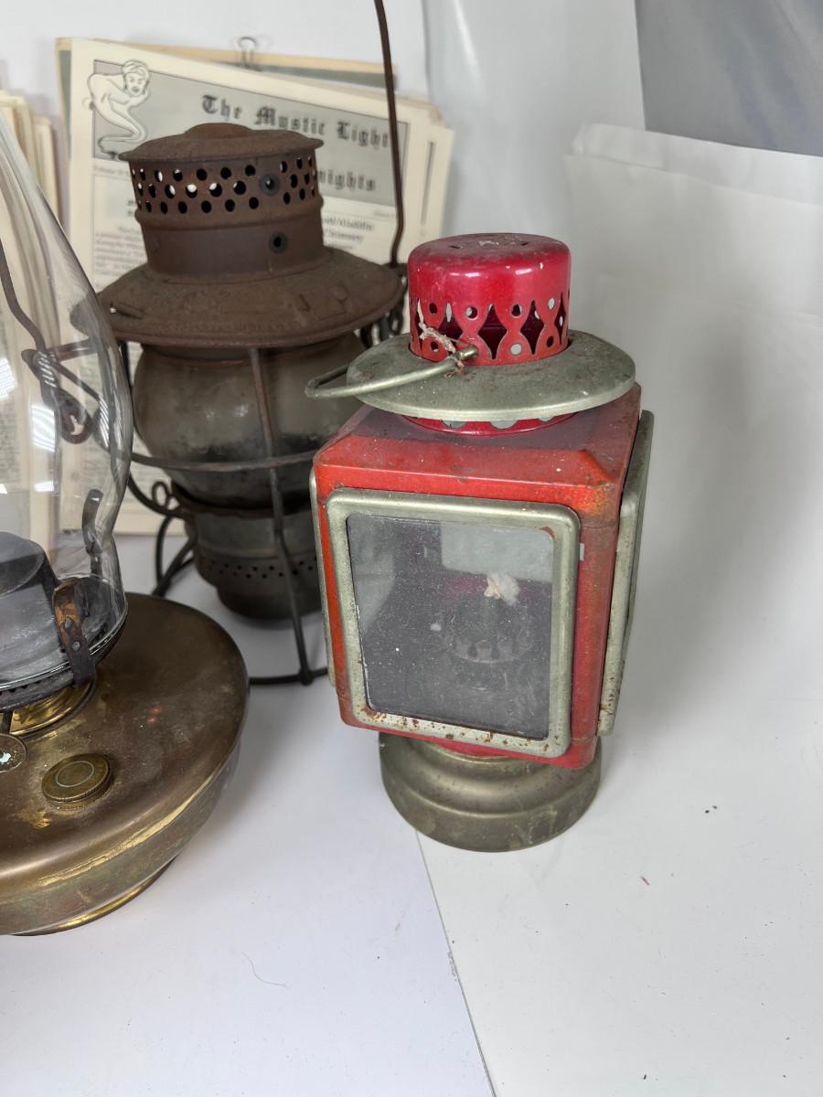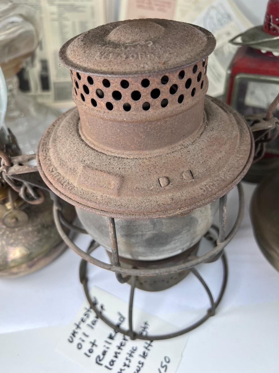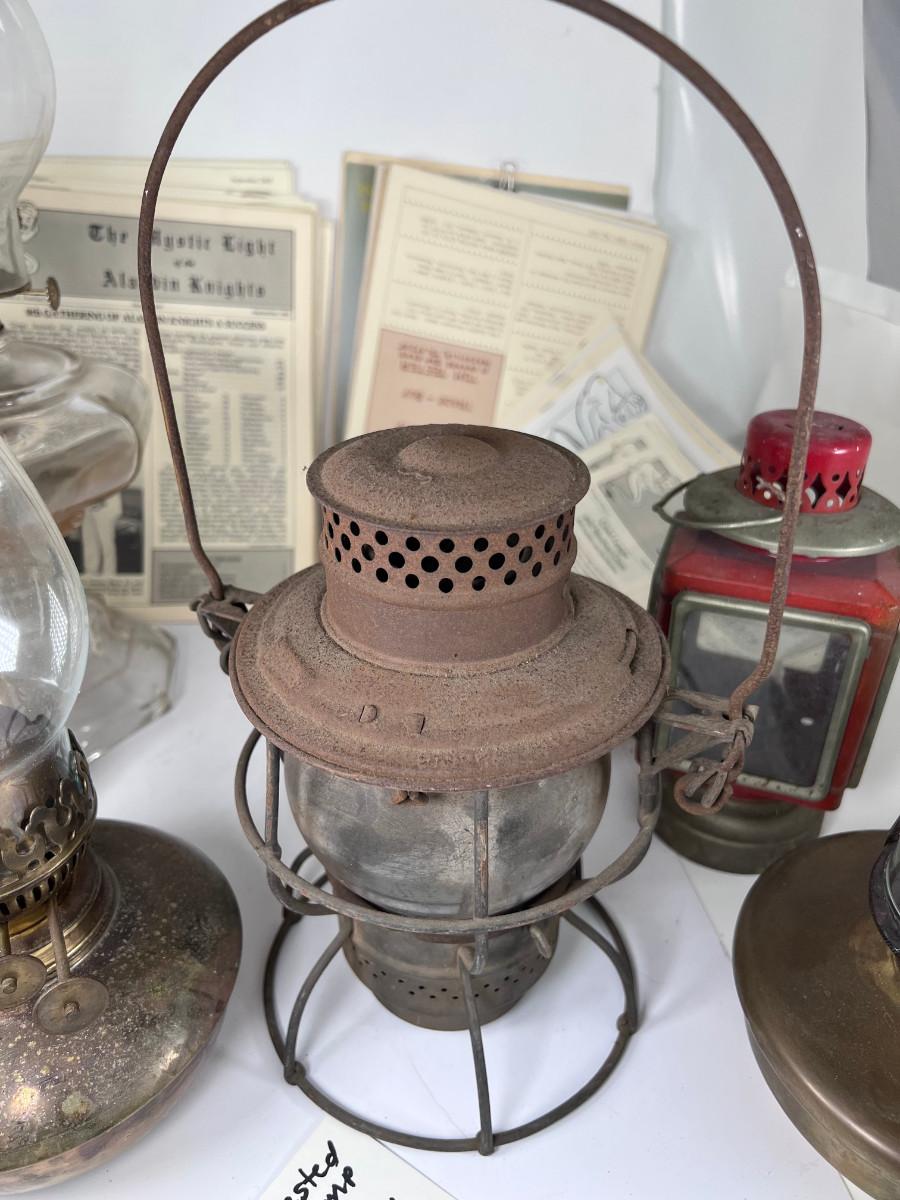 Rusted railway lantern, pole top vintage oil lamp, 2 brass oil lamps 1 with duplex burner, vintage glass chimneys, glass oil lamp with bubble chimney, extra burner. Large amount of Aladdin newsletters and brochures. Railway lantern needs clean up but looks to be marked "New York Railroad" which is highly collectible. Brass oil lamps as as is and have dins and one of the fuel caps is incorrect. The little red lantern also needs work. The big glass lantern has Kerosene stain. Be aware if you want this lot shipped it will be over $100.00 for all.