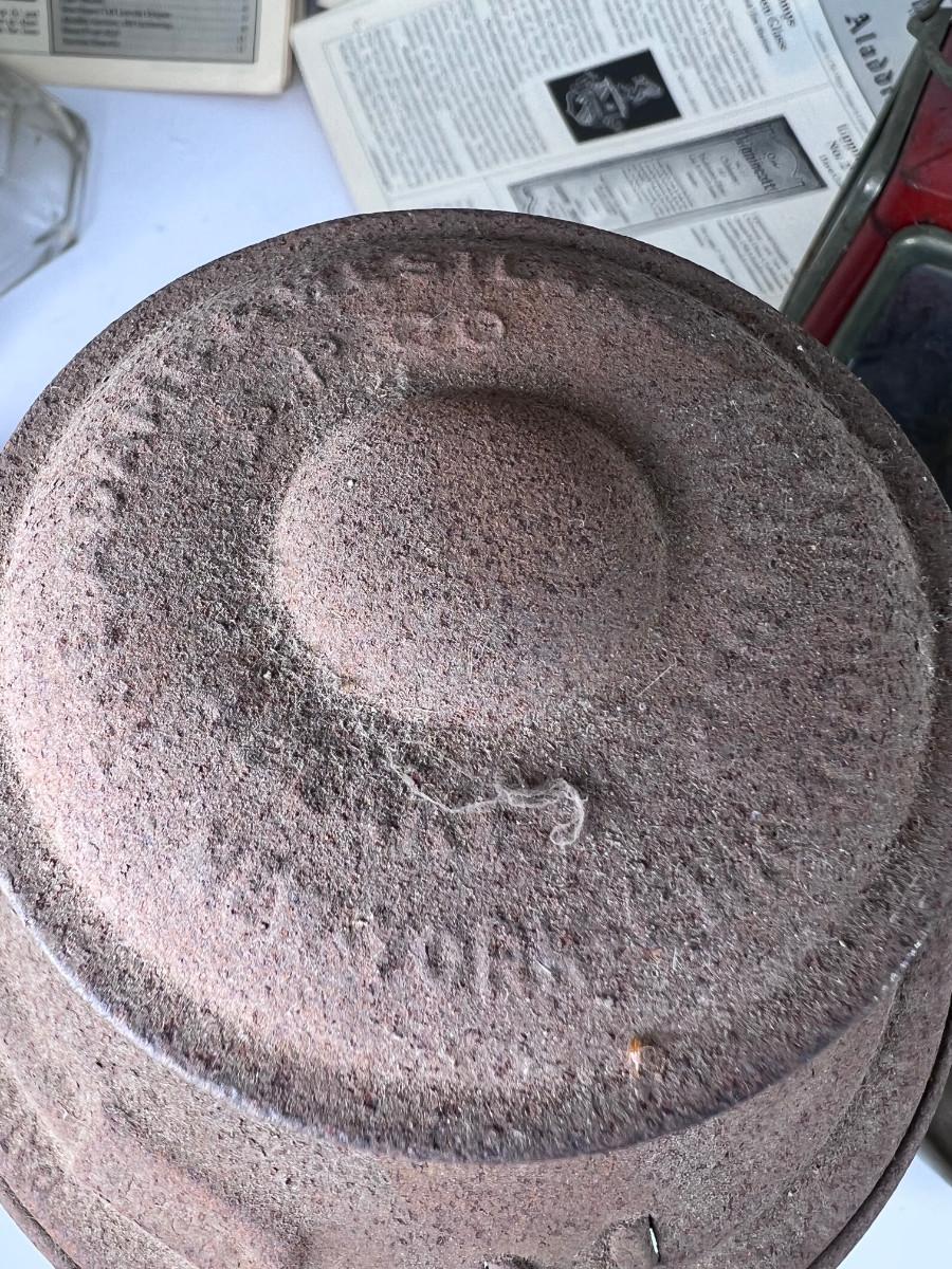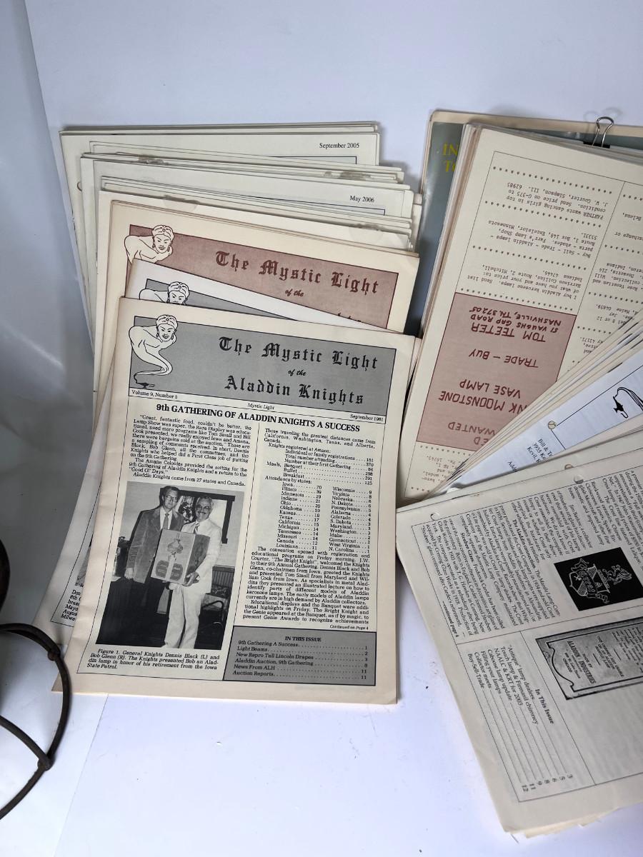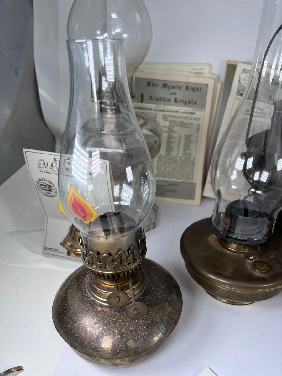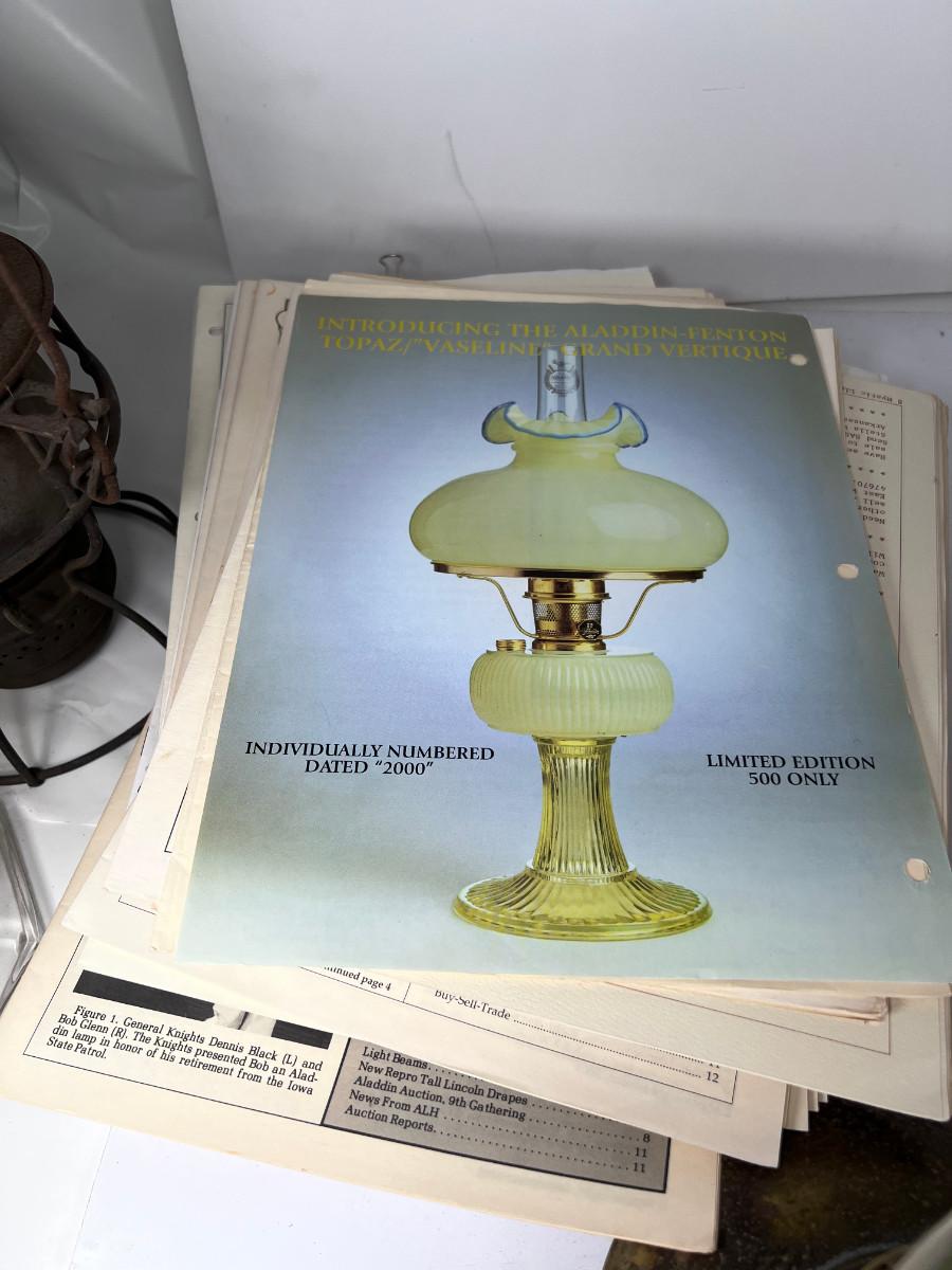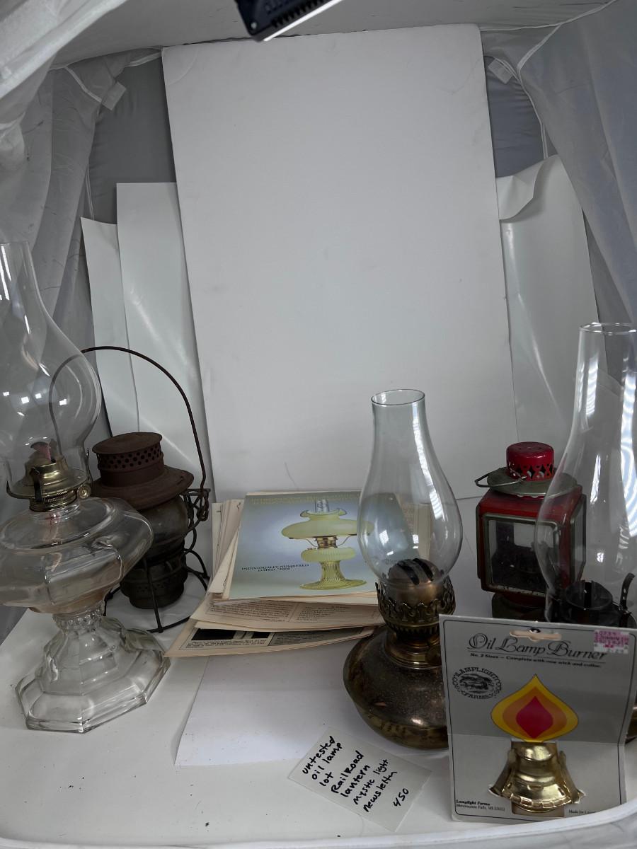 Rusted railway lantern, pole top vintage oil lamp, 2 brass oil lamps 1 with duplex burner, vintage glass chimneys, glass oil lamp with bubble chimney, extra burner. Large amount of Aladdin newsletters and brochures. Railway lantern needs clean up but looks to be marked "New York Railroad" which is highly collectible. Brass oil lamps as as is and have dins and one of the fuel caps is incorrect. The little red lantern also needs work. The big glass lantern has Kerosene stain. Be aware if you want this lot shipped it will be over $100.00 for all.