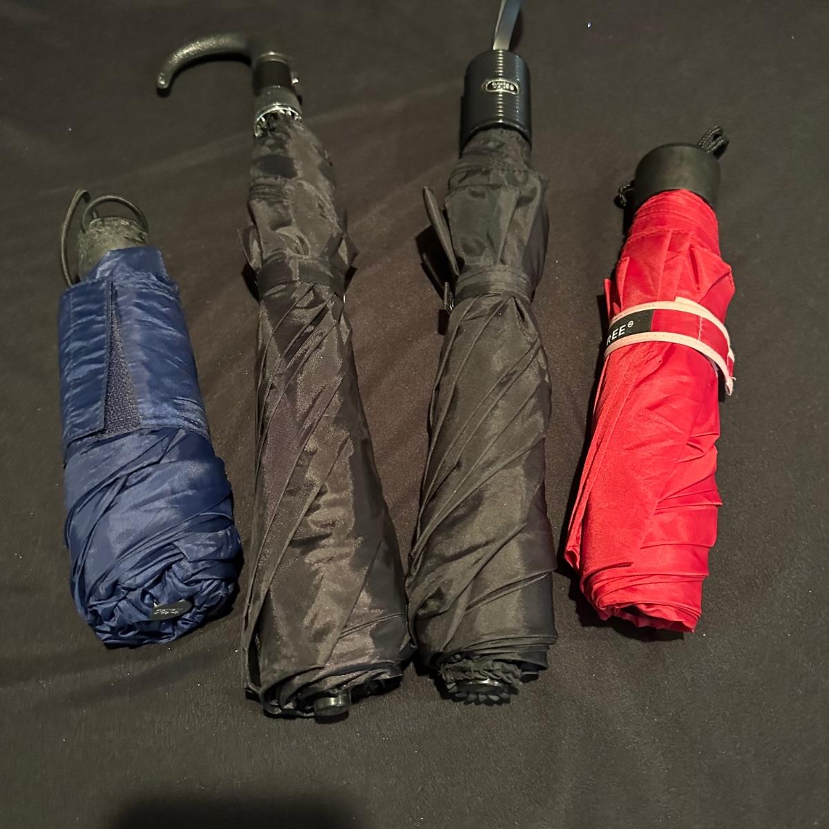 Four umbrellas, a poncho, two pair of Eargrips, and one size fits all reinforced palm gloves will keep you warm and dry in wet weather. Umbrellas open and close securely, Eargrips have strong spring grip and one size fits all vinyl poncho has never been opened. Shipping available.