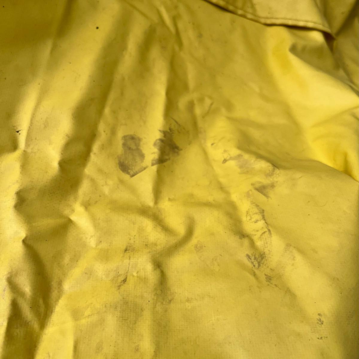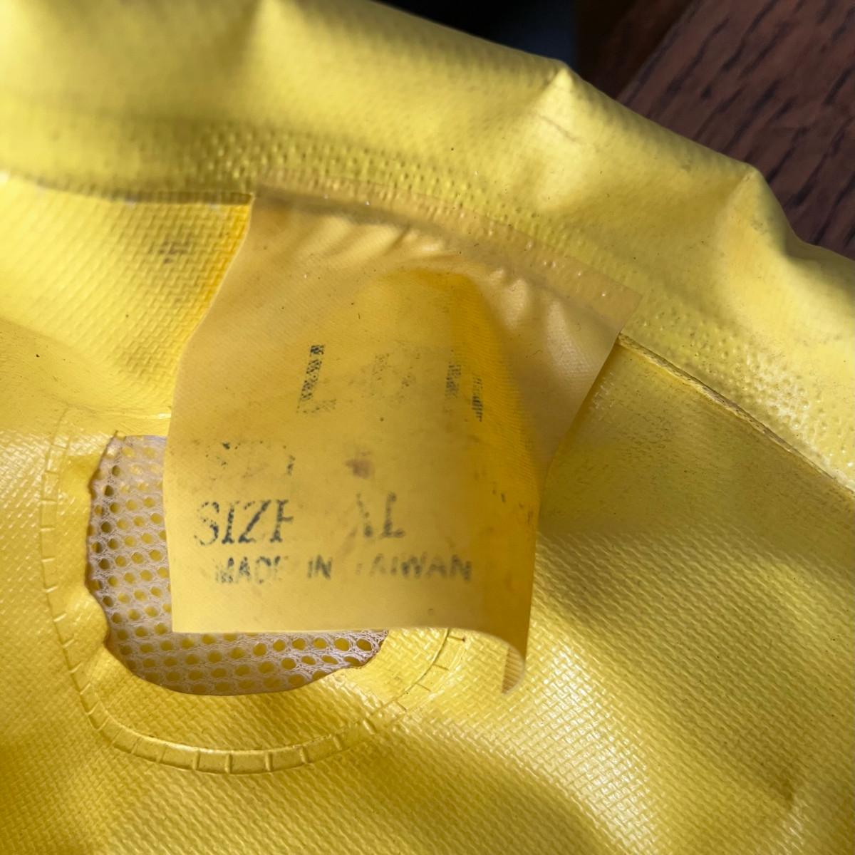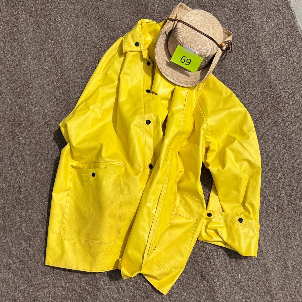 the hat is in good condition. The rain coat seems to be in good condition with the exception of being dirty. Faded Tag reads the size is XL