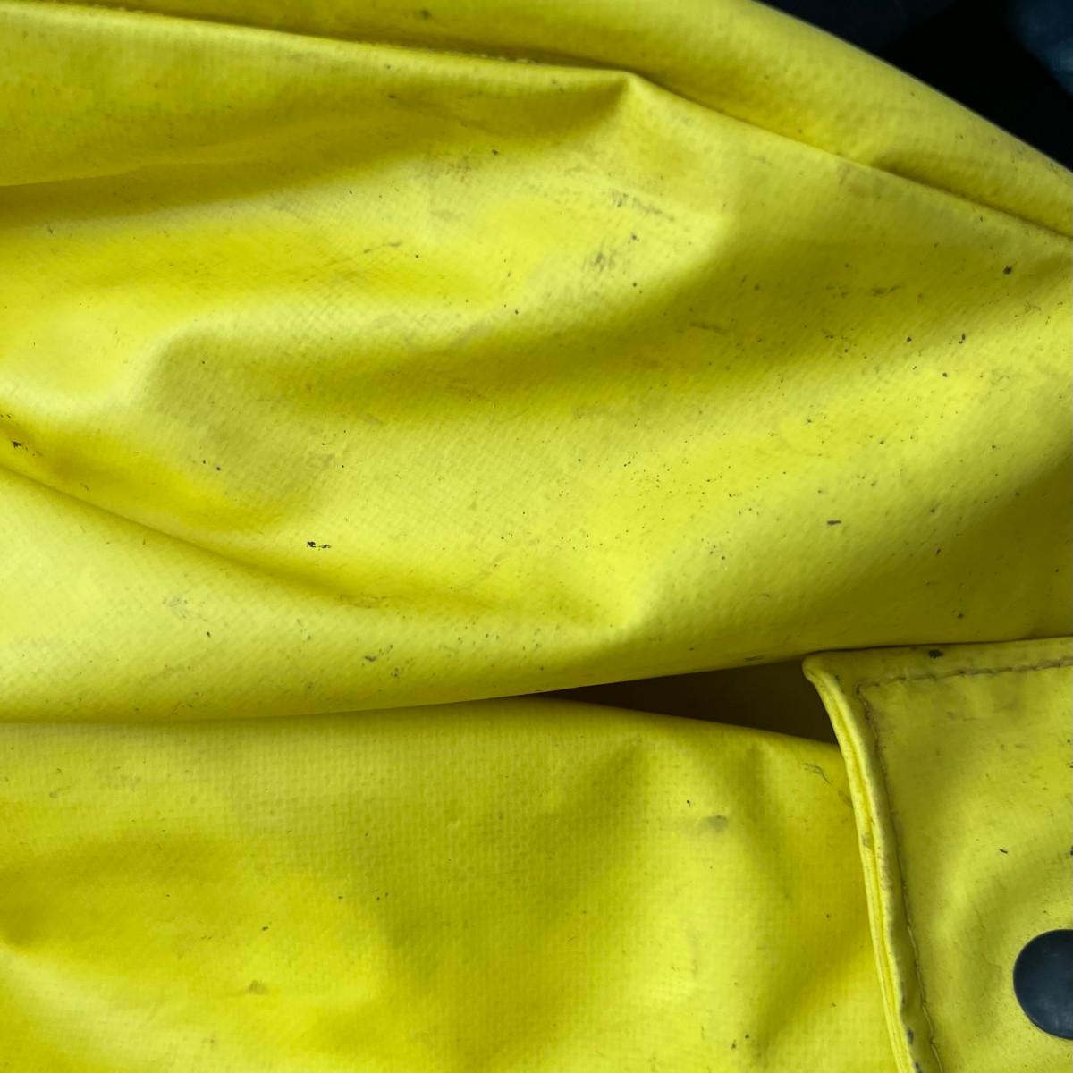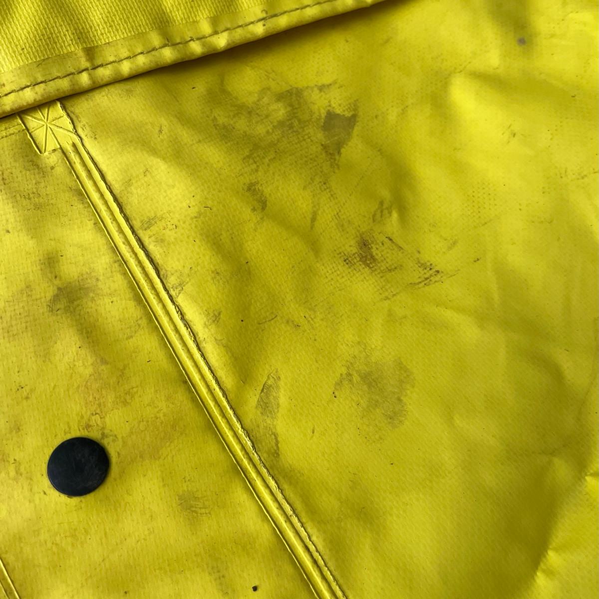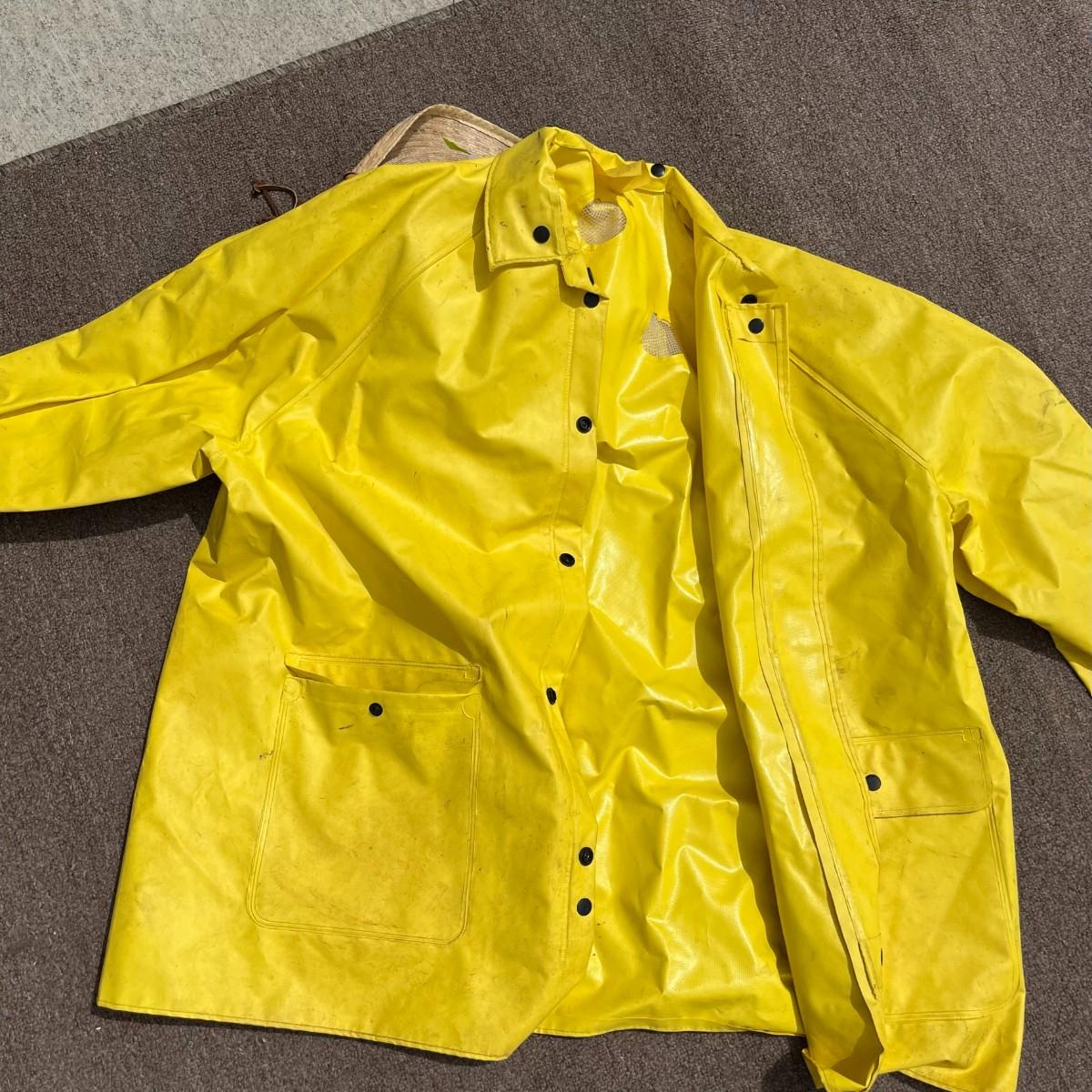 the hat is in good condition. The rain coat seems to be in good condition with the exception of being dirty. Faded Tag reads the size is XL