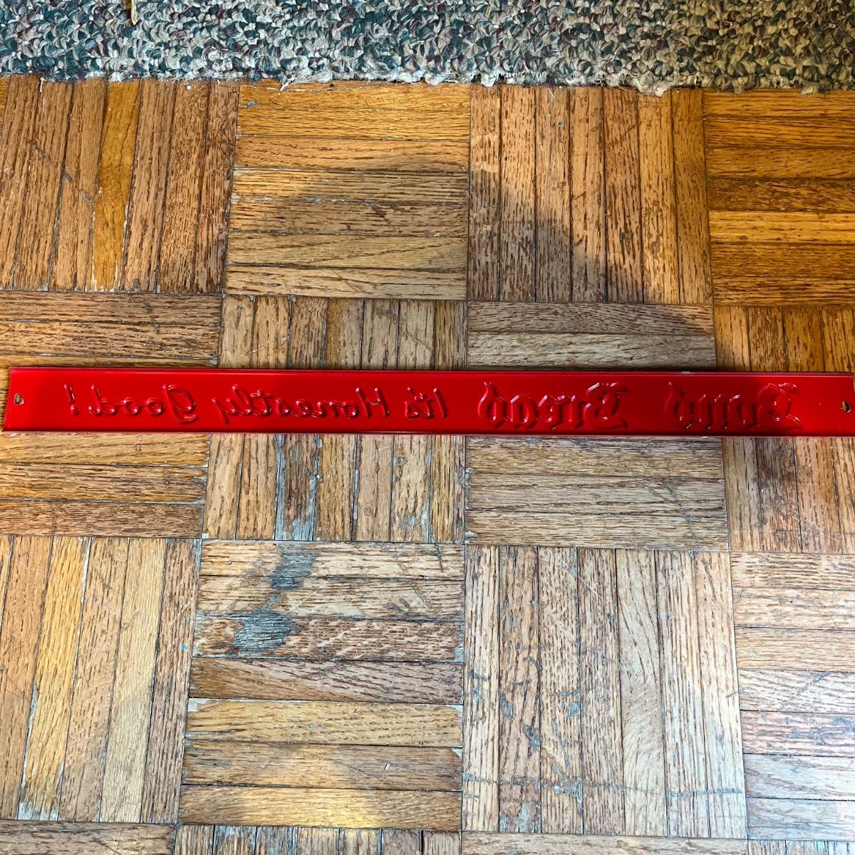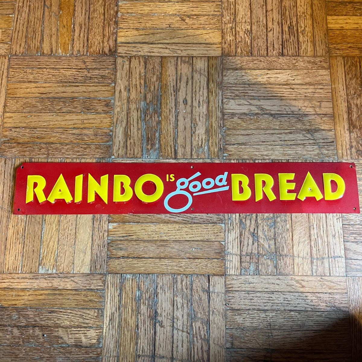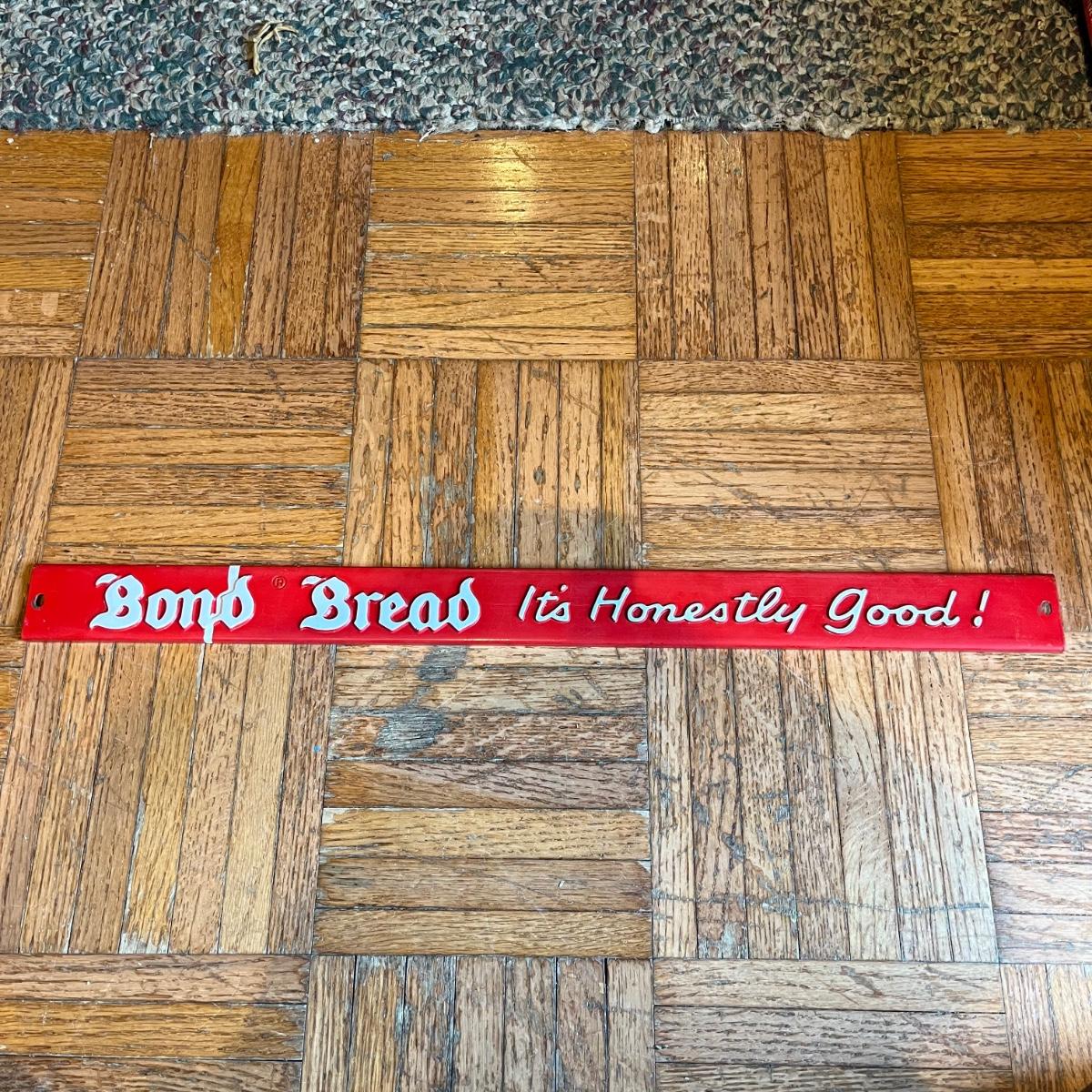 Lot includes a metal "Rainbo is Good Bread "door push, "Bond Bread It’s Honestly Good!" door push that appears to be enamel over metal and a "Red Rose Tea is good tea" metal sign. Bond door push measures 20” long.