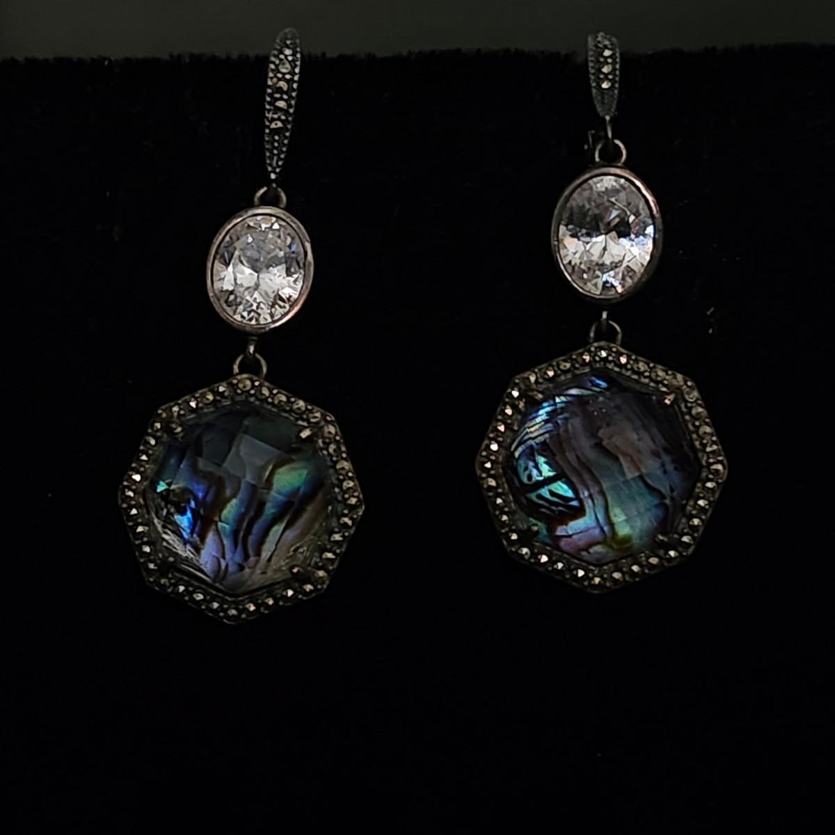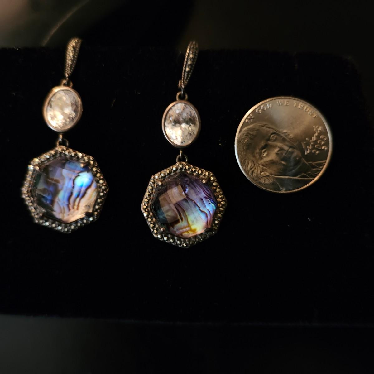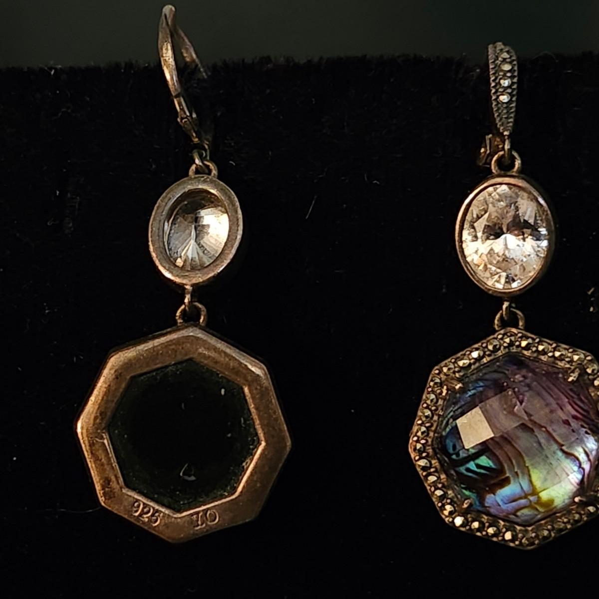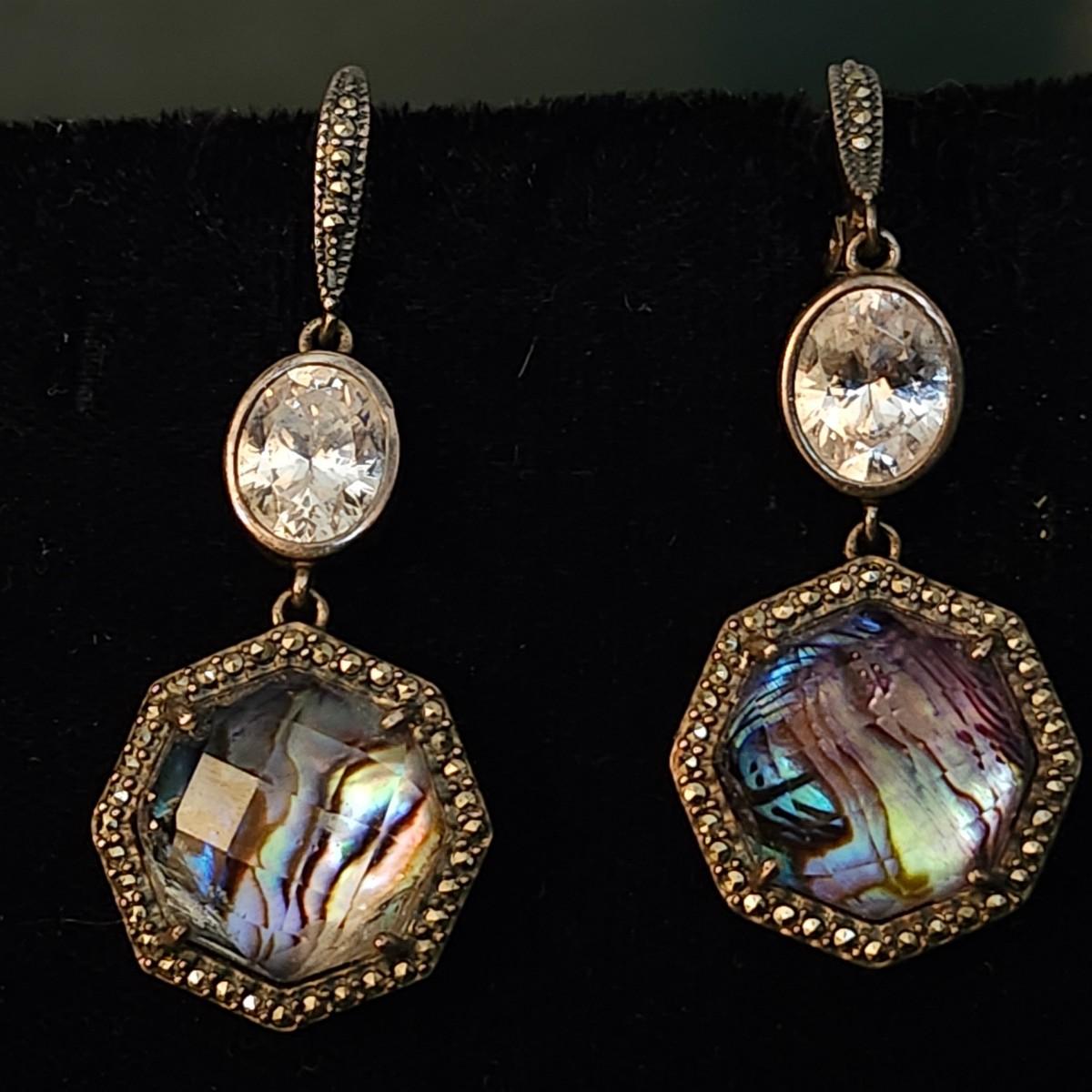 Vintage, Tourmaline Moonstone earrings, with lobster clasp closure. 925. Signed Roman numeral V O . Marcasite setting. These are amazing. Retail for like earrings are $225 to $300