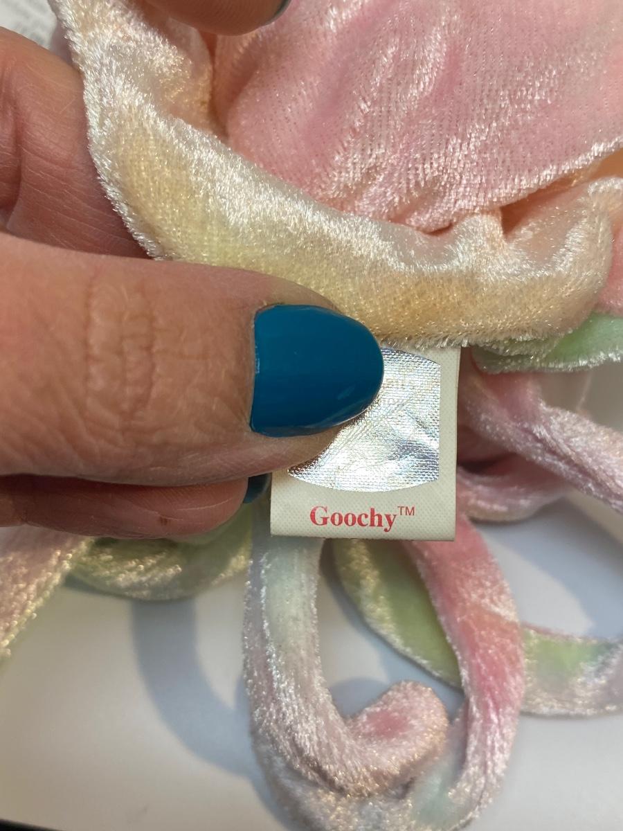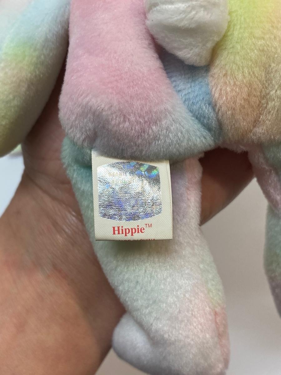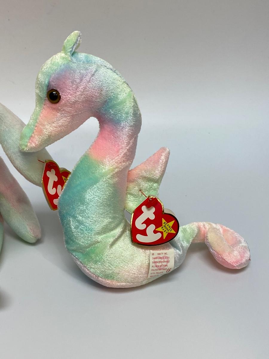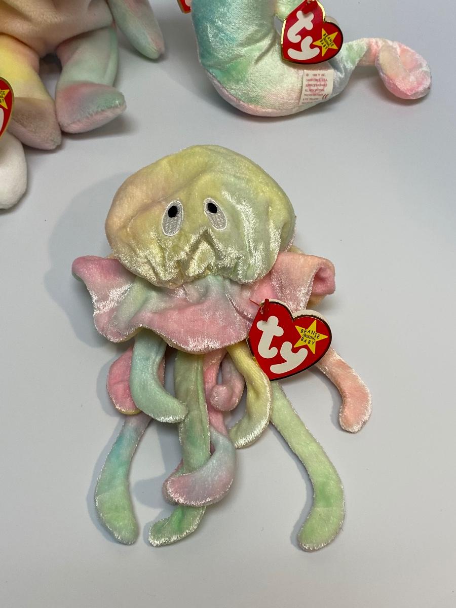 Set of 4 rainbow TY beanie baby plush. All have their original hang tags. Included is unicorn "Mystic", rabbit "Hippie", seahorse "Neon", and jellyfish "Goochy".