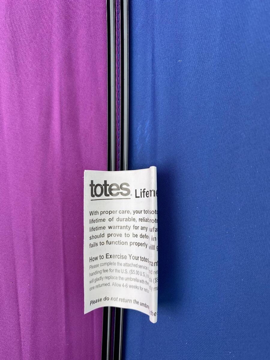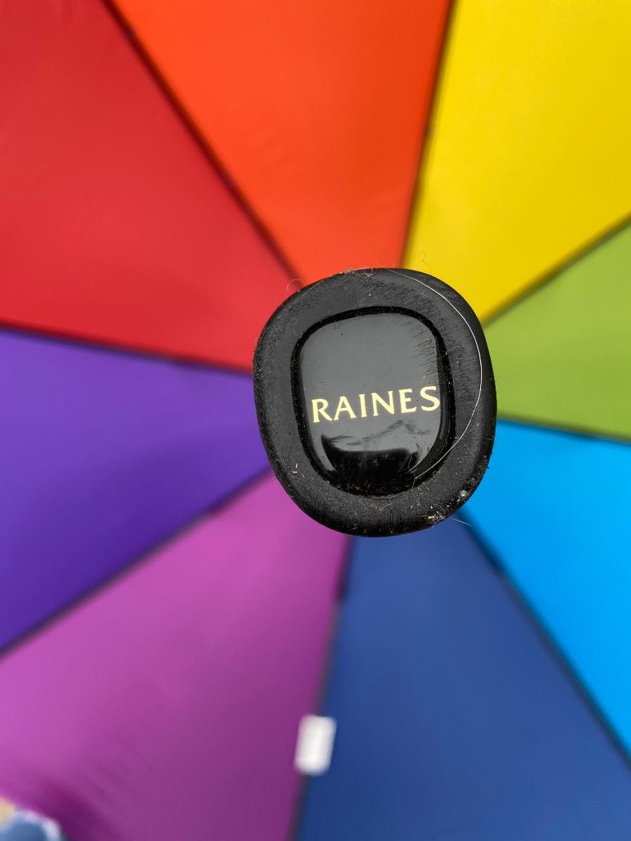 Raines Large Rainbow Colored Umbrella, there is no ripping or damage to the canvas or handle and is in good useable condition. The rubber handle is a little tacky from age. Check pictures for more details.