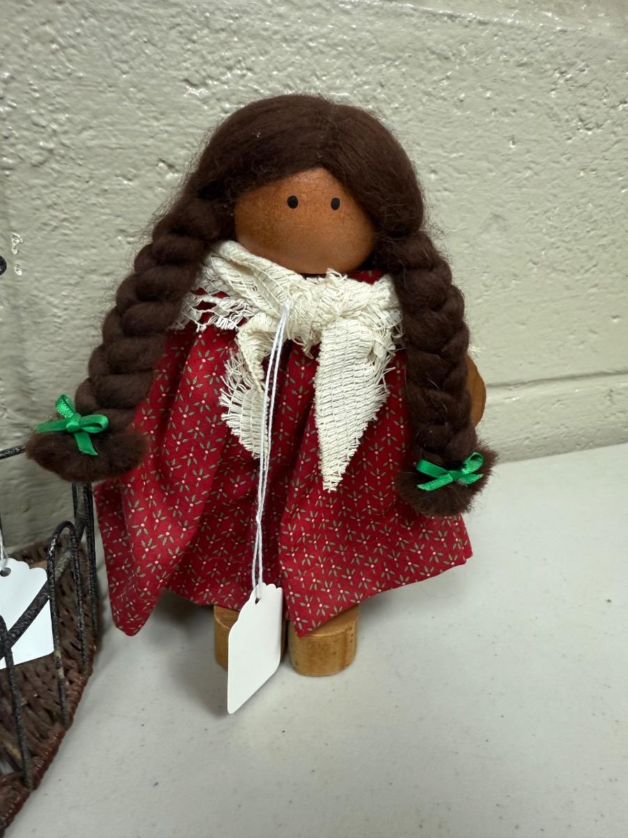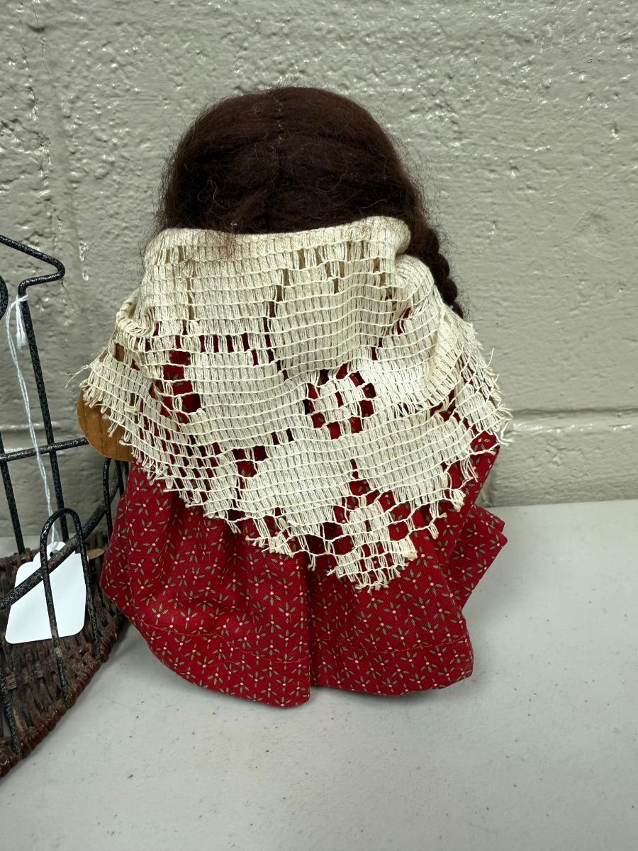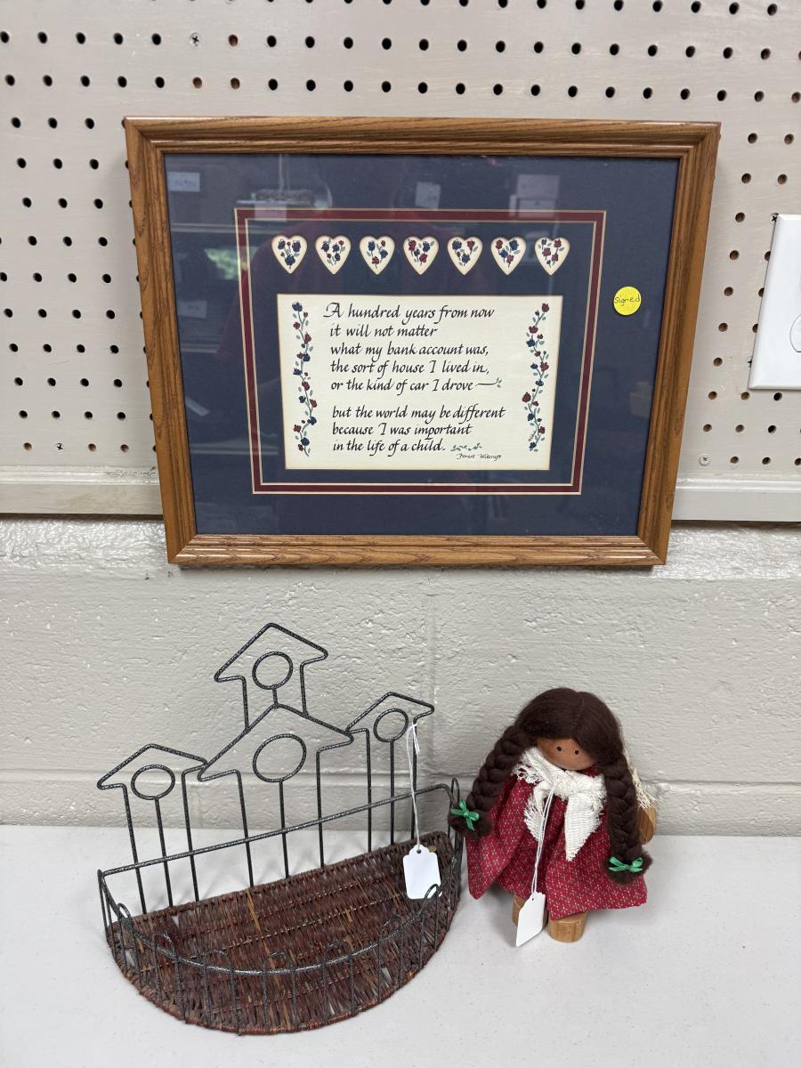 Framed art signed, handmade wooden doll, wall or countertop basket