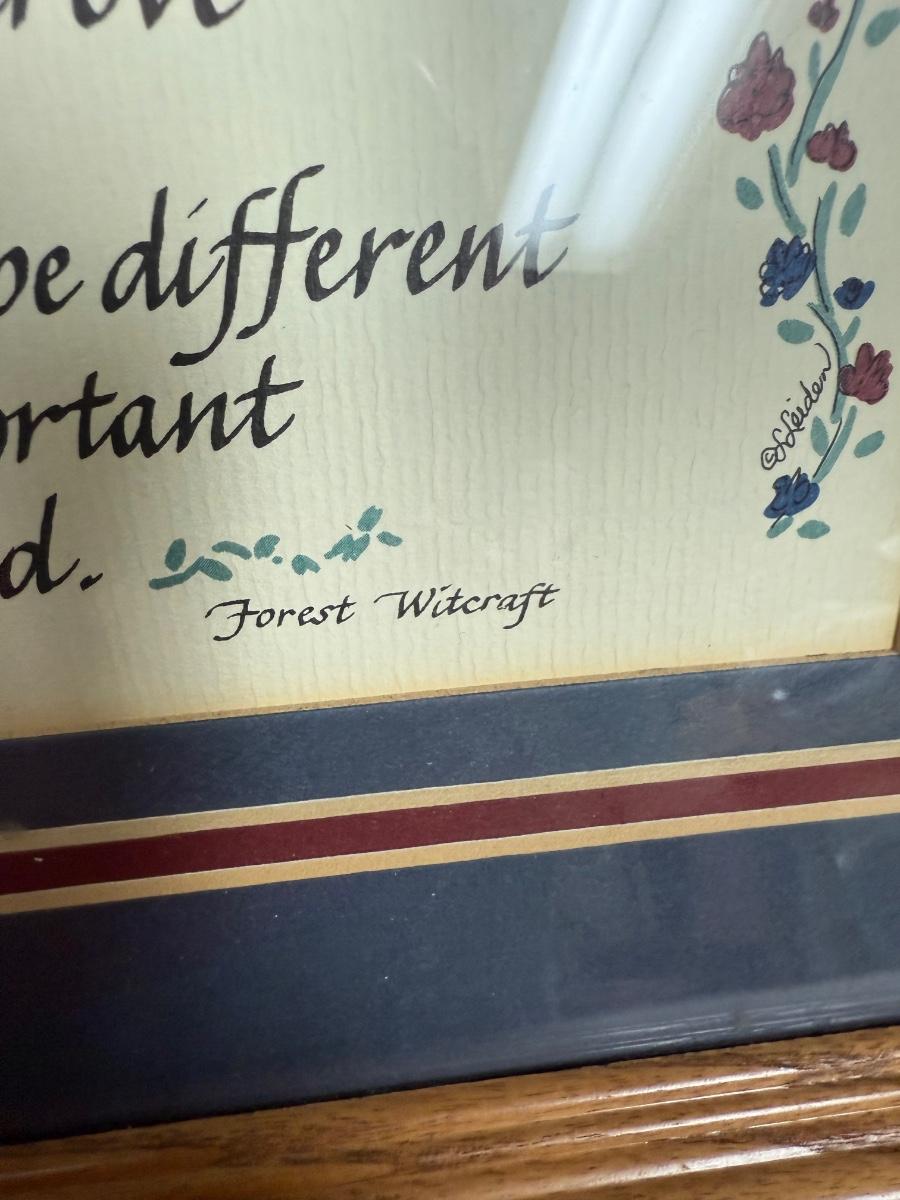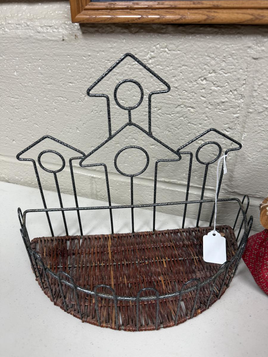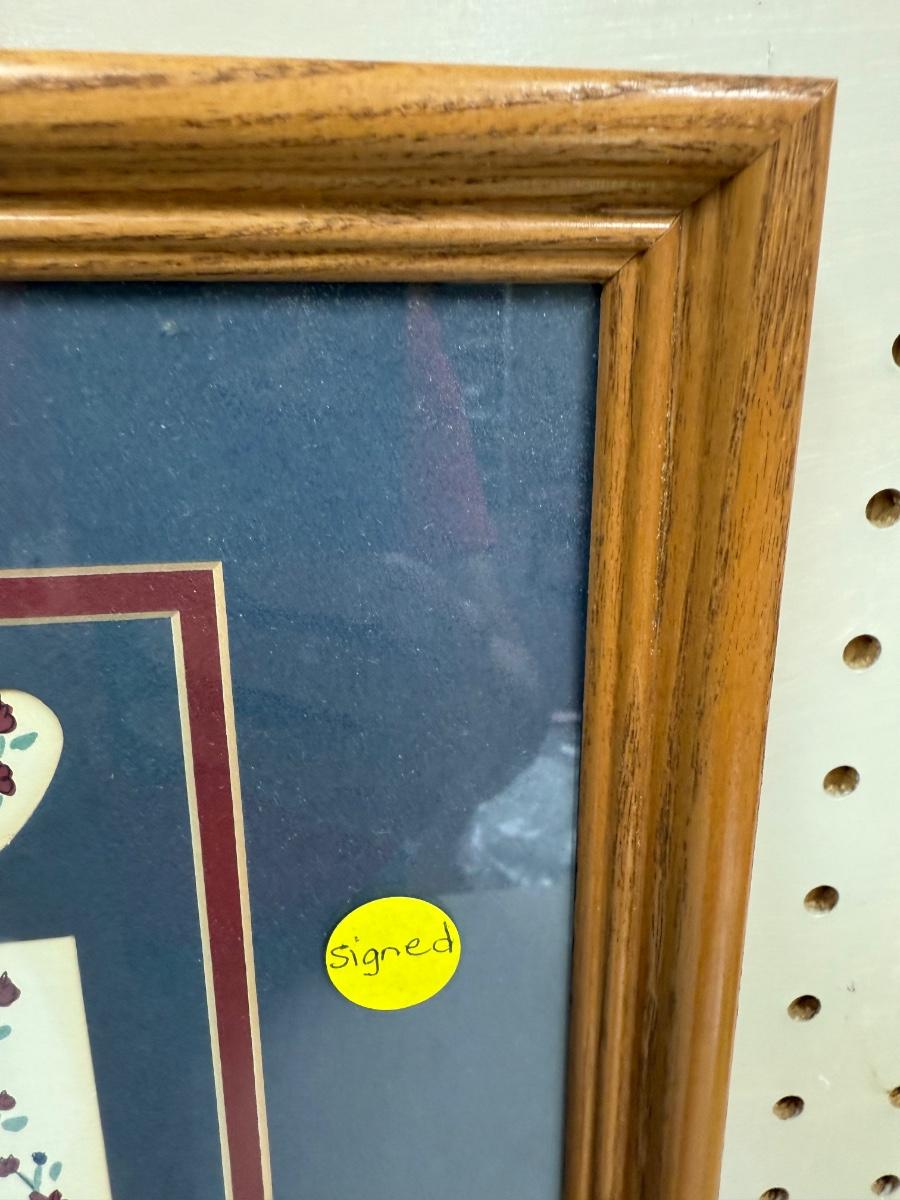 Framed art signed, handmade wooden doll, wall or countertop basket