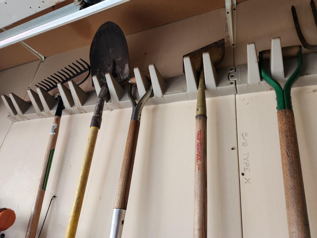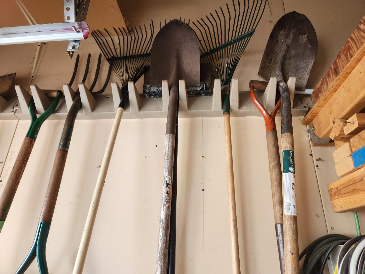 Rakes shovels ice scrapers and a pitch fork.
