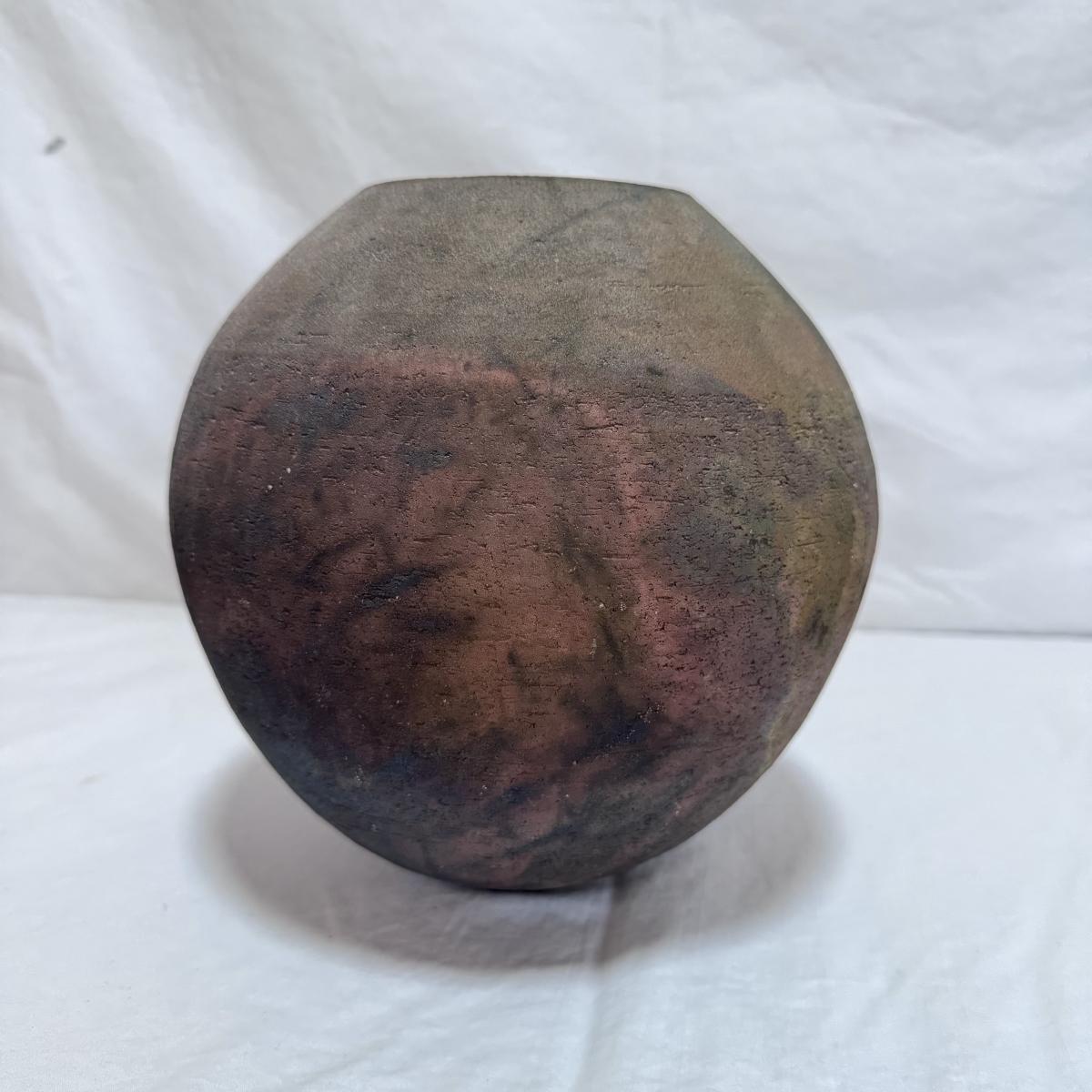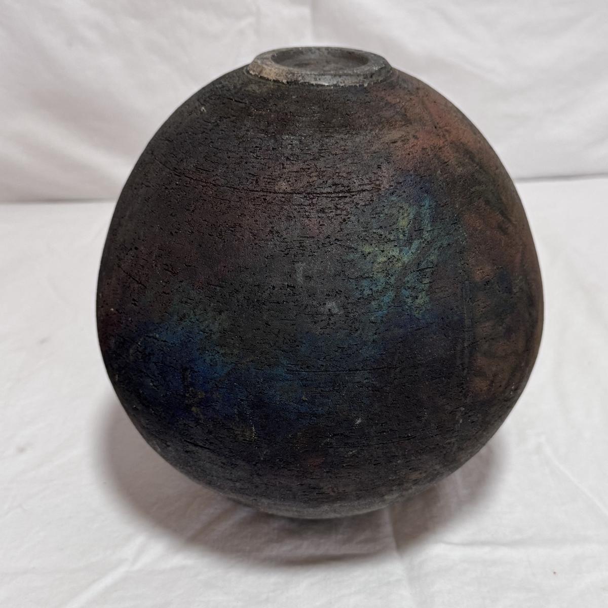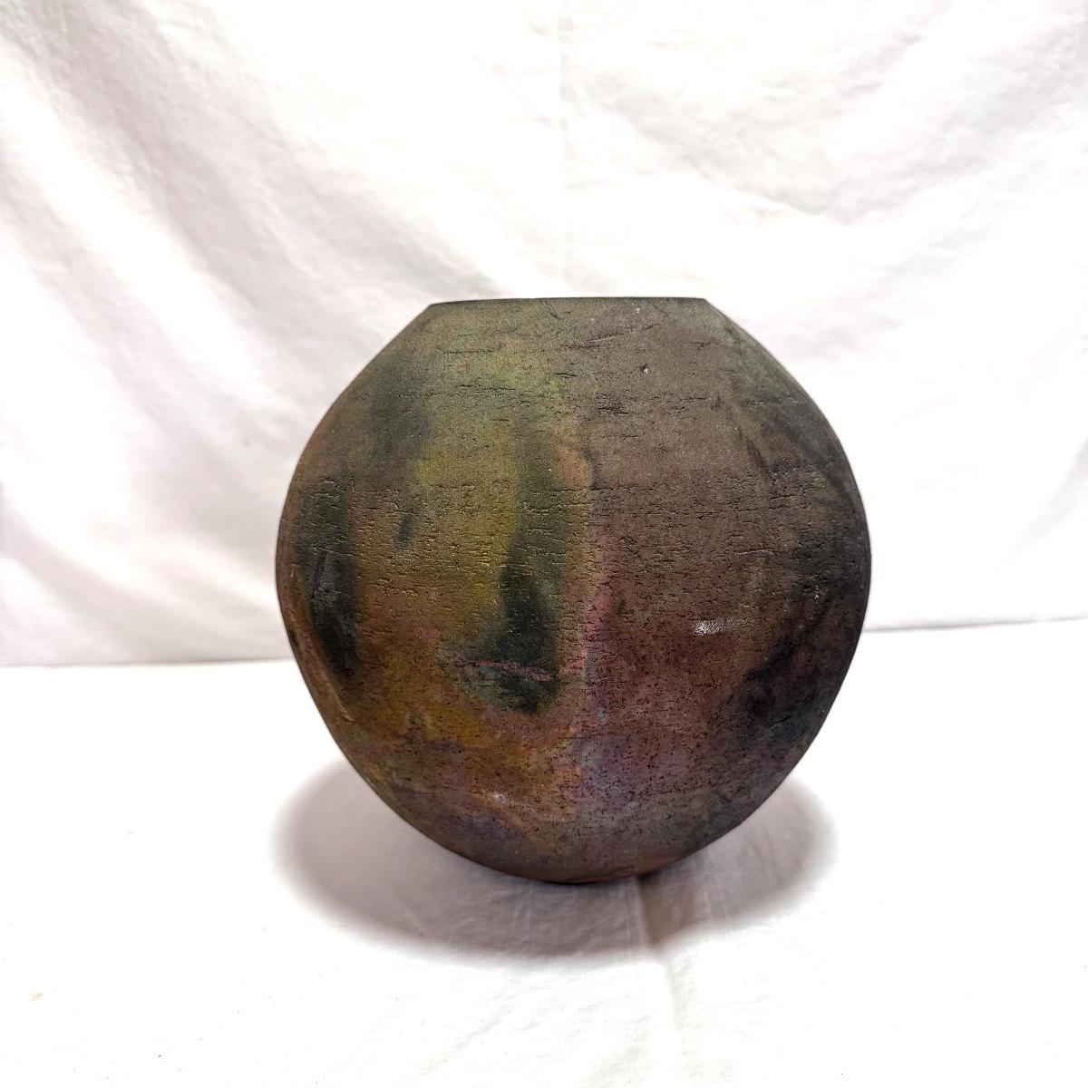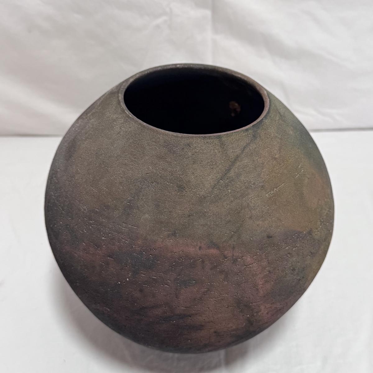 This lot includes one beautiful Raku fired pottery vase. The ceramic vase has several shades of earth-tones and is signed on the bottom - see pictures. The vase measures 8”D x 8”H. Shipping available.