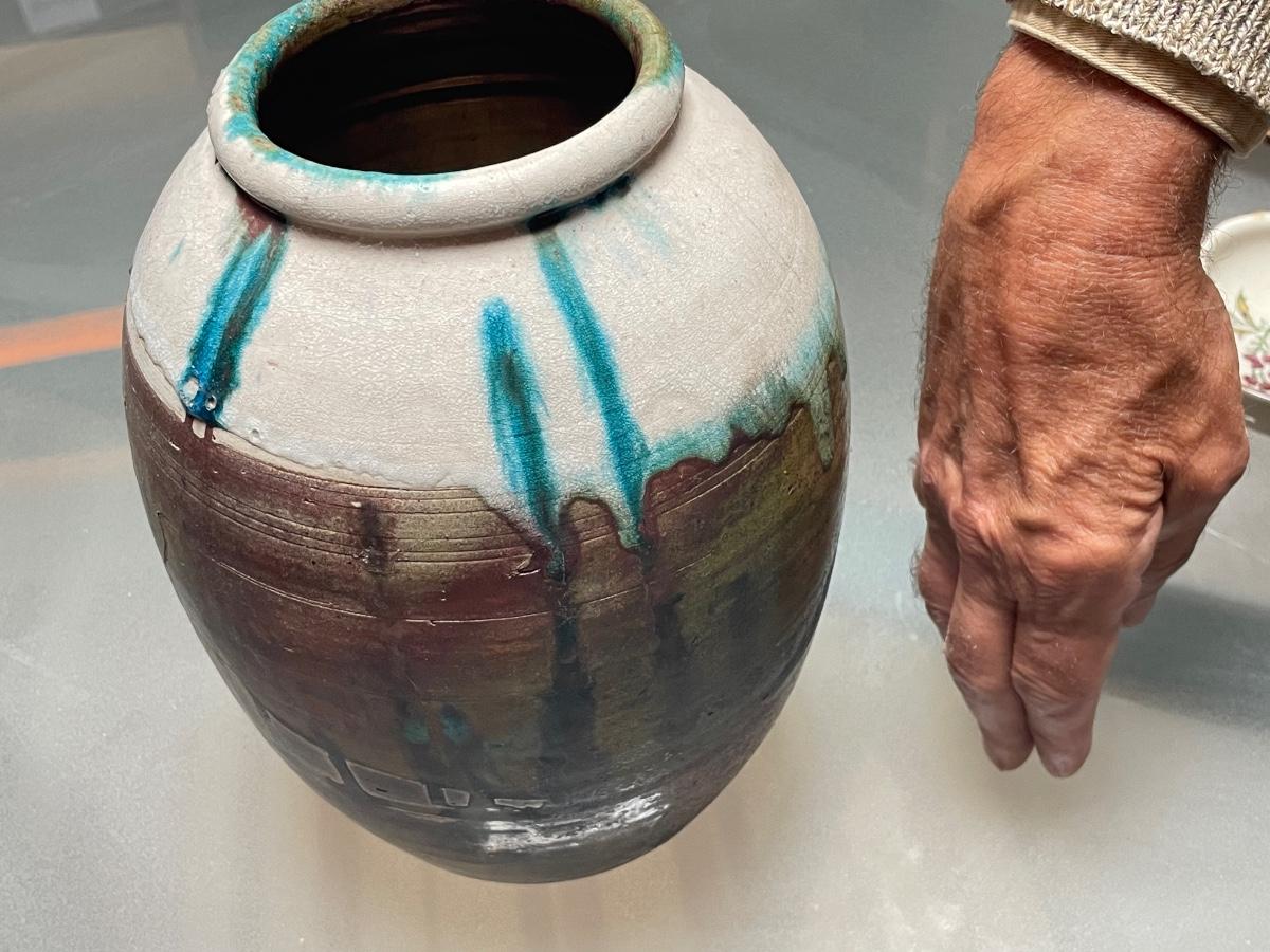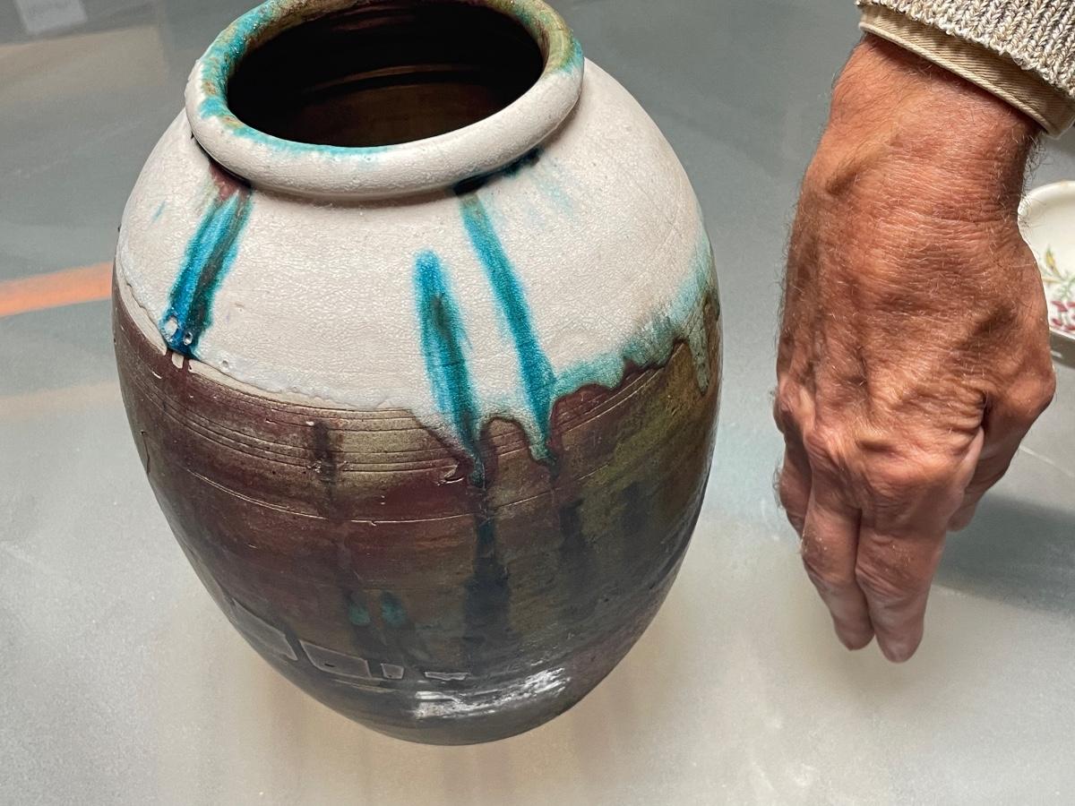 RAKU GLAZED VASE w/ BLUE DRIPS -