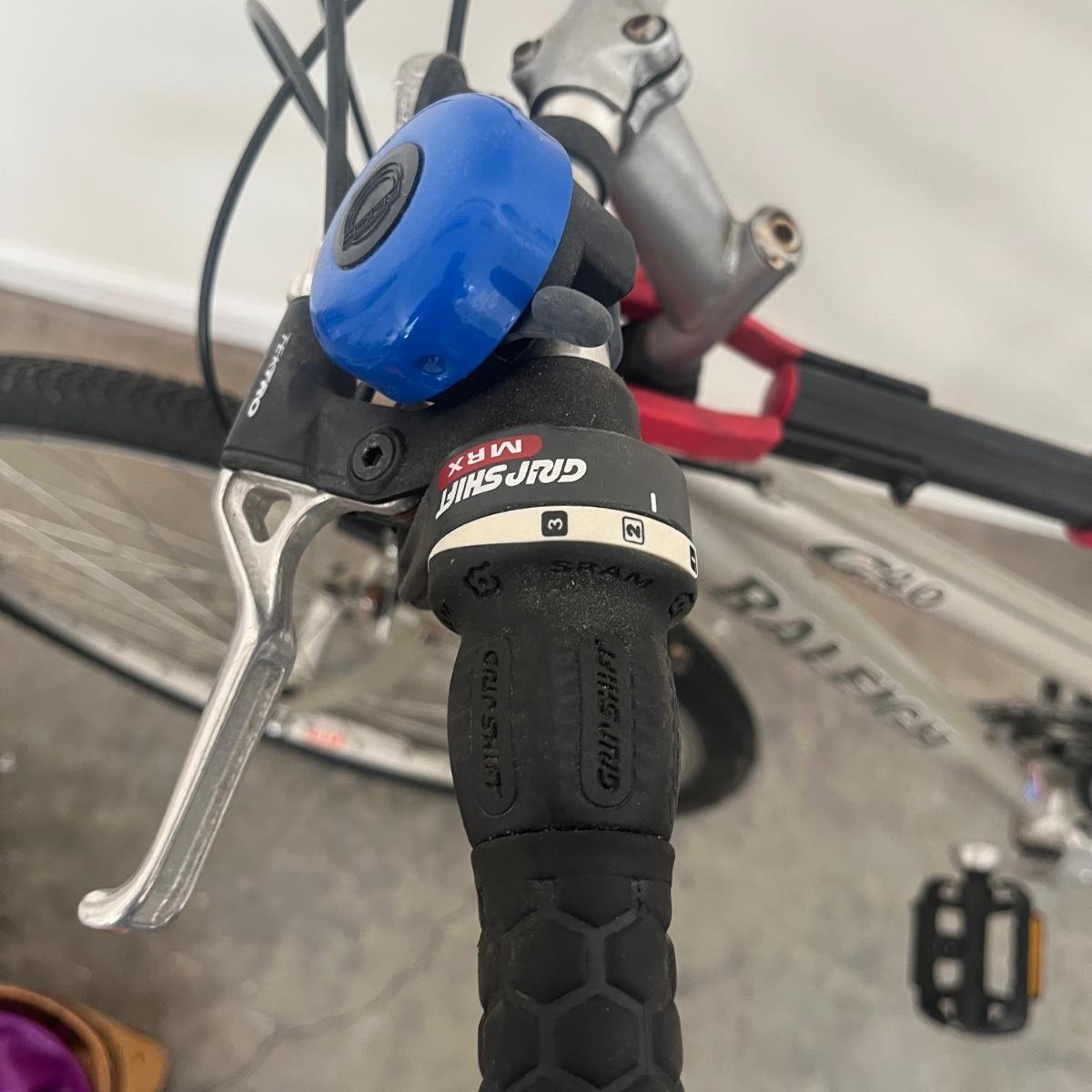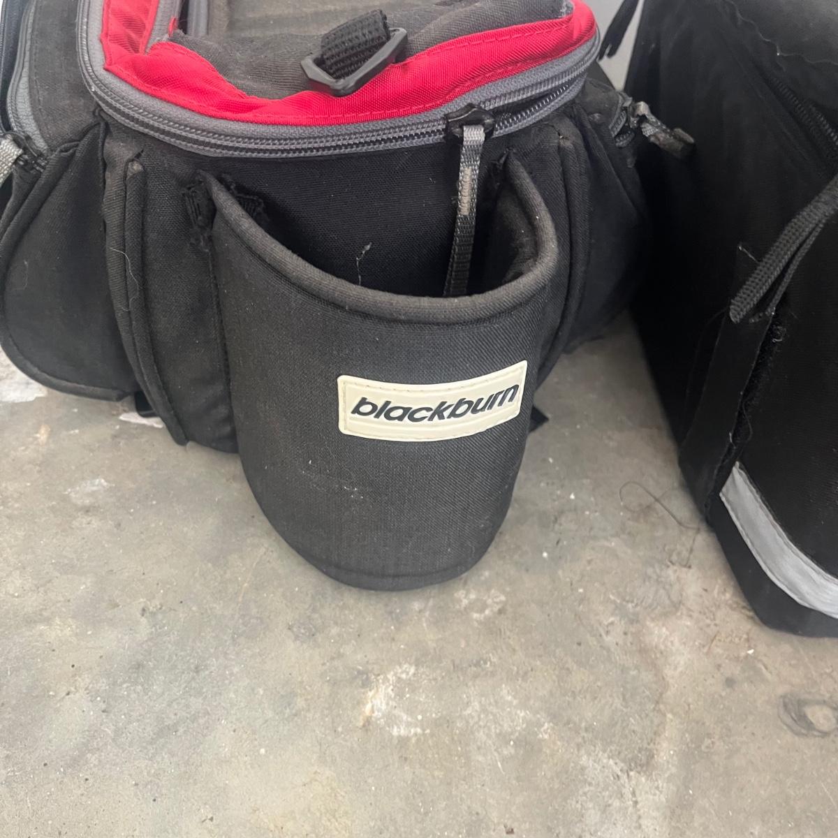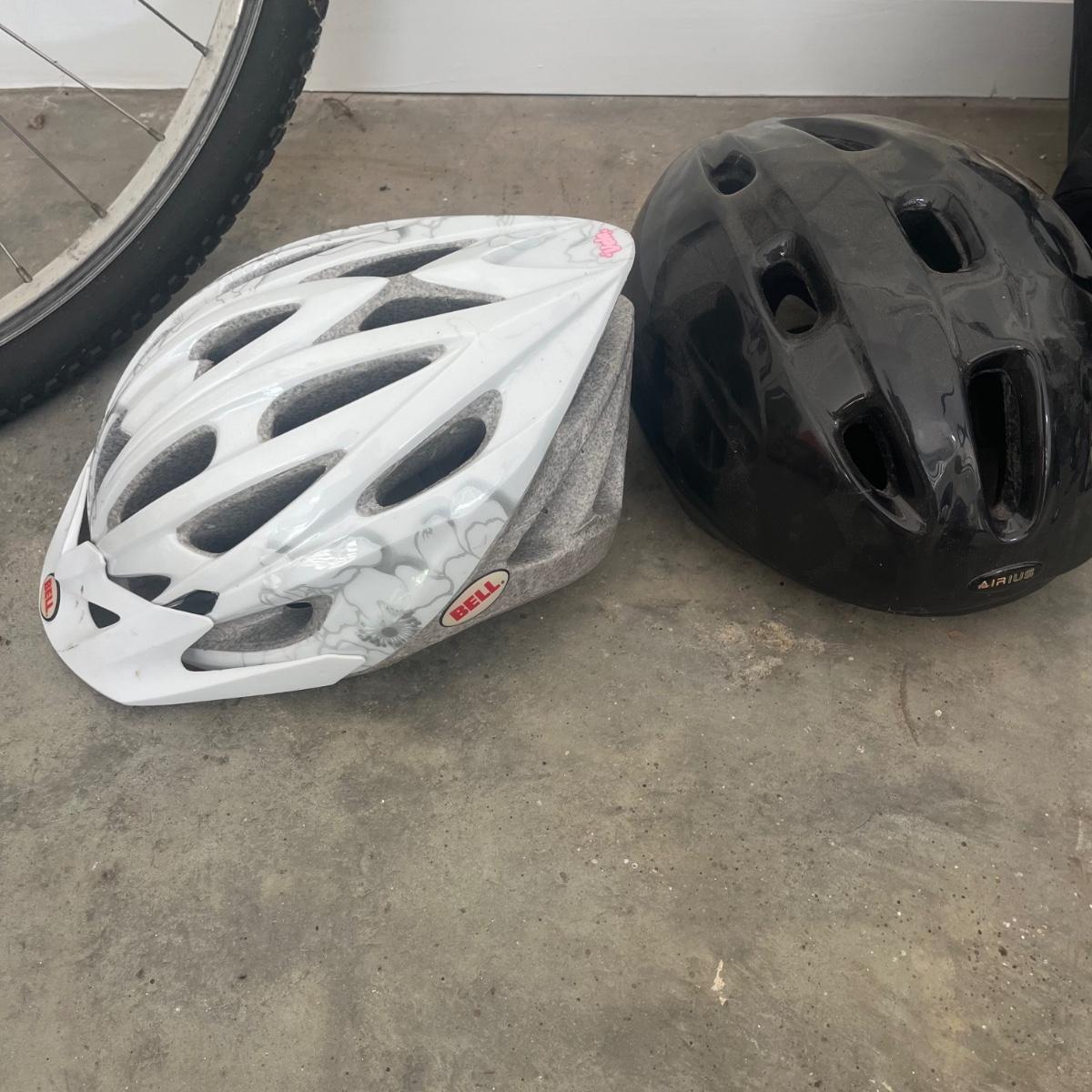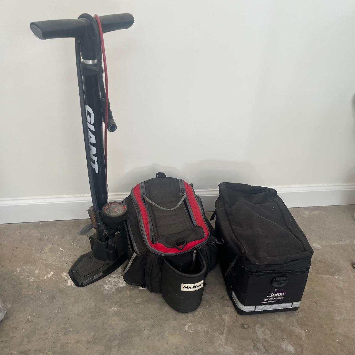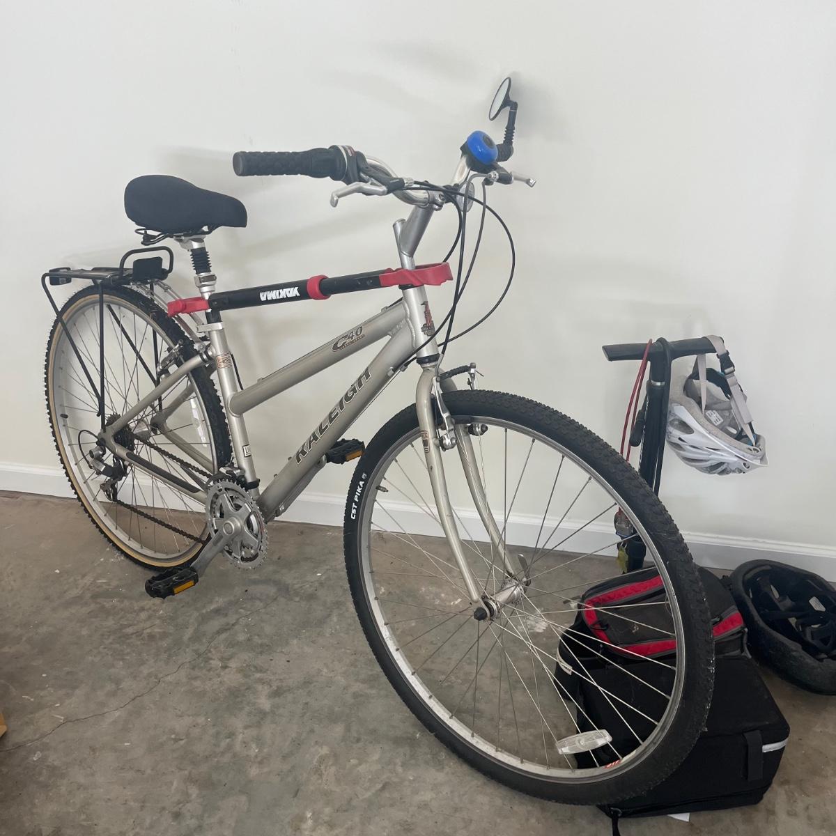 Lot includes a Raleigh C40 hybrid 21 speed bicycle with Shimano gears , Tektro brakes, bell, rack and quick release wheels. Also includes Giant pump two bicycle helmets and a Blackburn and Jandd rack bag. Down tube measures 22”.