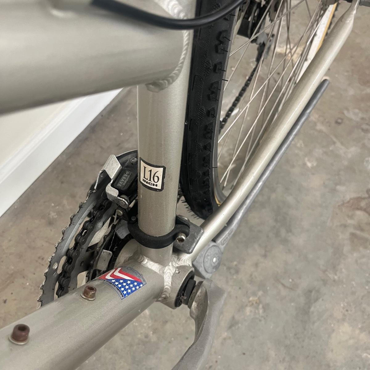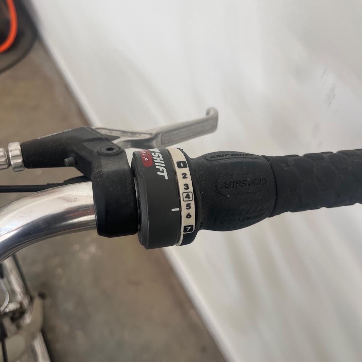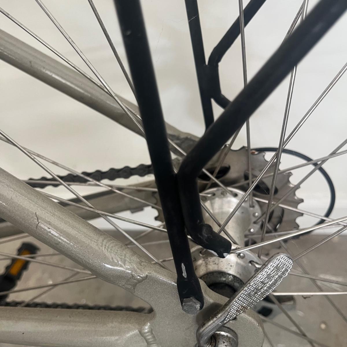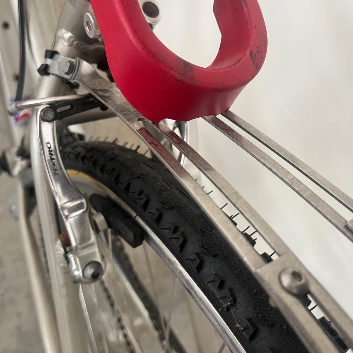 Lot includes a Raleigh C40 hybrid 21 speed bicycle with Shimano gears , Tektro brakes, bell, rack and quick release wheels. Also includes Giant pump two bicycle helmets and a Blackburn and Jandd rack bag. Down tube measures 22”.