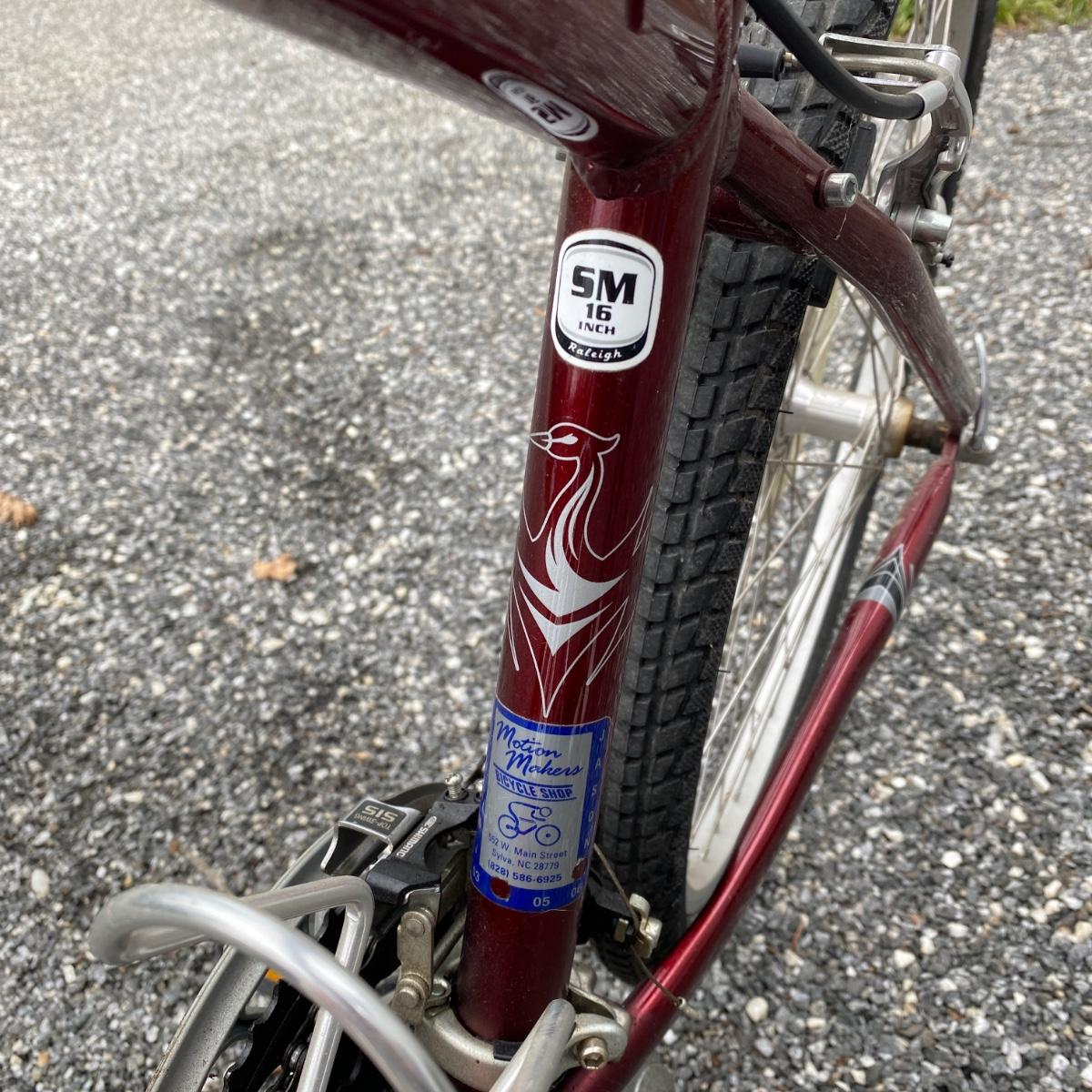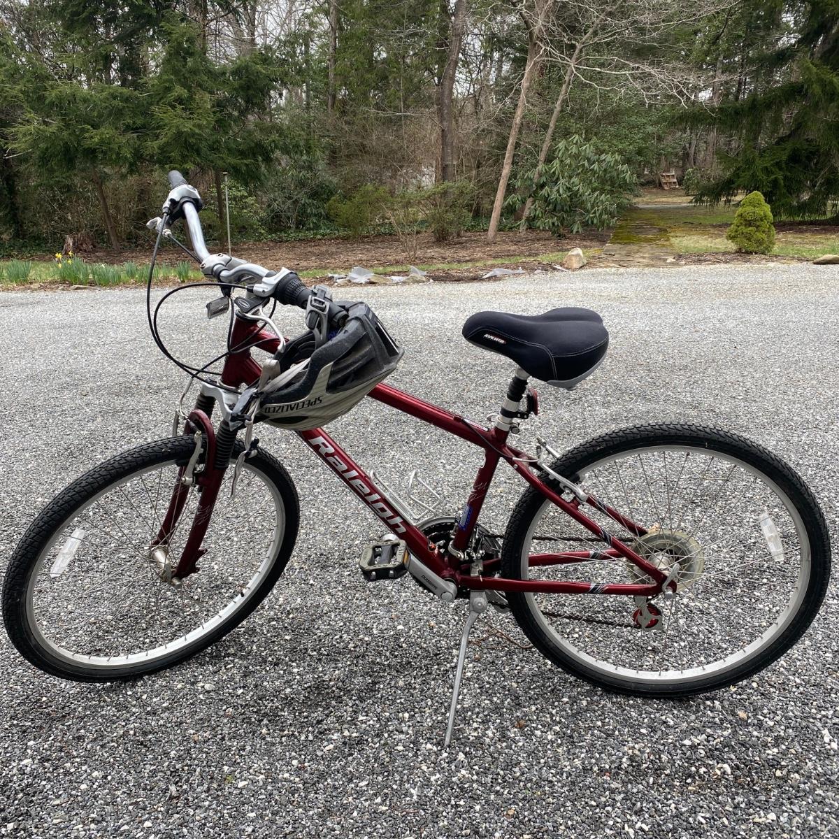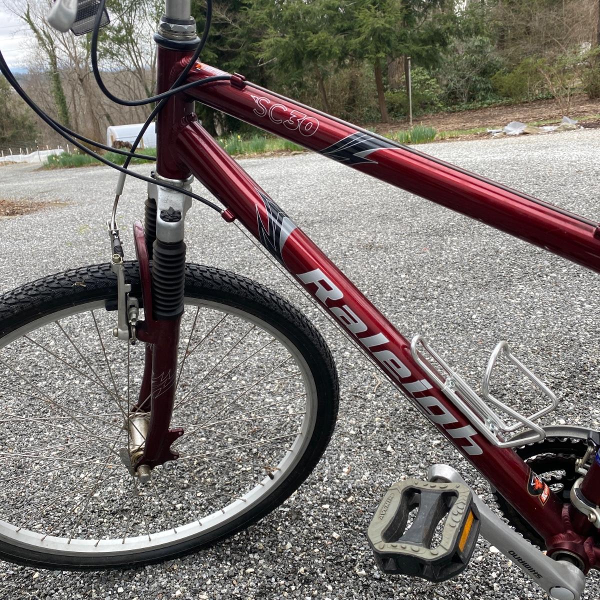 Raleigh Mountain bike with front suspension. Size Small 16in. Model SC30. Has many Shimano parts and shifter handles. See pictures.. Comes with Specialized helmet. Has a sticker from “˜07 in helmet and we can’t guarantee the safety of a used helmet. Local pick up only.