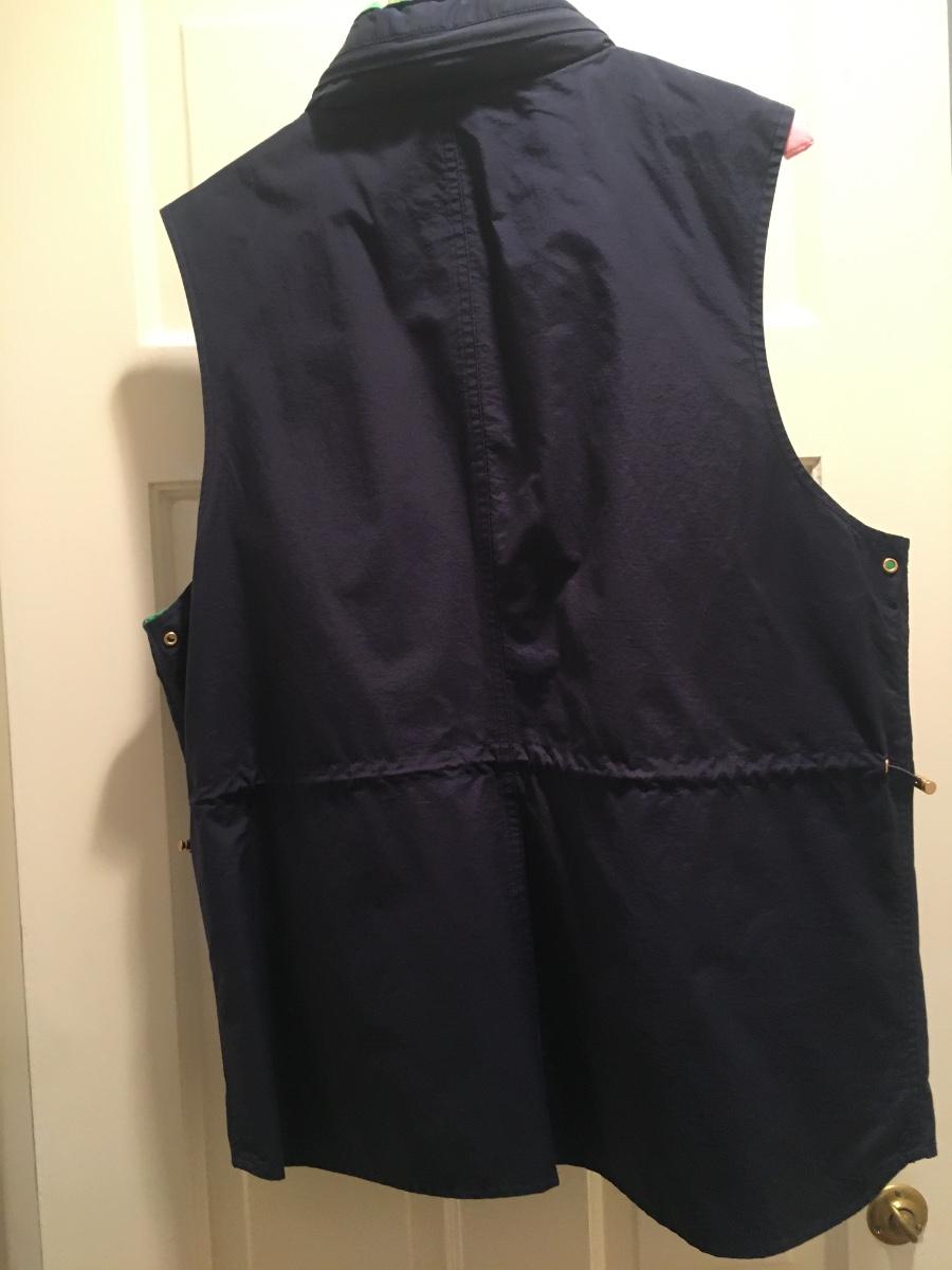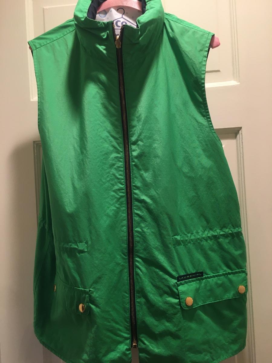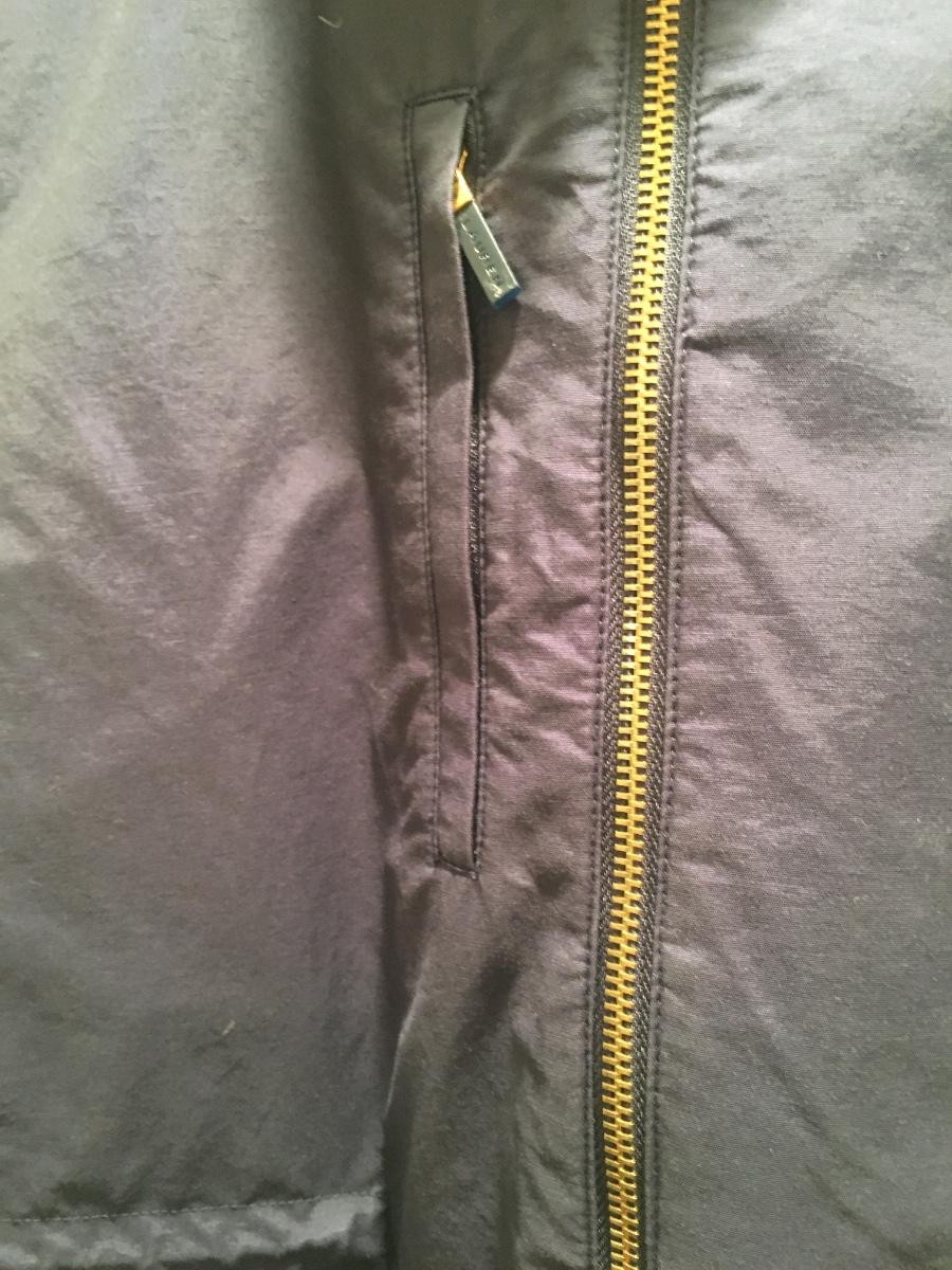 Zipper front, has hidden hood in collar. Lots of pockets.