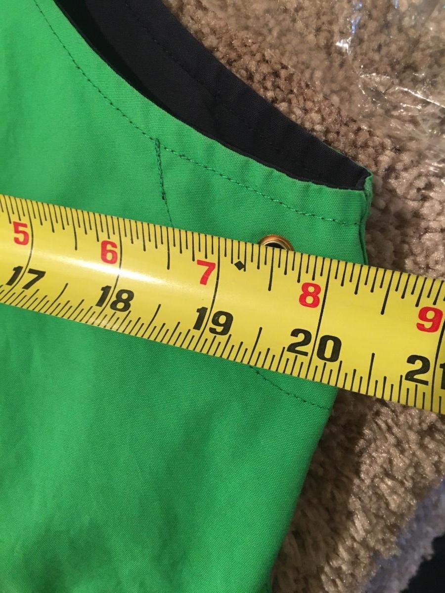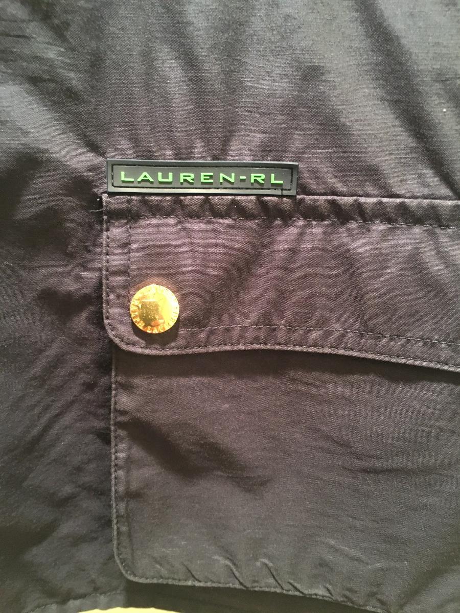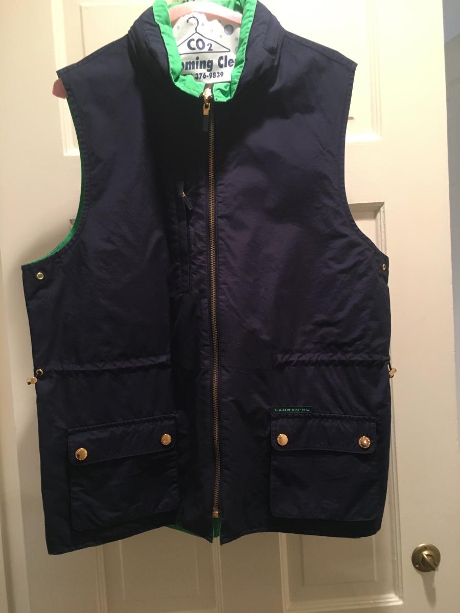 Zipper front, has hidden hood in collar. Lots of pockets.