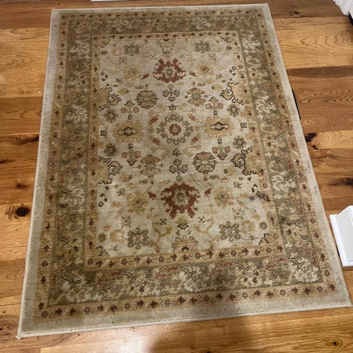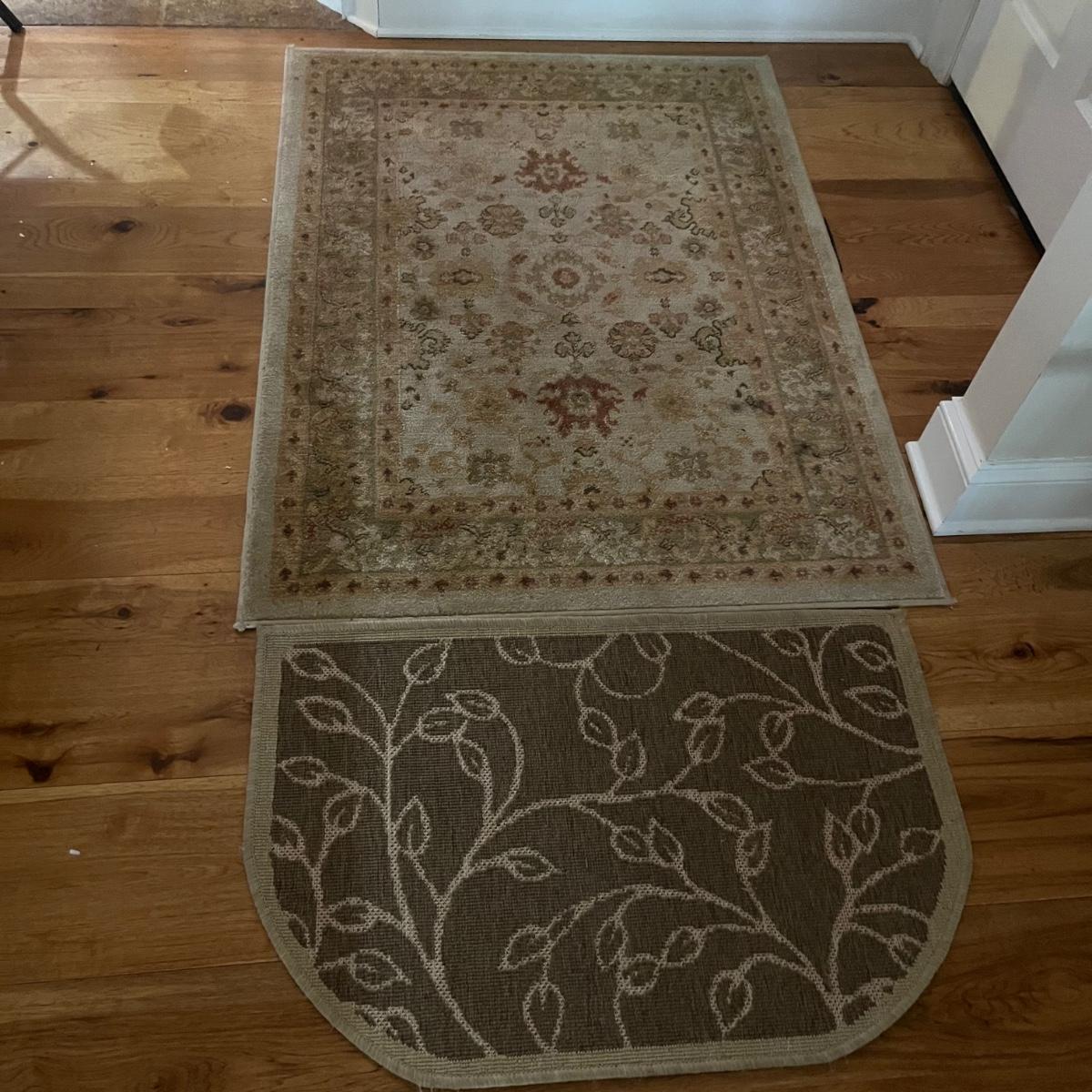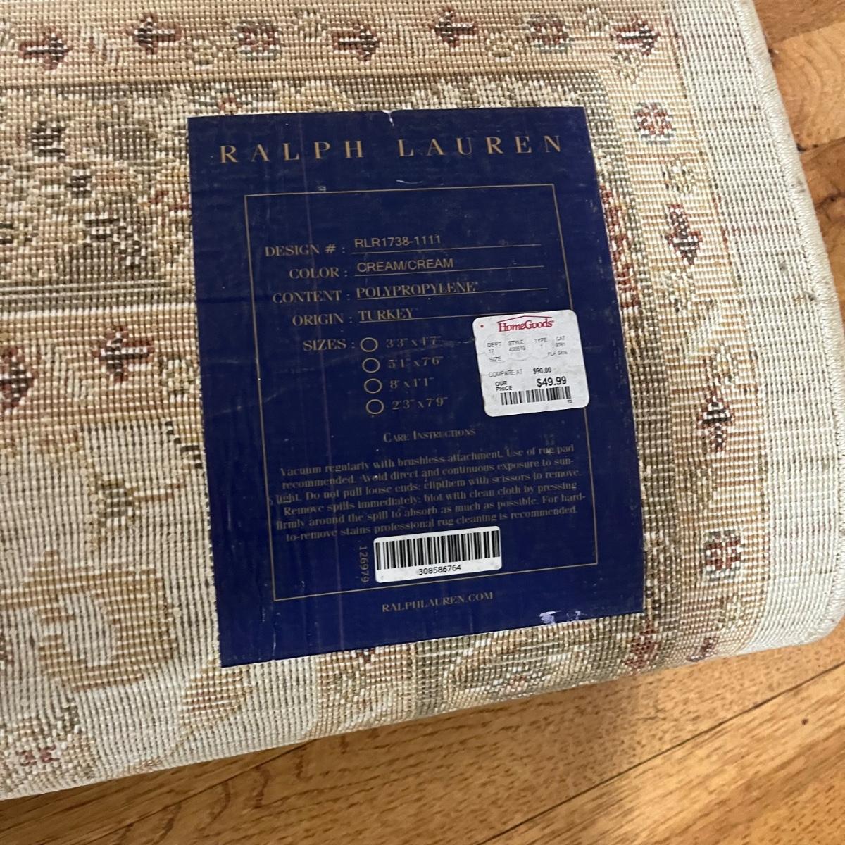 Lot includes a Ralph Lauren area rug that measures 50” x 54” and a door mat. Rug could use a cleaning.