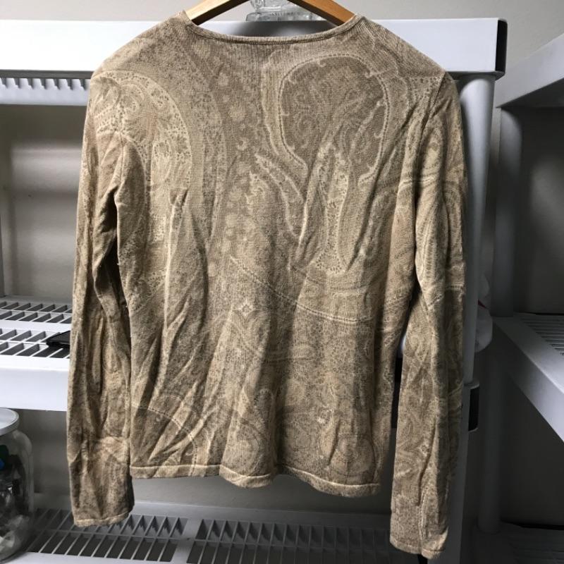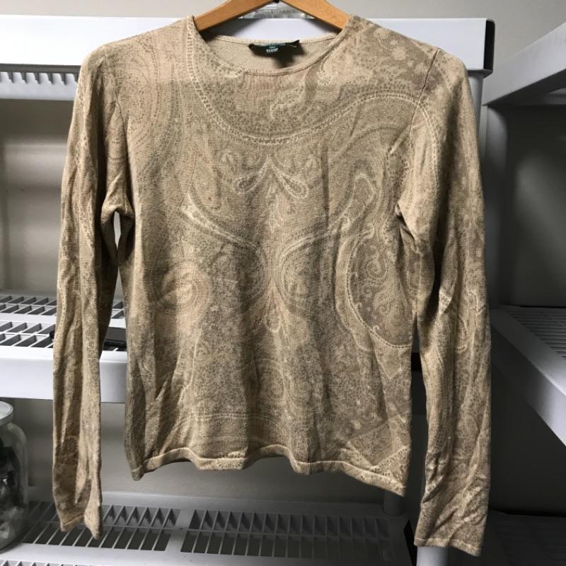 Up for auction is a light brown, paisley, pull over sweater by Ralph Lauren. It is a size petite-medium. In excellent used condition; see pictures.