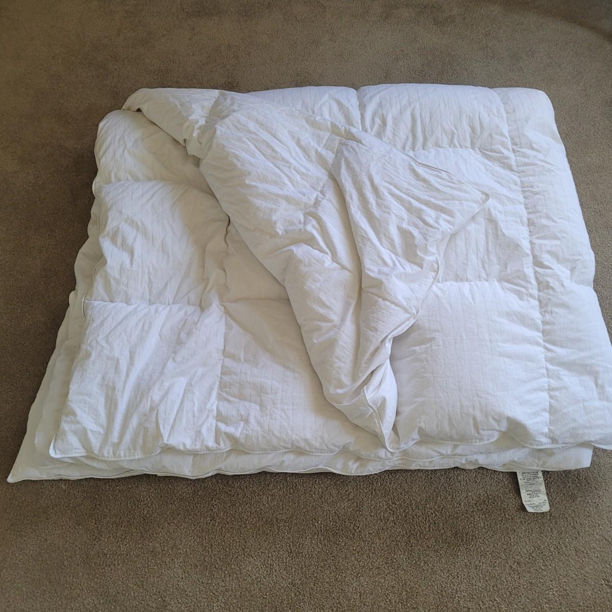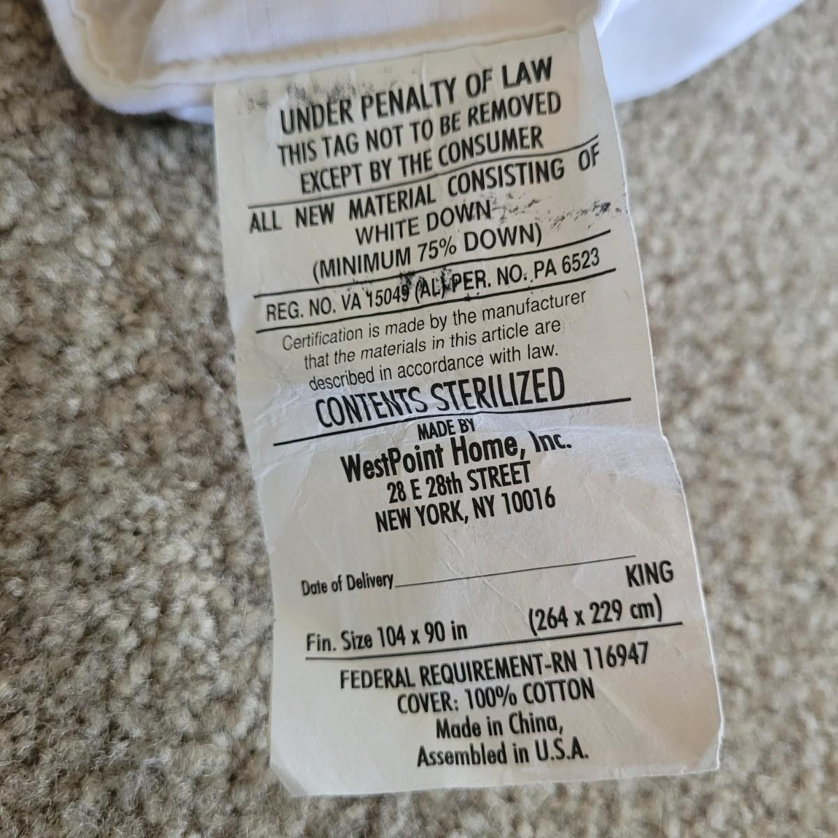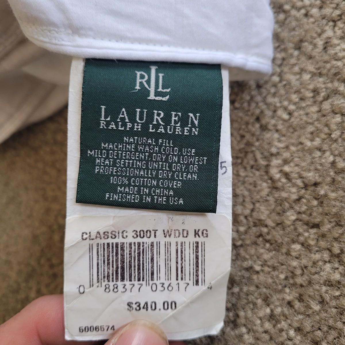 Ralph Lauren brand white down comforter. Comforter measures 104" x 90" (king sized). Contains 75% natural down. Cover is 100% cotton. Machine washable.