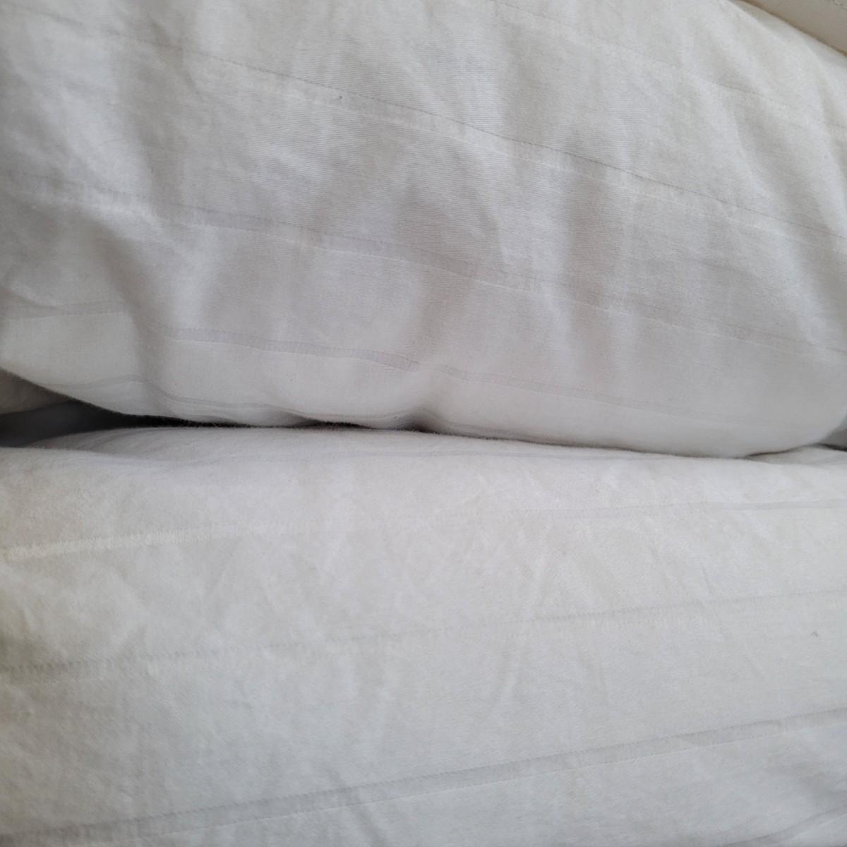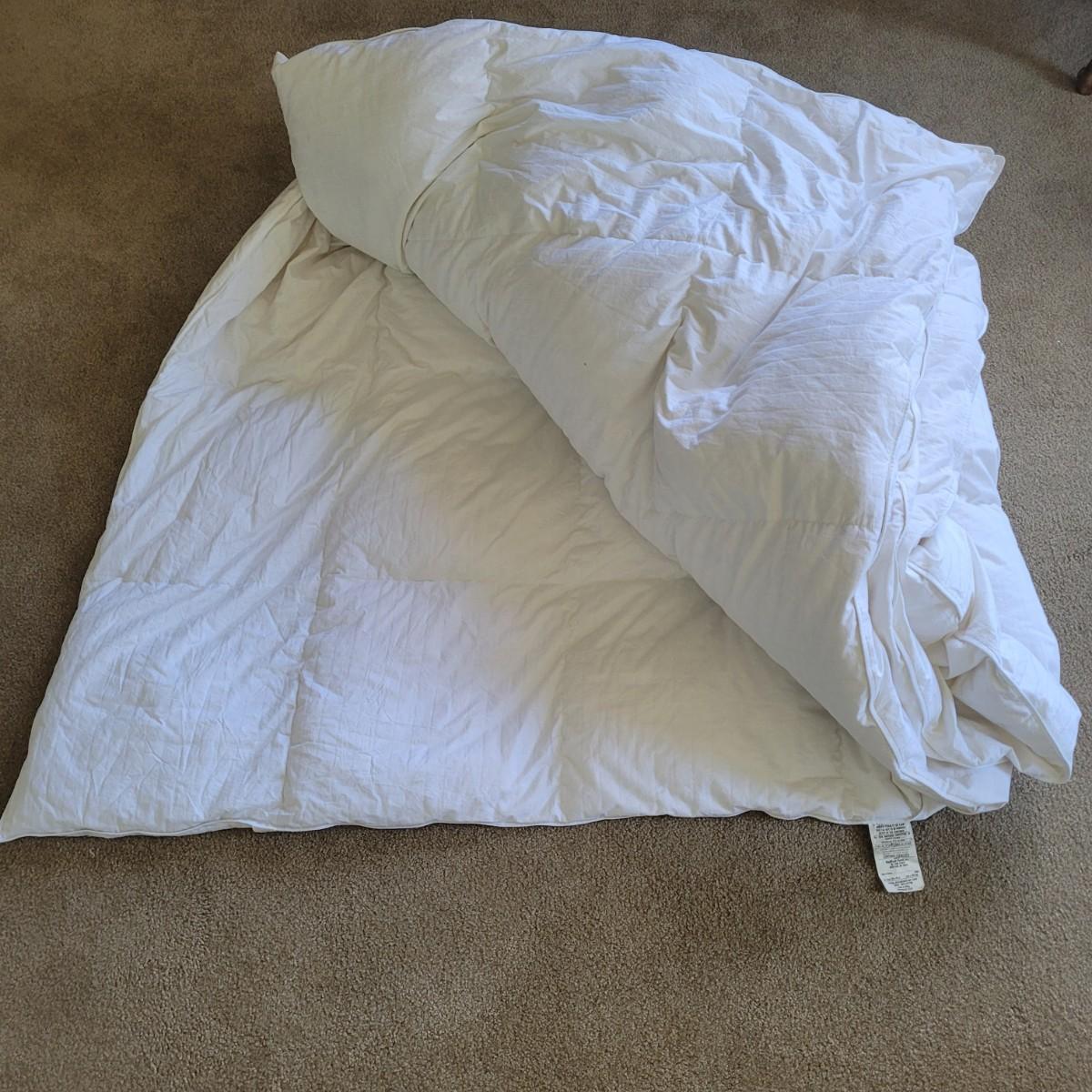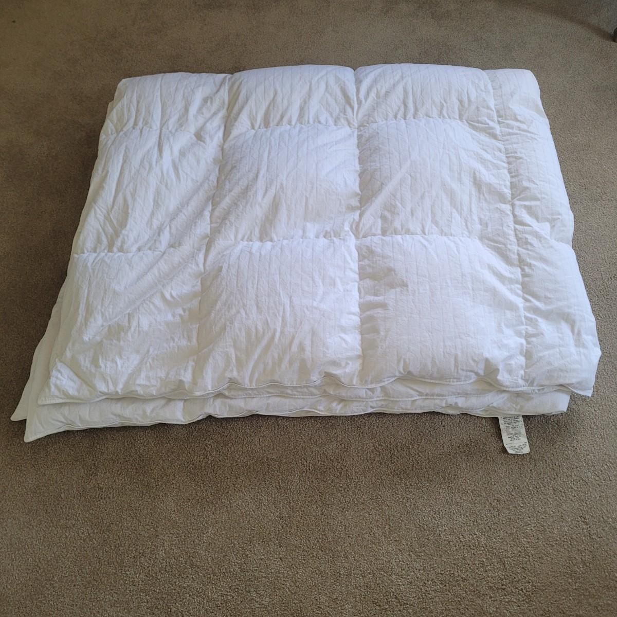 Ralph Lauren brand white down comforter. Comforter measures 104" x 90" (king sized). Contains 75% natural down. Cover is 100% cotton. Machine washable.
