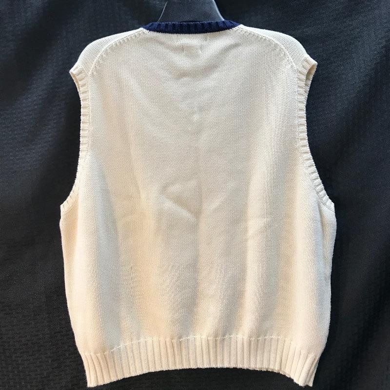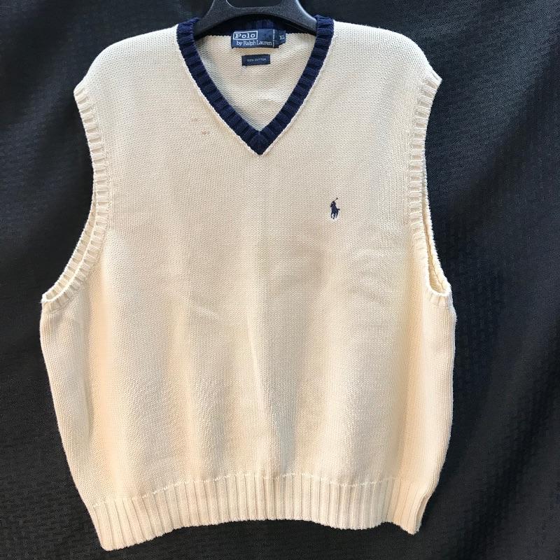 Up for auction is a Ralph Lauren sweater vest. It is beige with navy blue accents and it’s made of 100% cotton. There is some staining on the front of the vest; see pictures.