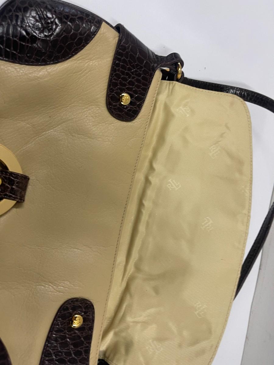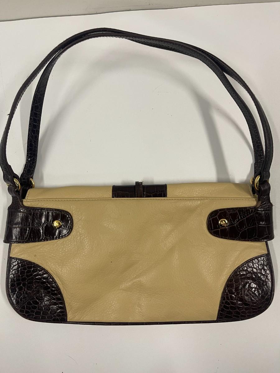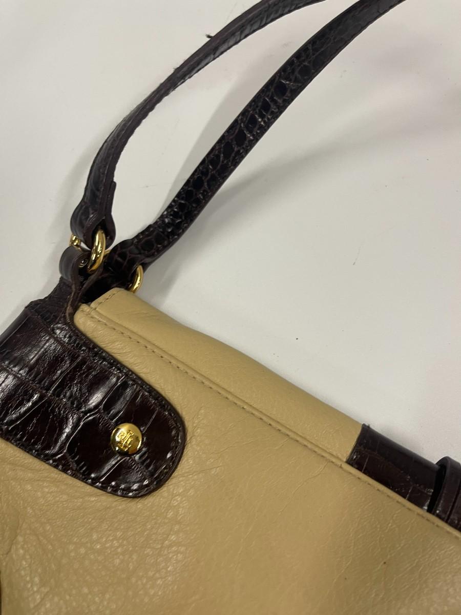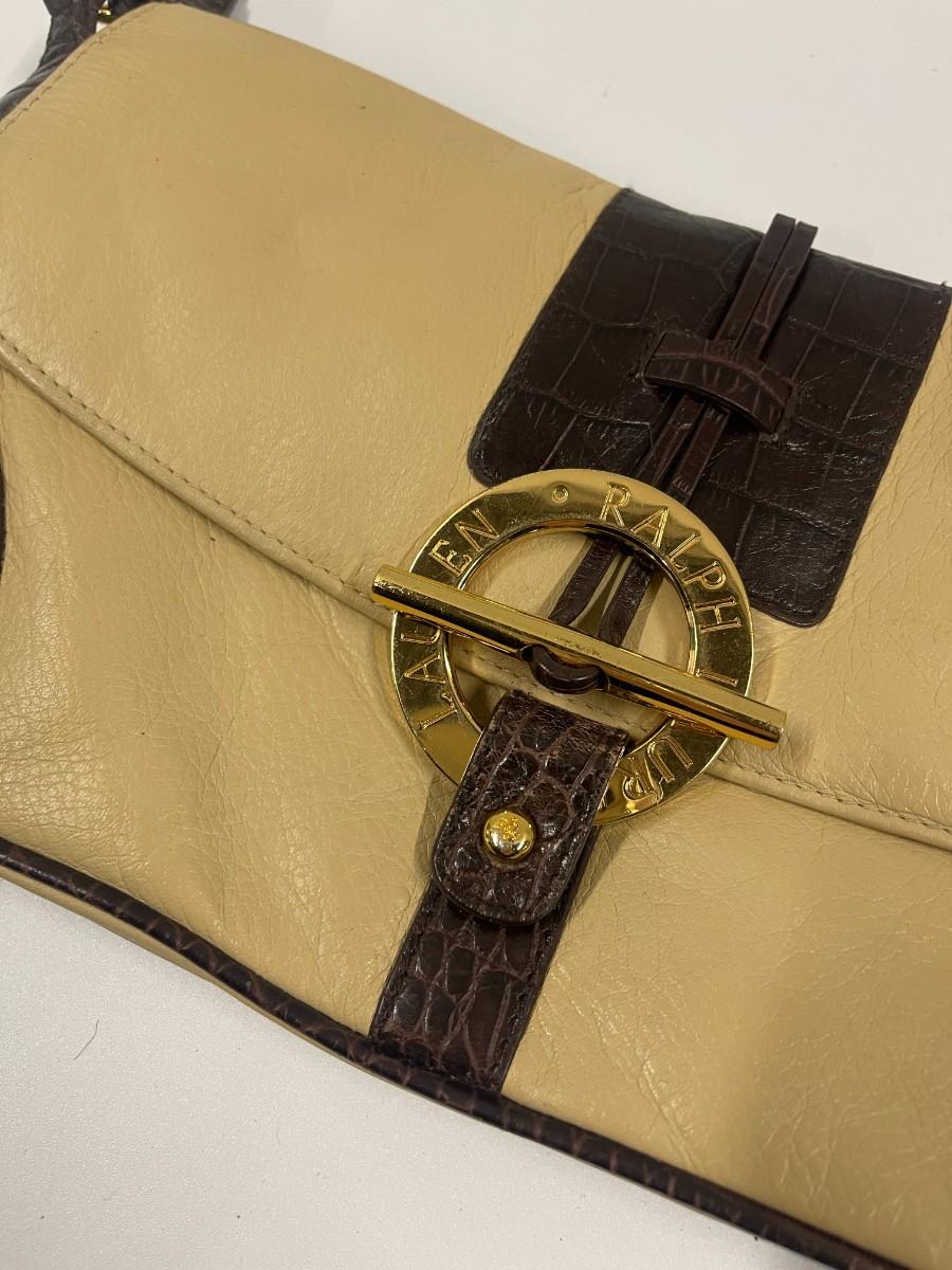 Ralph Lauren two tone tan and brown leather handbag with gold tone toggle clasp. Good condition. Has some markings here and there and some wear at the bottom corners. 6" x 12"