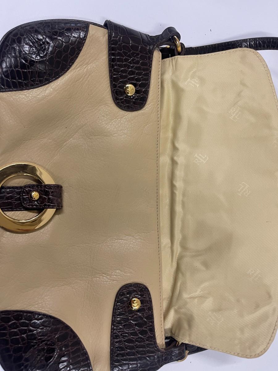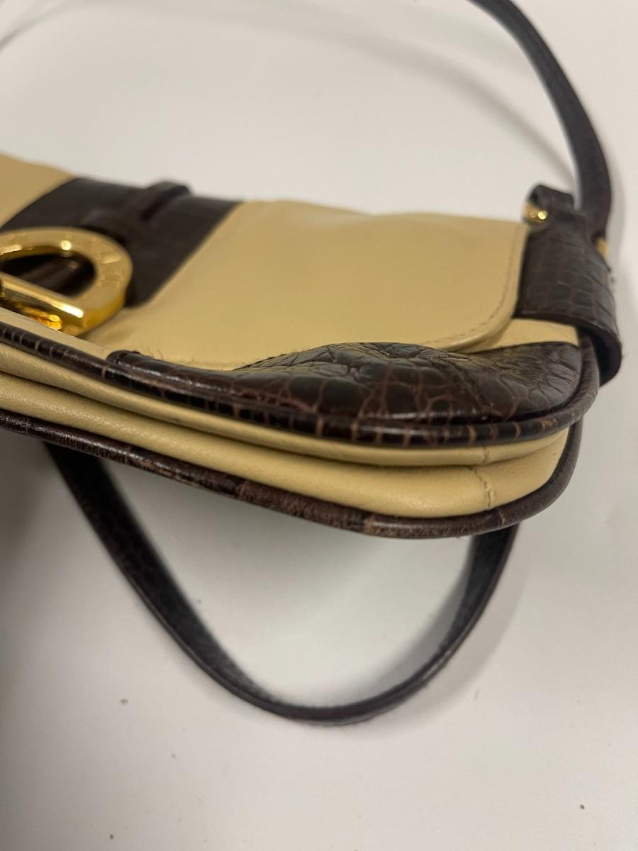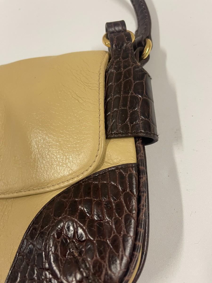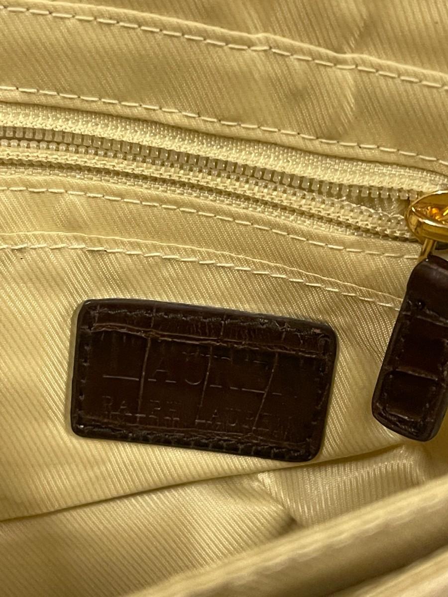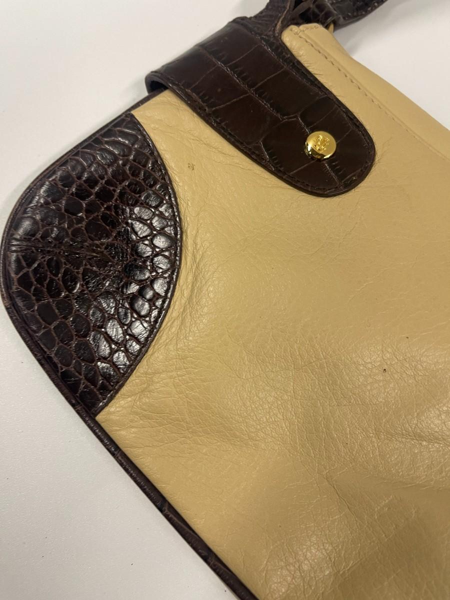 Ralph Lauren two tone tan and brown leather handbag with gold tone toggle clasp. Good condition. Has some markings here and there and some wear at the bottom corners. 6" x 12"