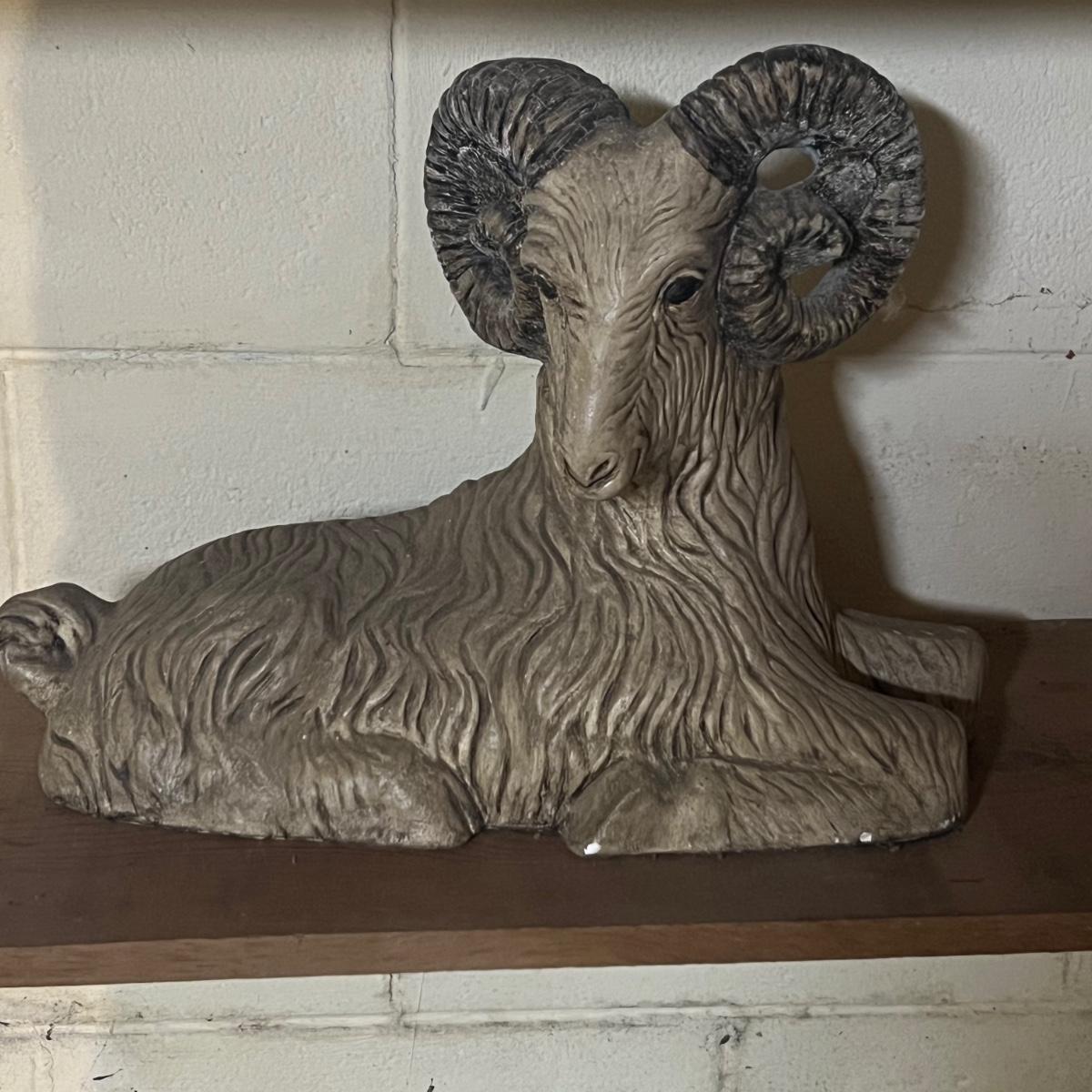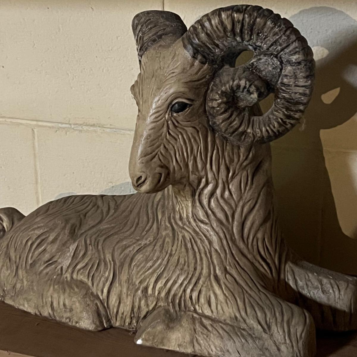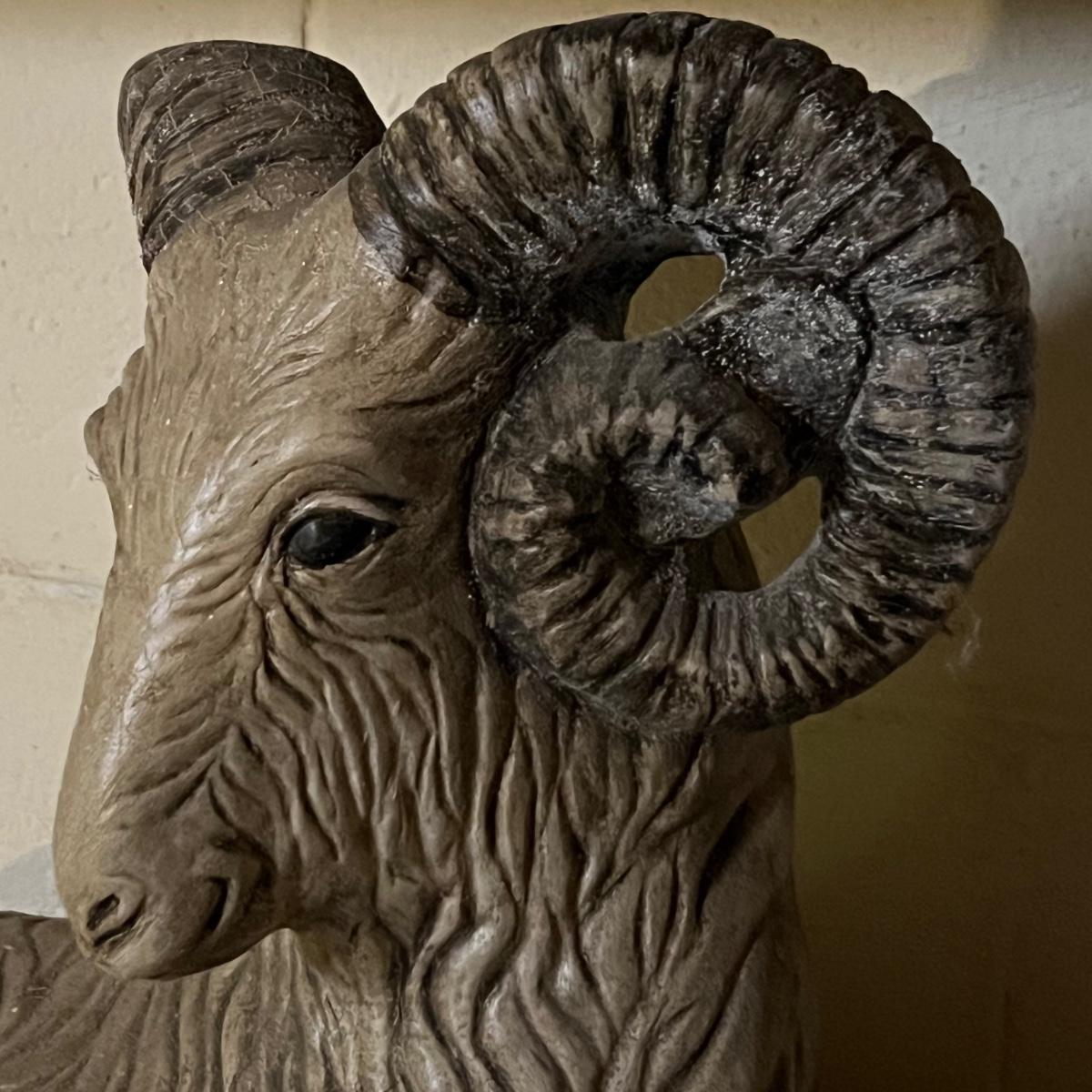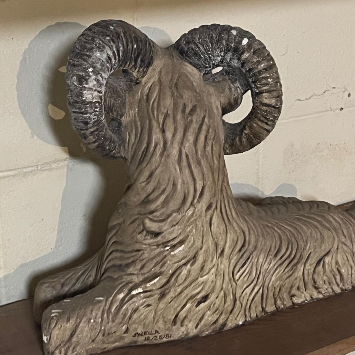 This large sculpture of a ram is ceramic and measures 19” x 8” x 15”H. There are a few areas where the glaze has chipped off, see images. There is a signature and date that reads Sheila 12/25/81.