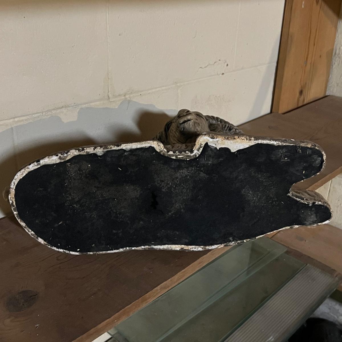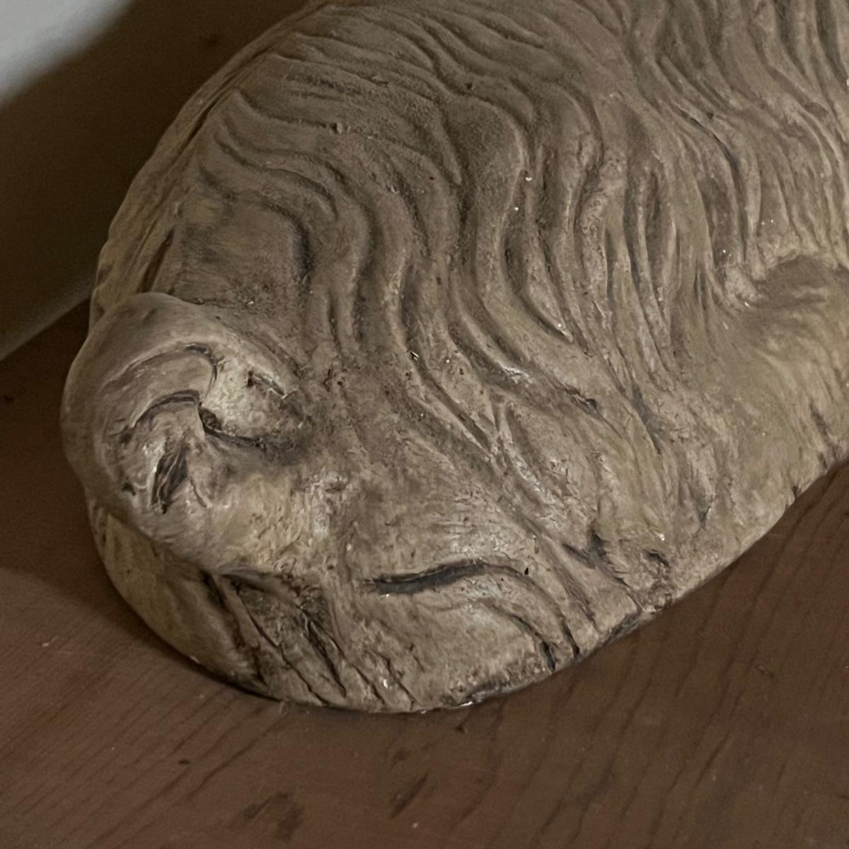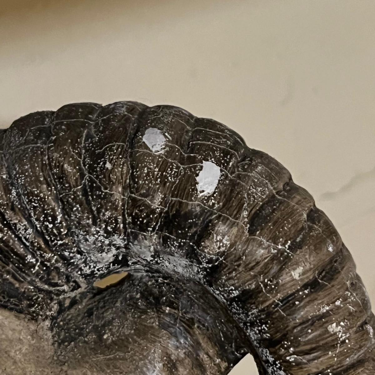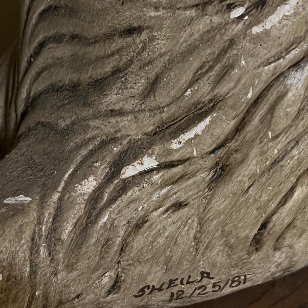 This large sculpture of a ram is ceramic and measures 19” x 8” x 15”H. There are a few areas where the glaze has chipped off, see images. There is a signature and date that reads Sheila 12/25/81.
