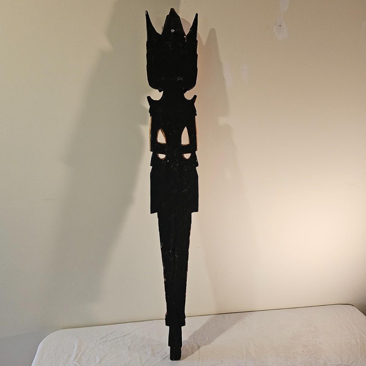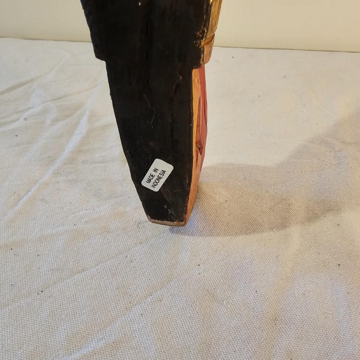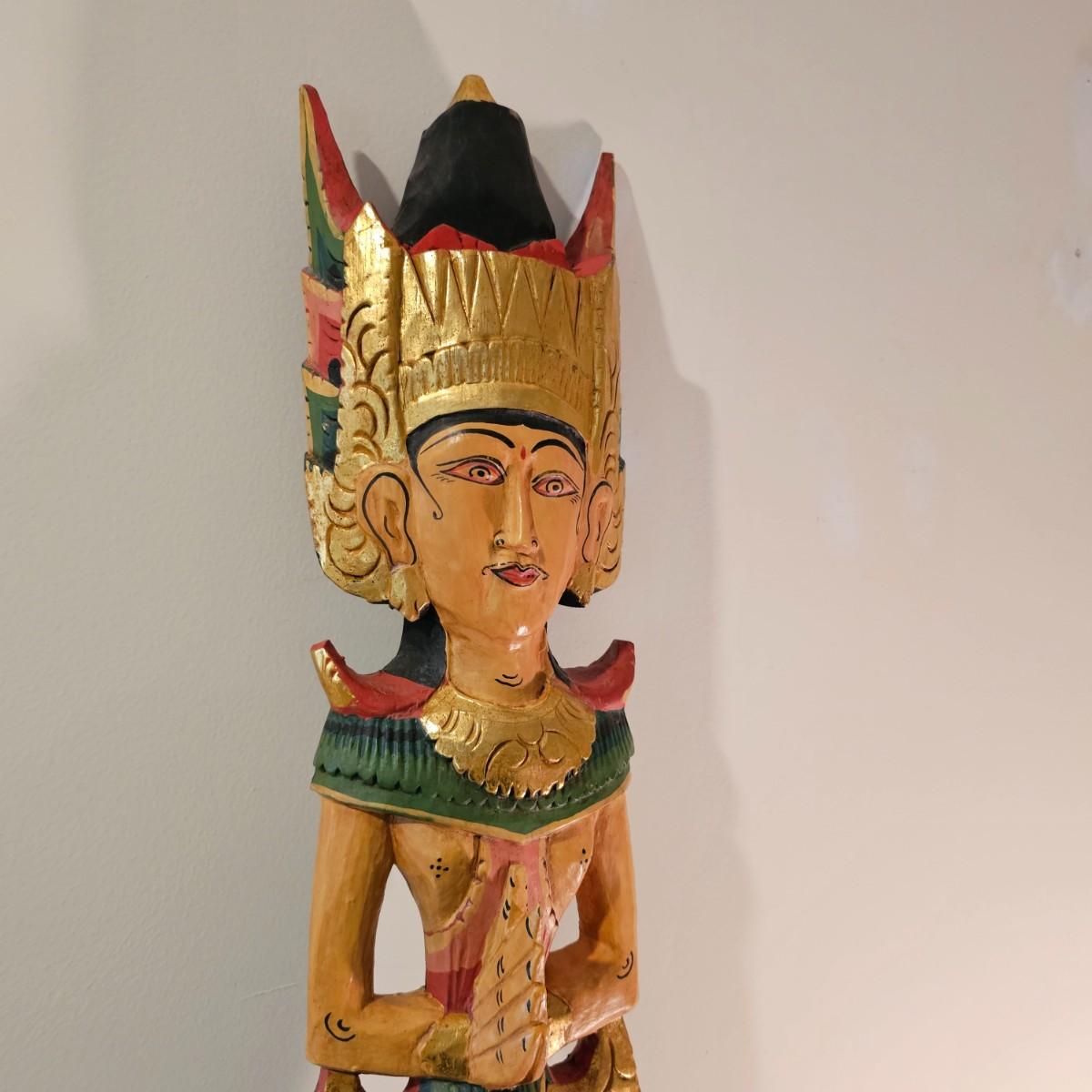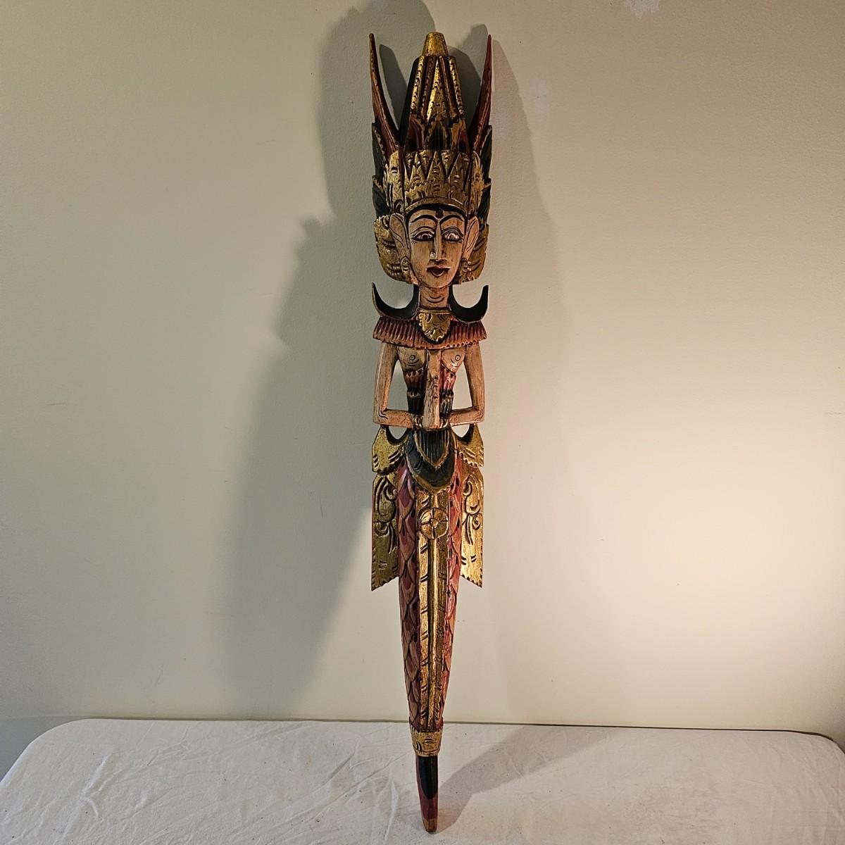 A pair of Indonesian wooden wall sculptures that appear to be Hindu figures Rama & Sita. Highly carved and painted, these two have expressive facial features and costumes. Hanging hooks on back of both items. Largest piece measures 6" x 3" x 42" H, shorter is 6.5" x 3" x 38". See photos for details. Shipping available.