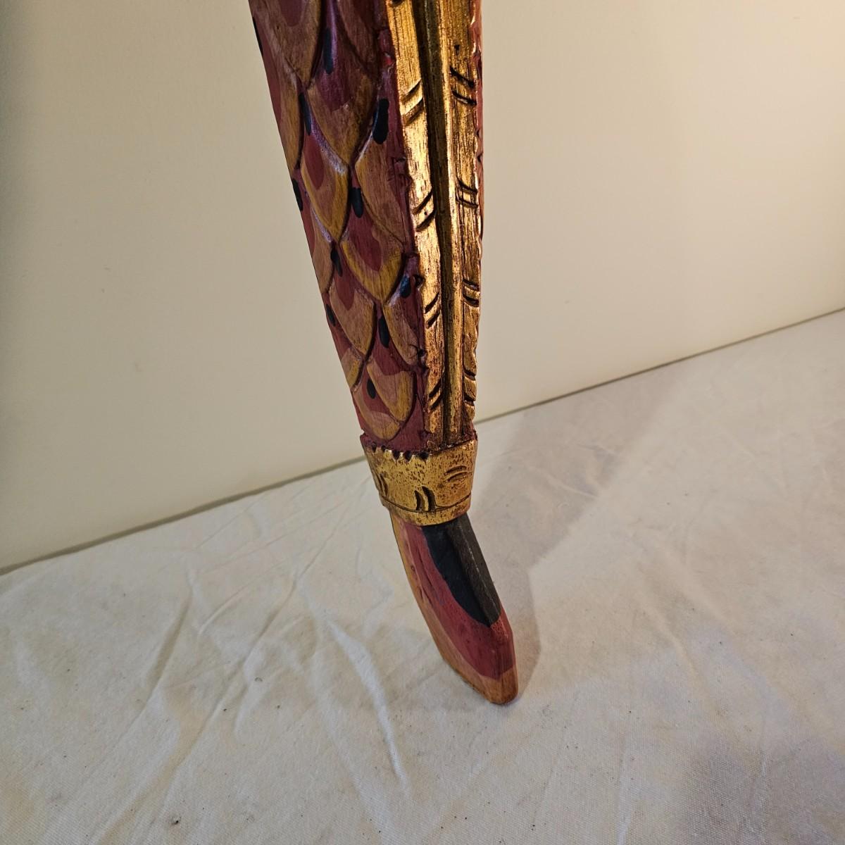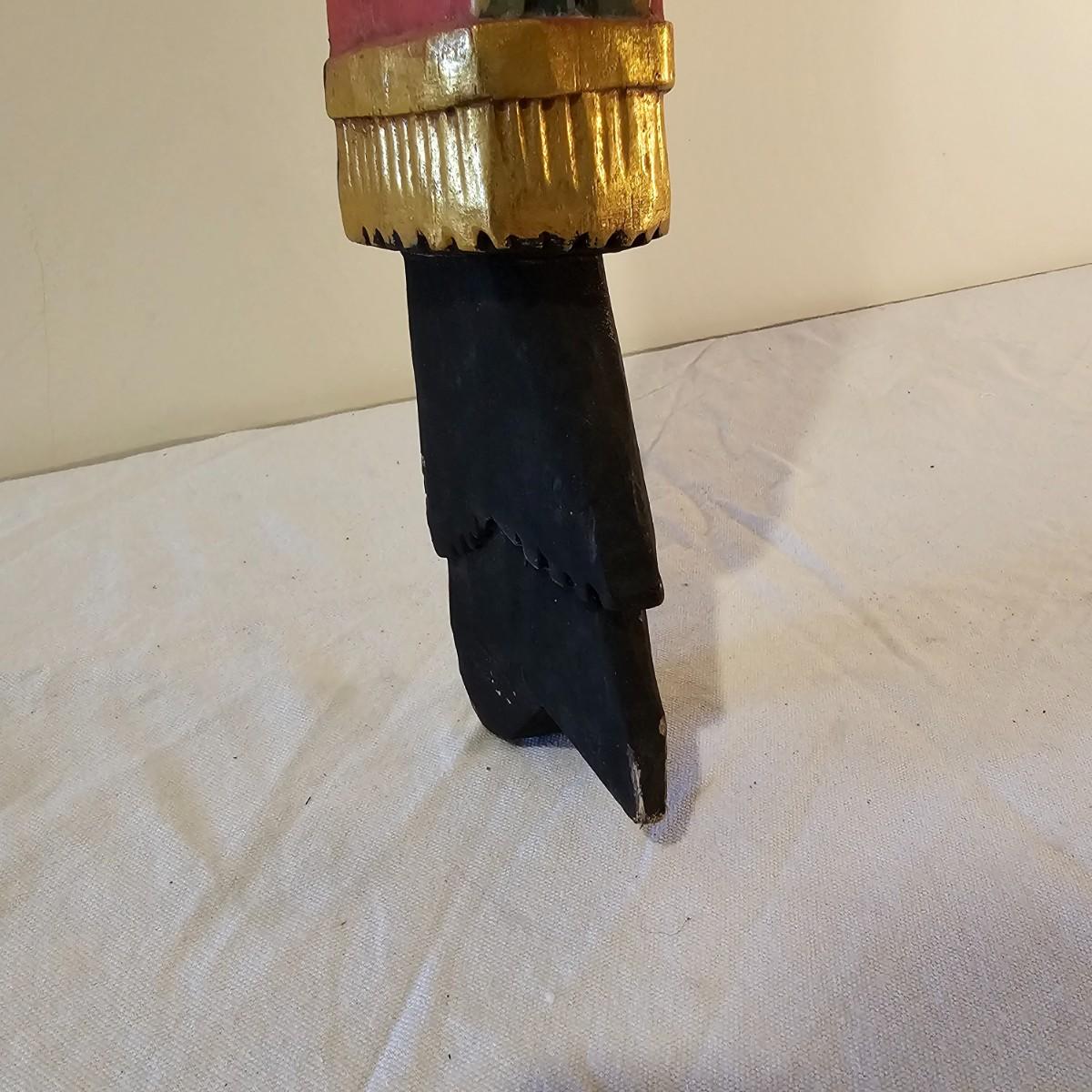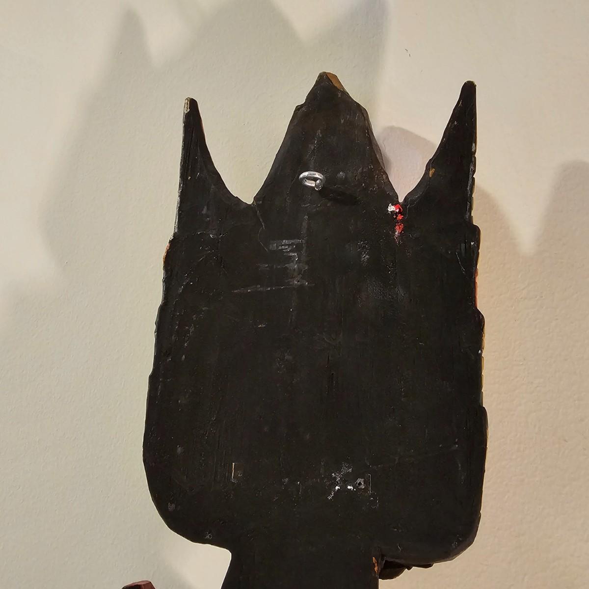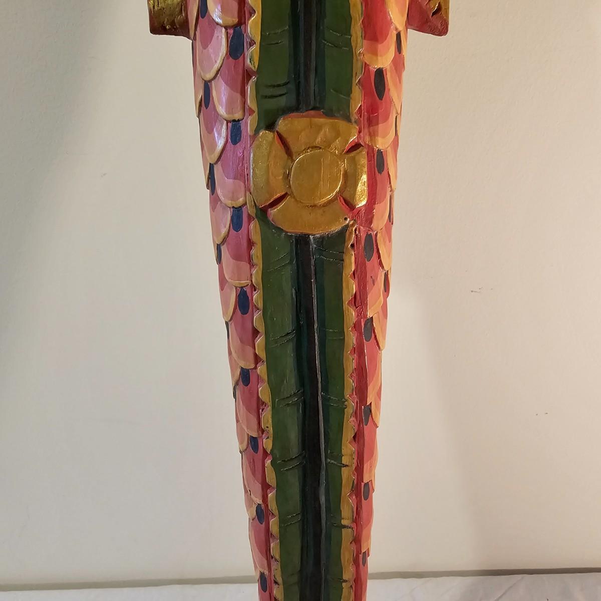 A pair of Indonesian wooden wall sculptures that appear to be Hindu figures Rama & Sita. Highly carved and painted, these two have expressive facial features and costumes. Hanging hooks on back of both items. Largest piece measures 6" x 3" x 42" H, shorter is 6.5" x 3" x 38". See photos for details. Shipping available.