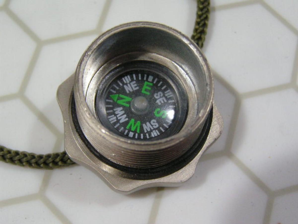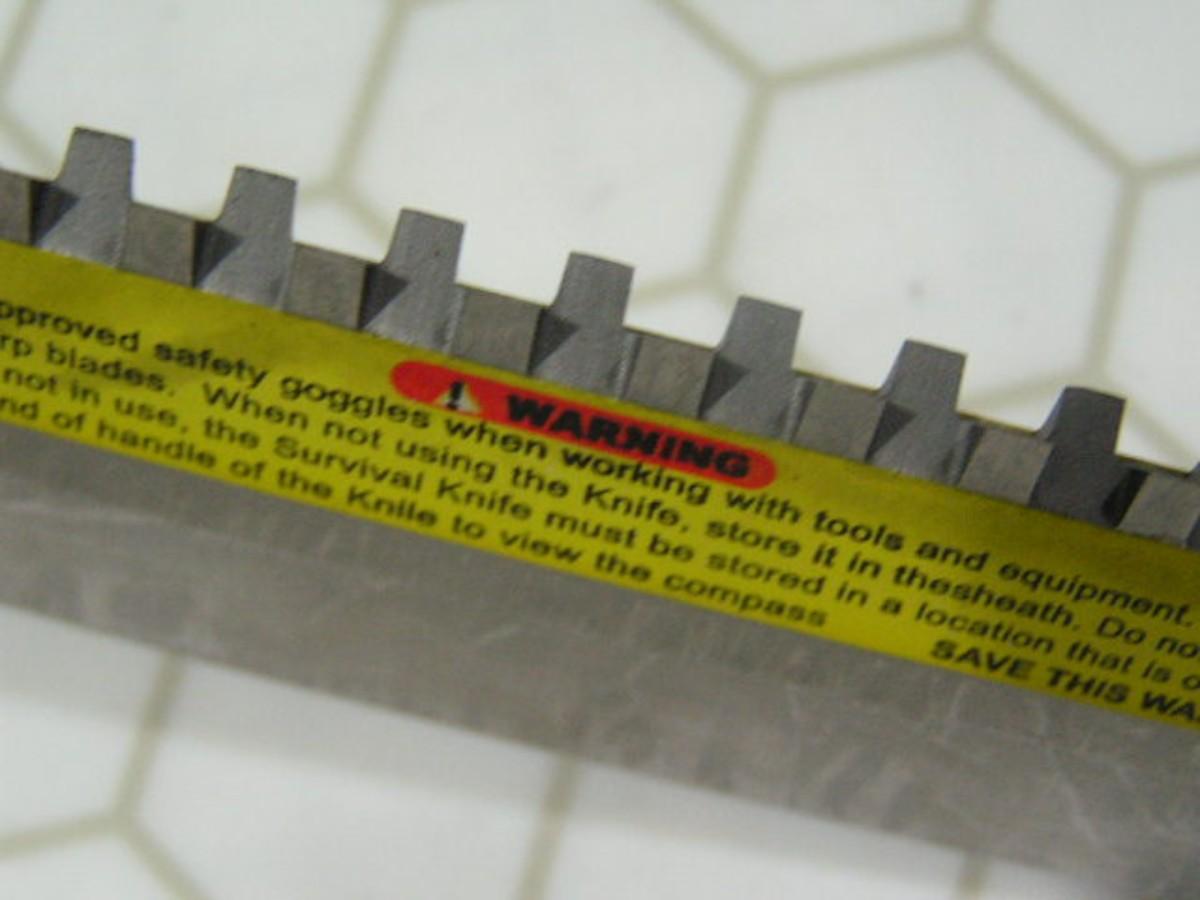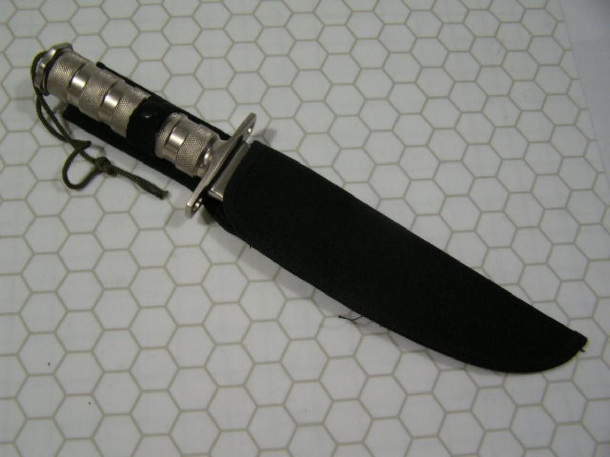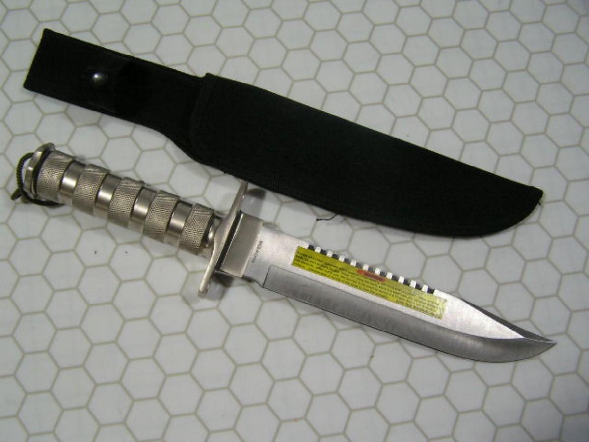 “Rambo Knife” Wanna Be, stainless steel, 8” heavy blade w/saw back. Hollow handle with goodies inside and compass inside o-ring sealed water tight screw-on cap. Nylon sheath & lanyard. Looks unused.