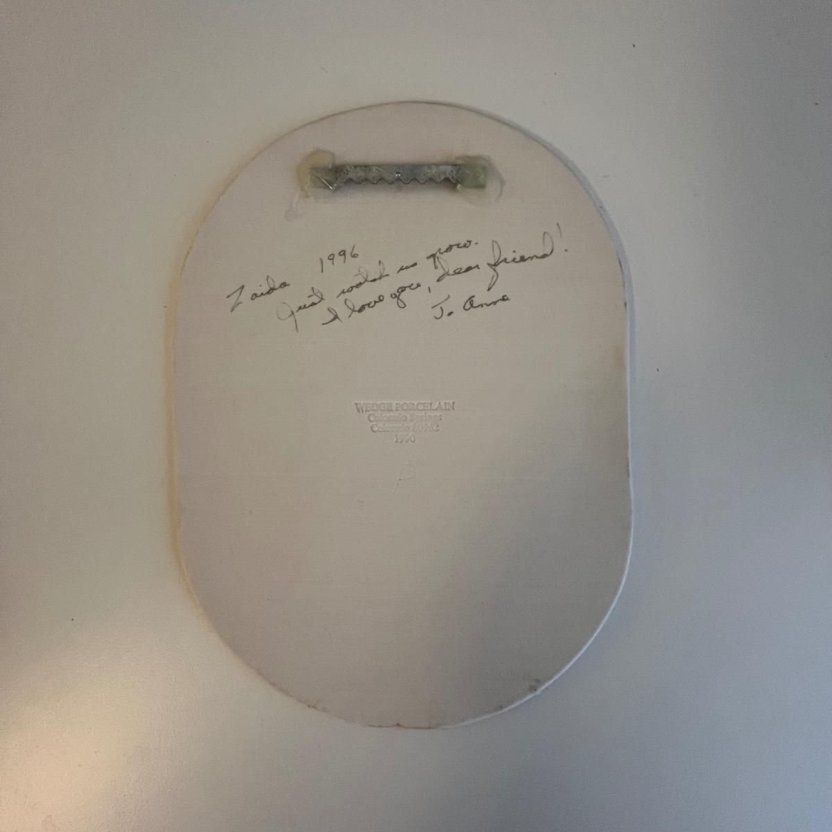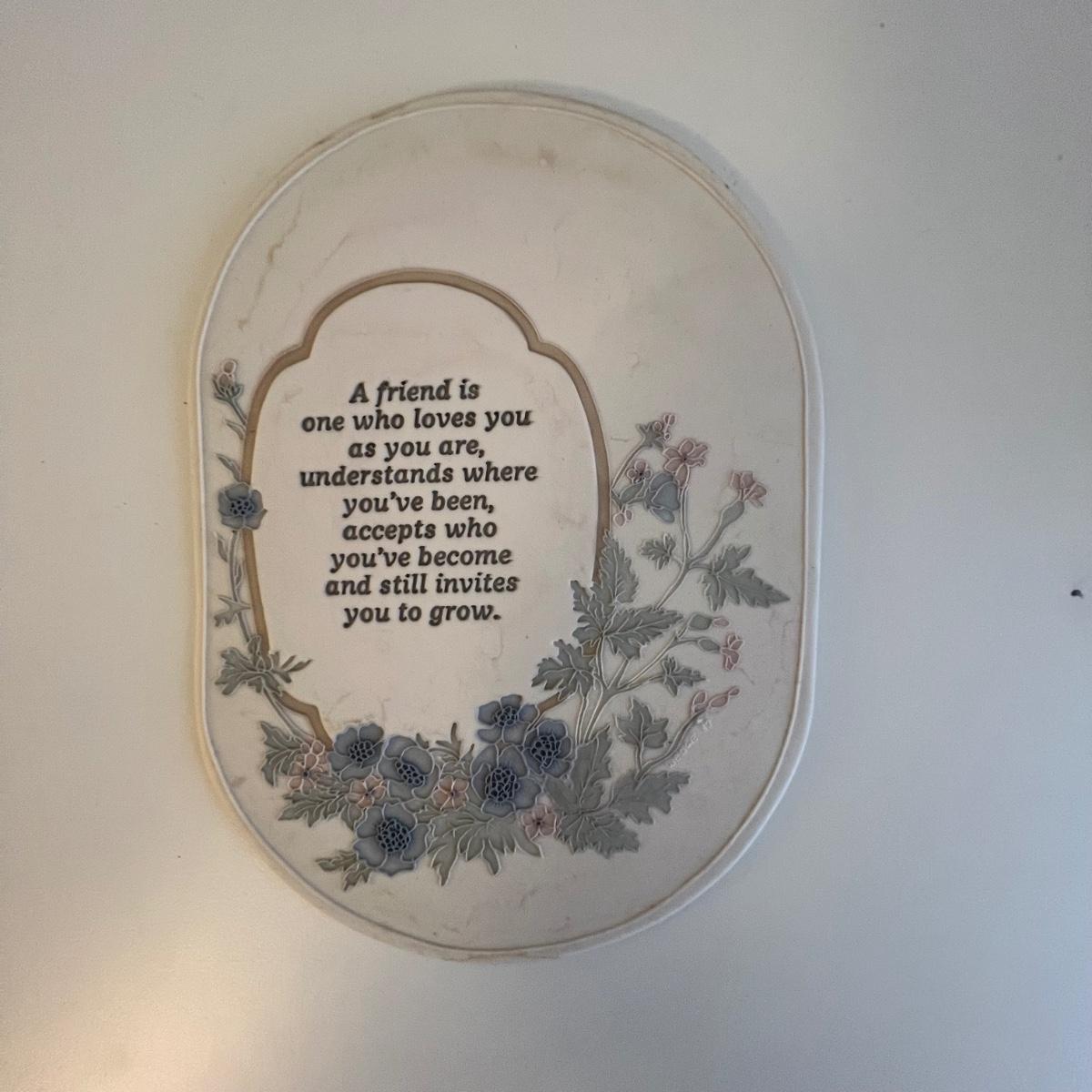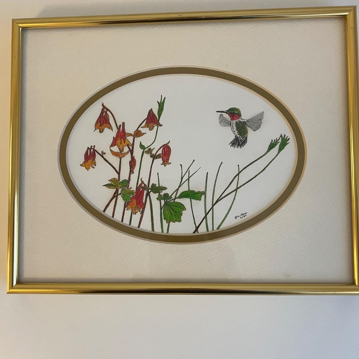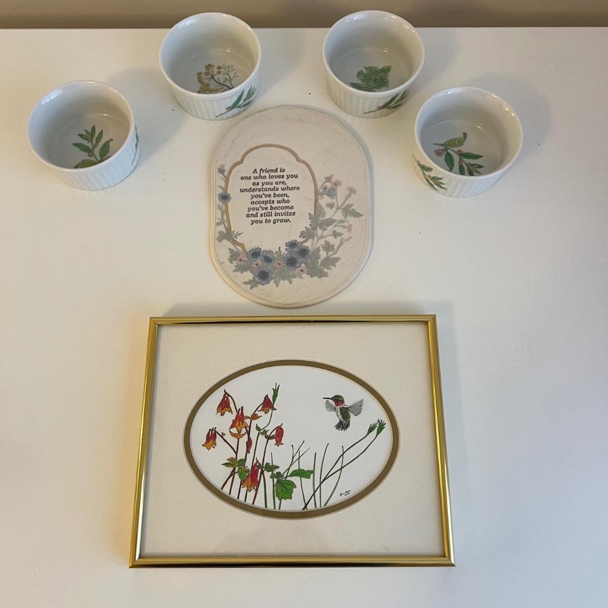 A lovely hummingbird print by Jim Ross framed in gold metal. Measures 10” x .75” x 8.25”H. Four Shafford herbs and spices themed porcelain ramekins each measure 4”D x 2”H. A lovely pottery decor piece on friendship included as well.