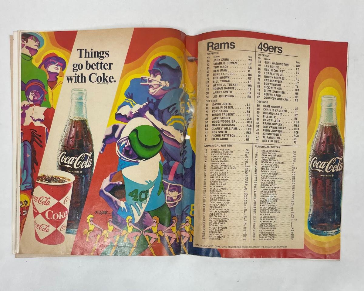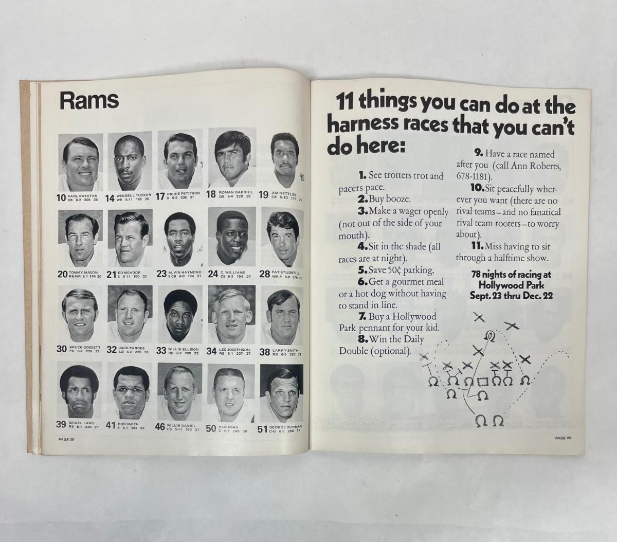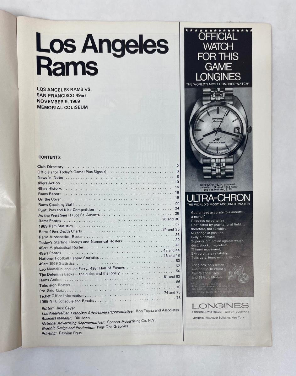 Game Program for LA Rams home game on Nov. 9th 1969. Back cover is missing, pages are in good shape with no tears or folds. Lots of great photos and stories about players, and it is filled with advertising of products and services from 55 years ago.