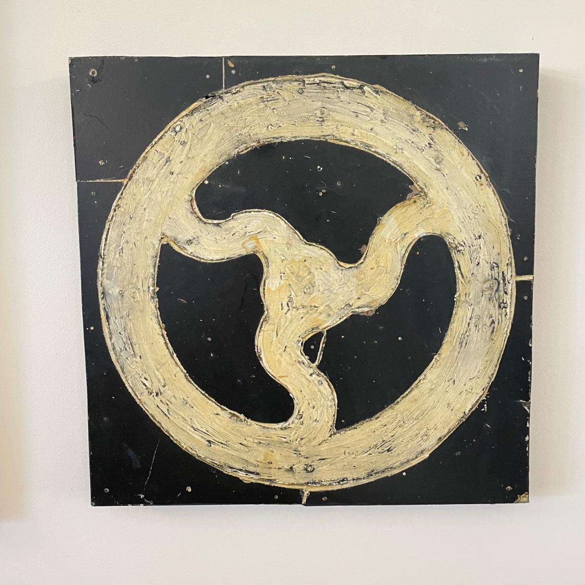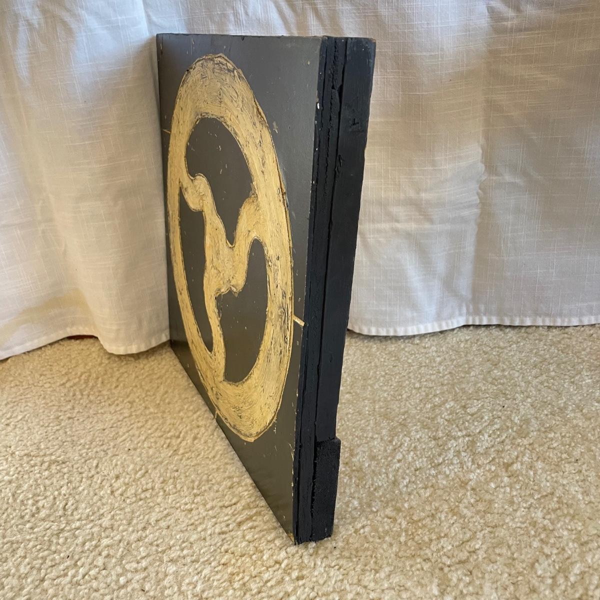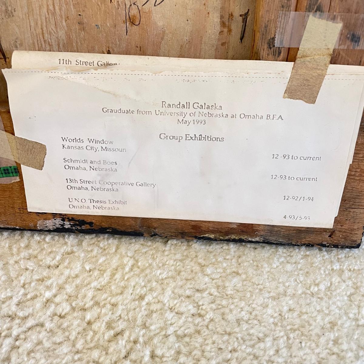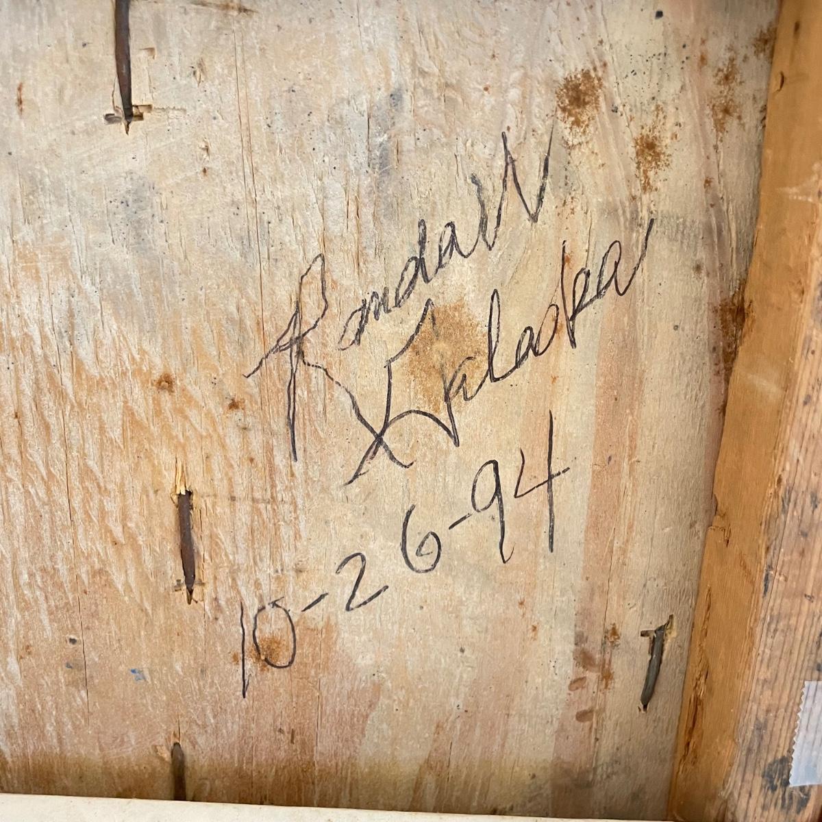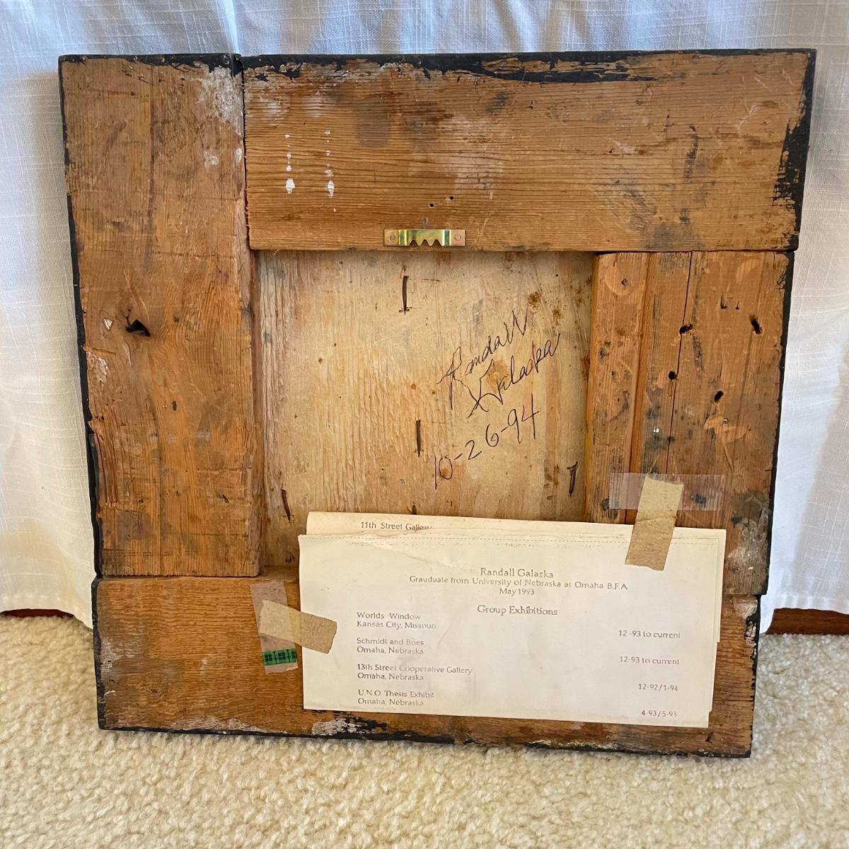 Art signed and dated by Randall Galaska. Art appears to be painted on reclaimed wood with wood frame backing. Two printed pages of information are taped to the back of the art. Piece measures 14”sq, it is about 1.25” thick. See images. Shipping available.