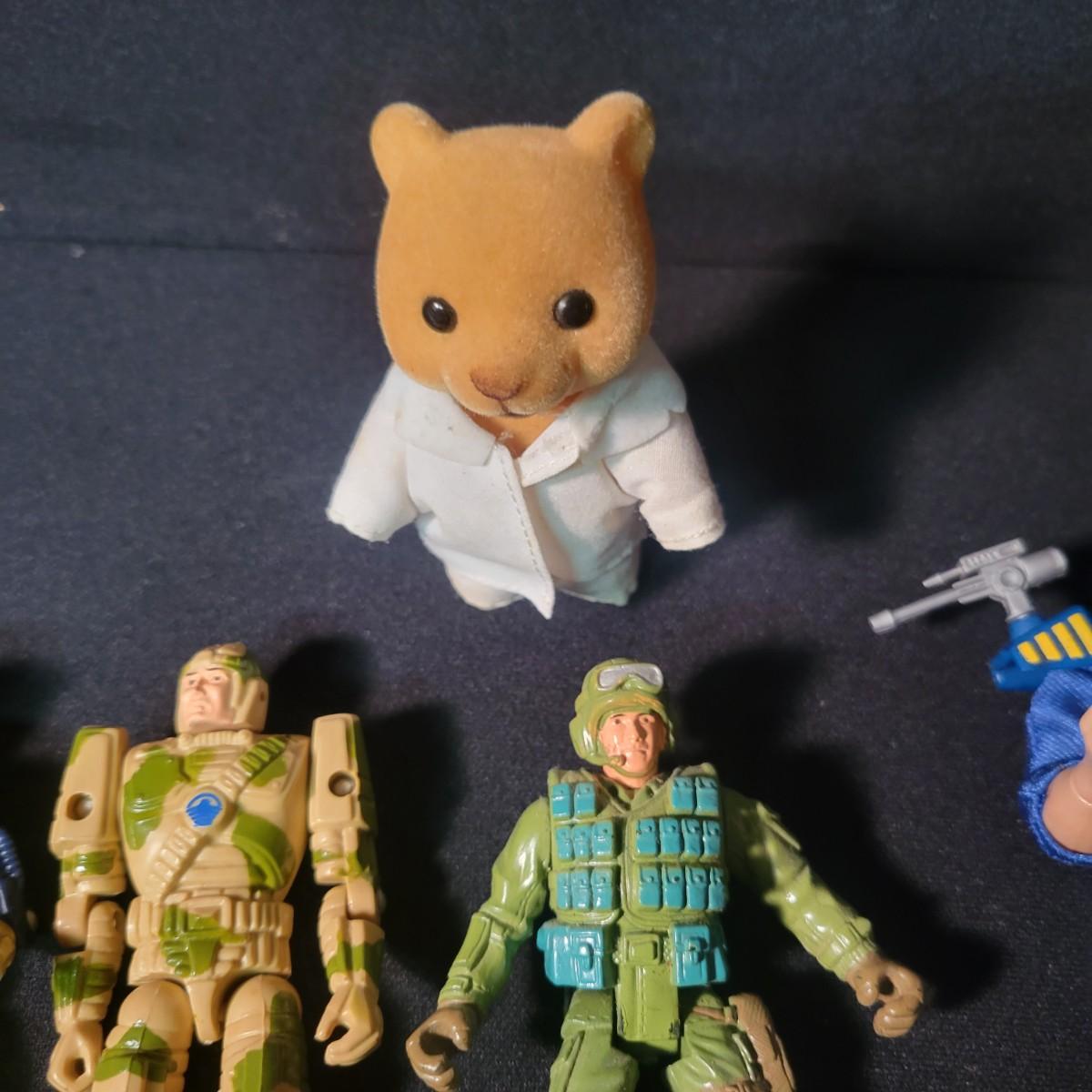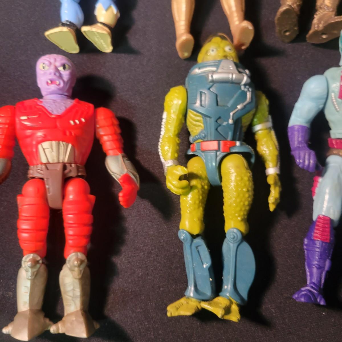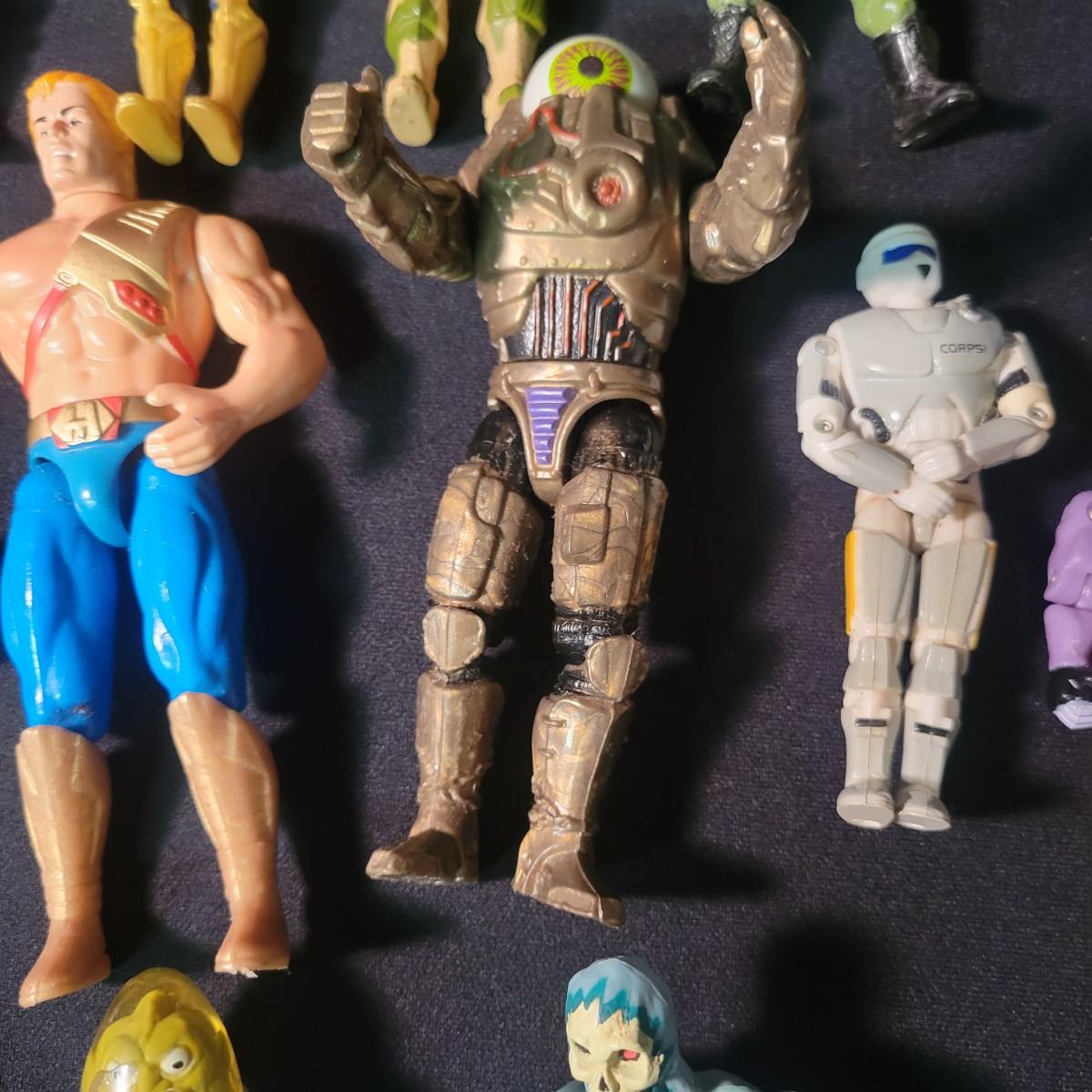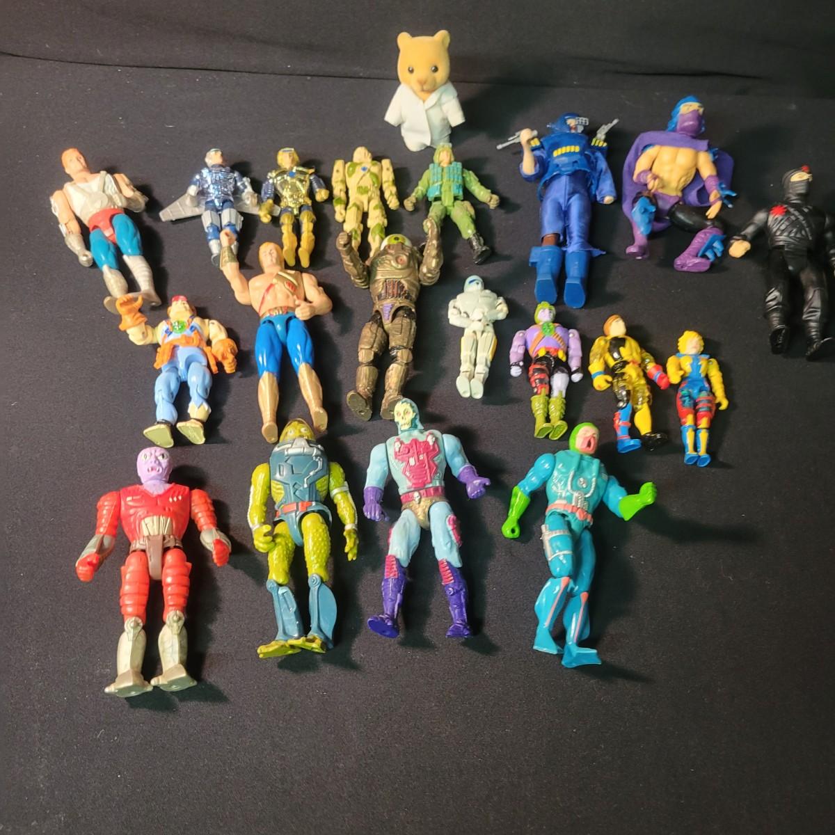 An assortment of vintage action figures from the 80s. Ninjas, Aliens, robots with eyeball heads. There's even a cute little mouse in lab coat. Largest action figure measures 6” tall.