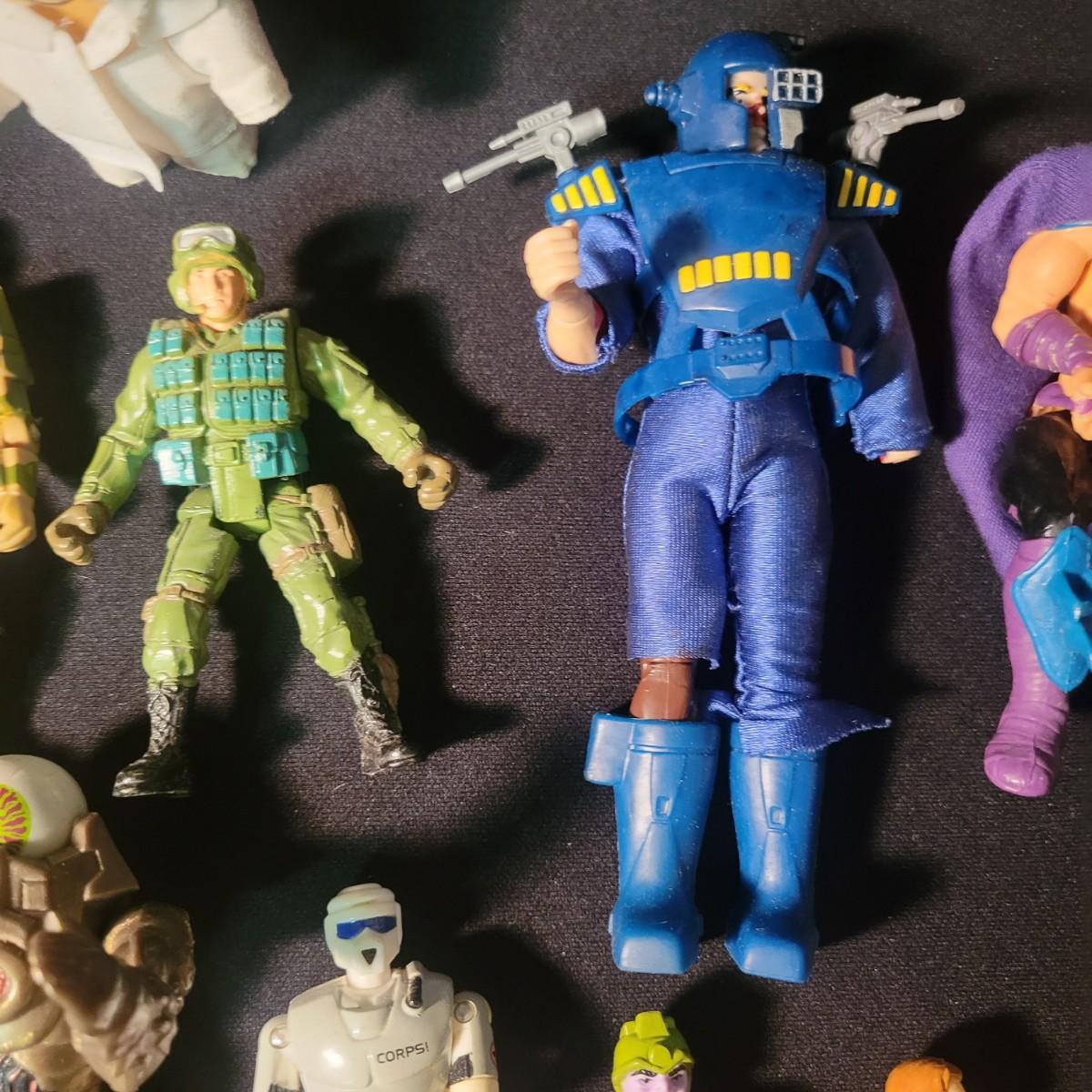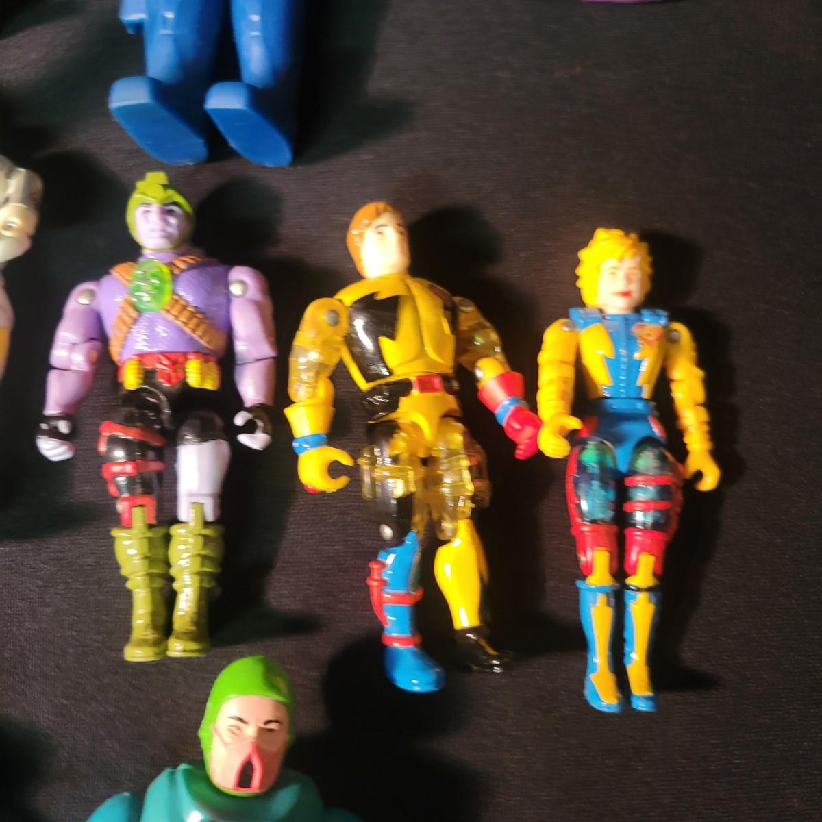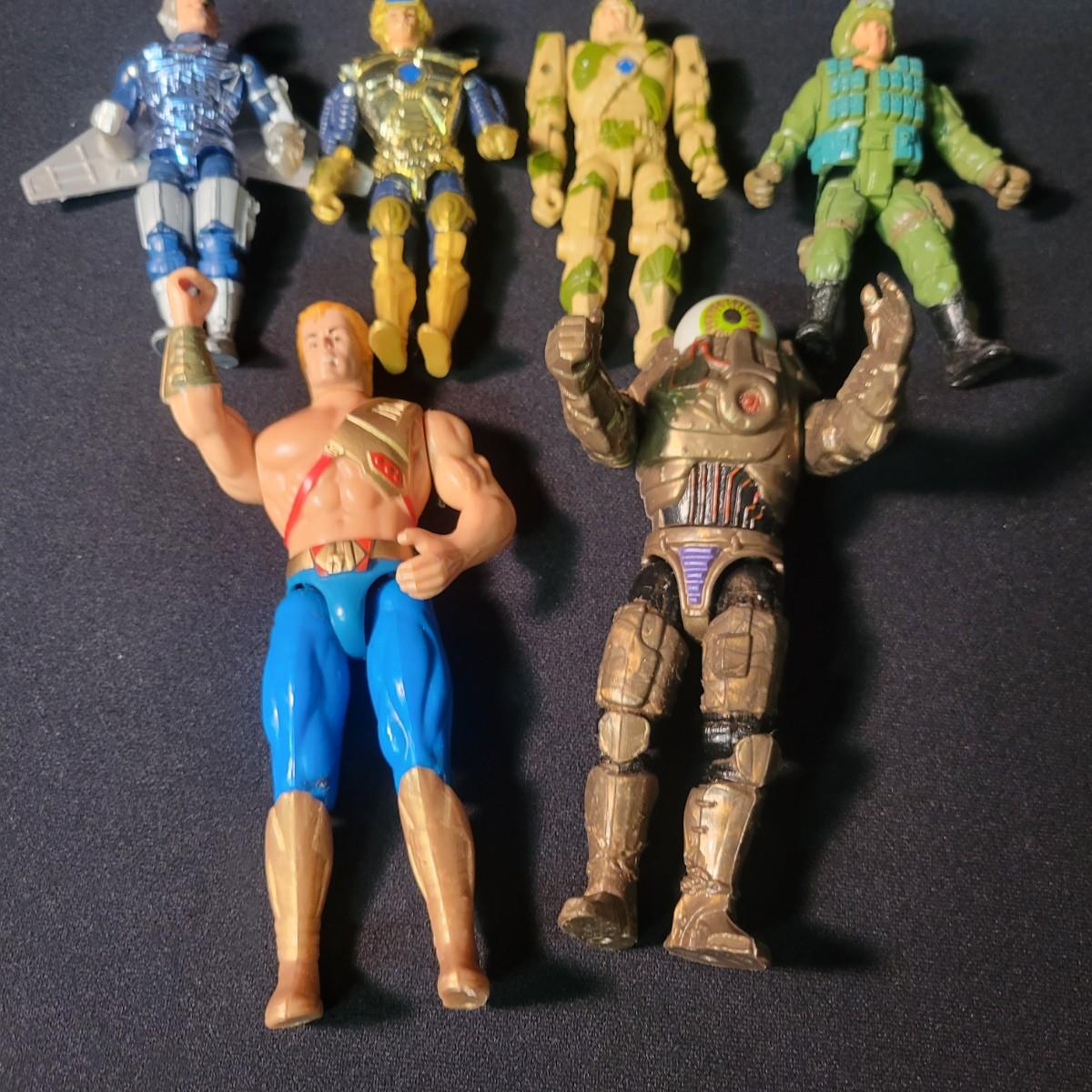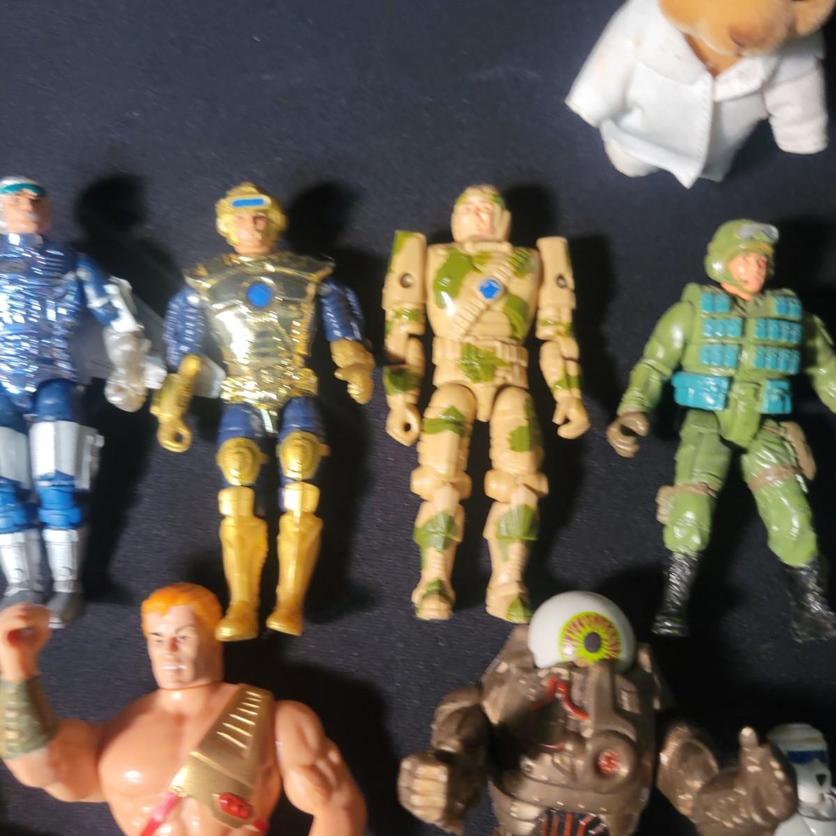 An assortment of vintage action figures from the 80s. Ninjas, Aliens, robots with eyeball heads. There's even a cute little mouse in lab coat. Largest action figure measures 6” tall.