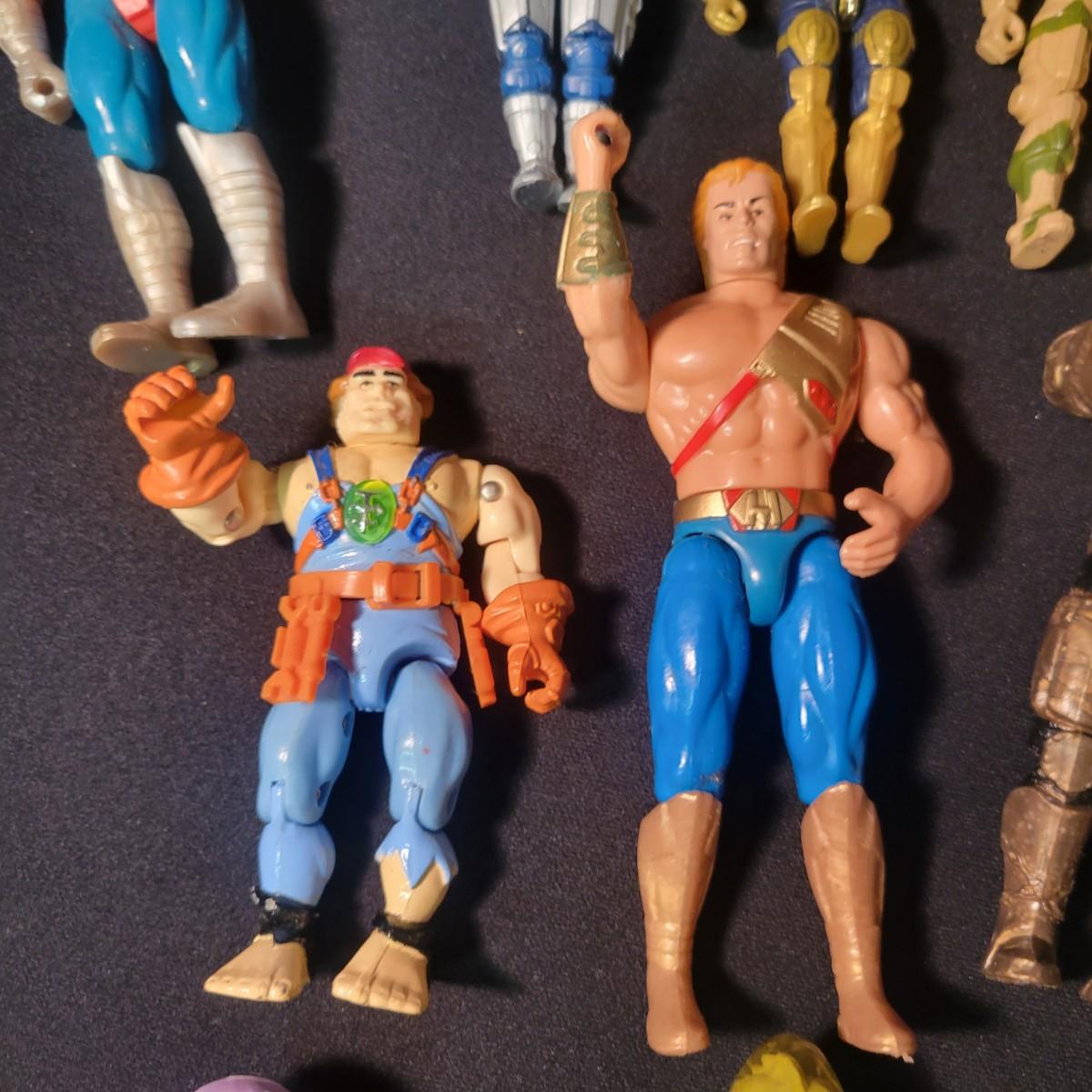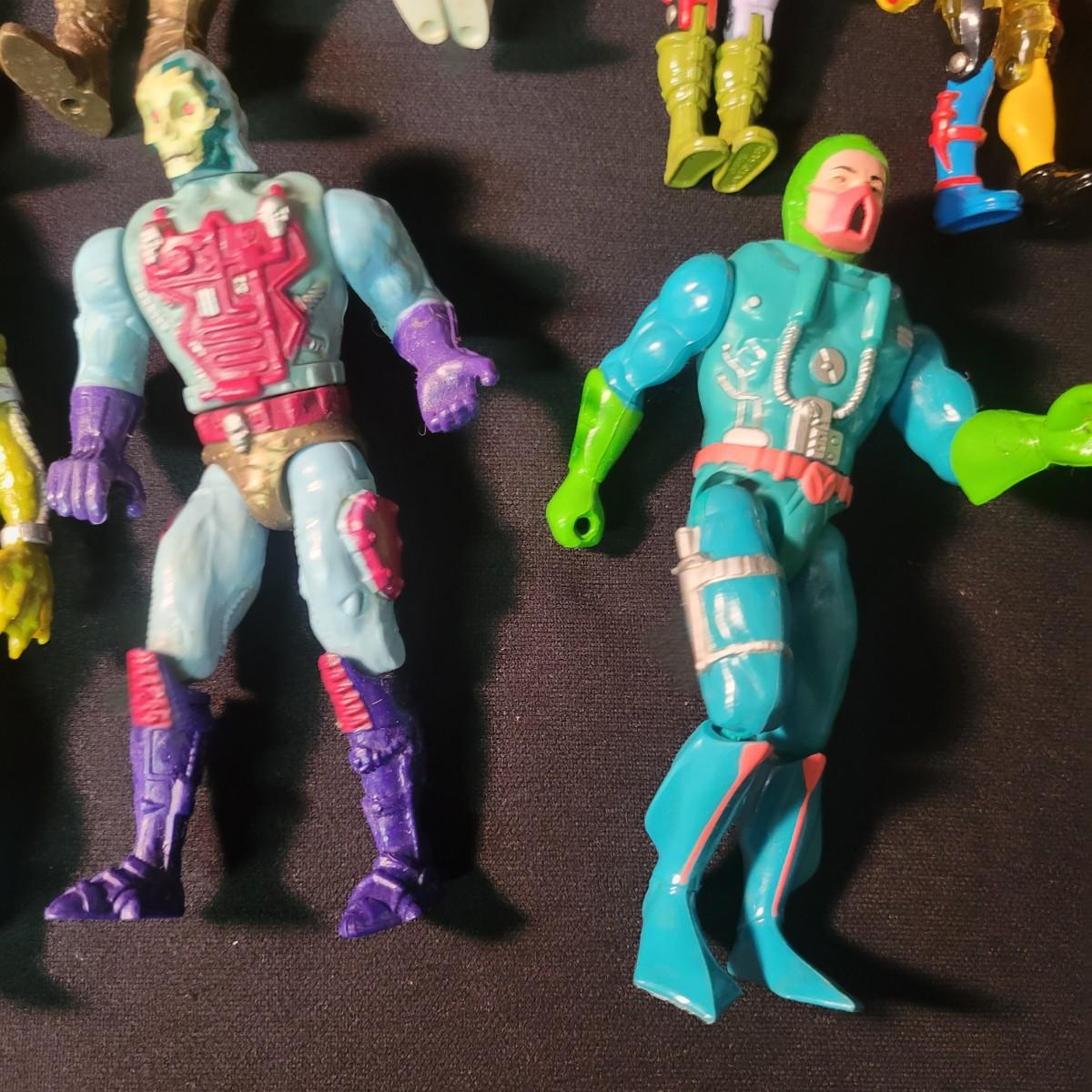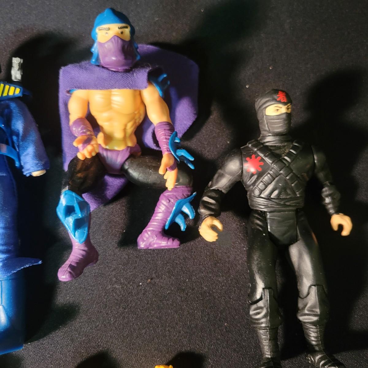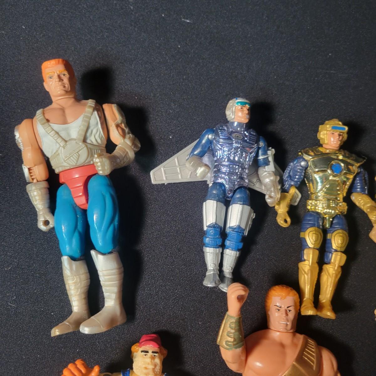 An assortment of vintage action figures from the 80s. Ninjas, Aliens, robots with eyeball heads. There's even a cute little mouse in lab coat. Largest action figure measures 6” tall.