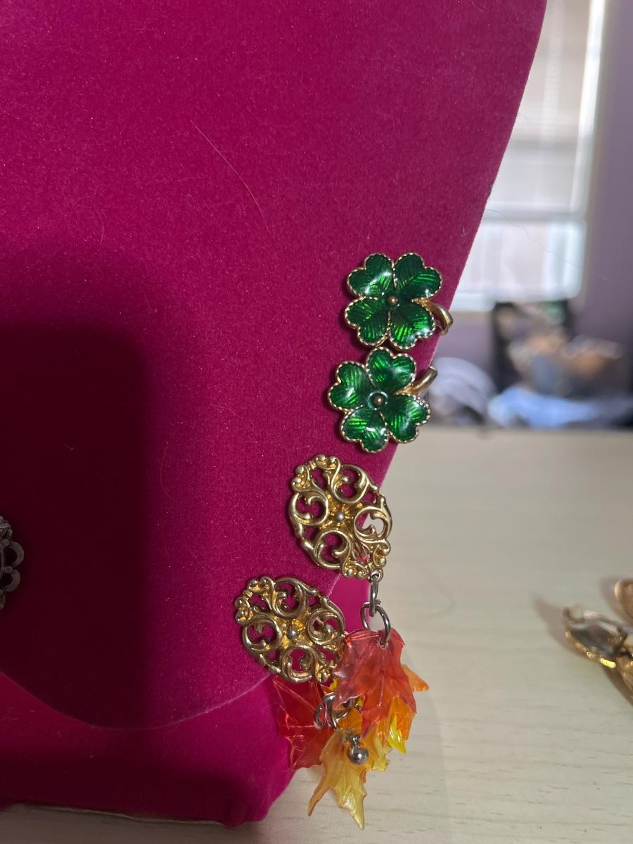 Golden toned dangle earrings 2 and 1/2in with orange and yellow leaves