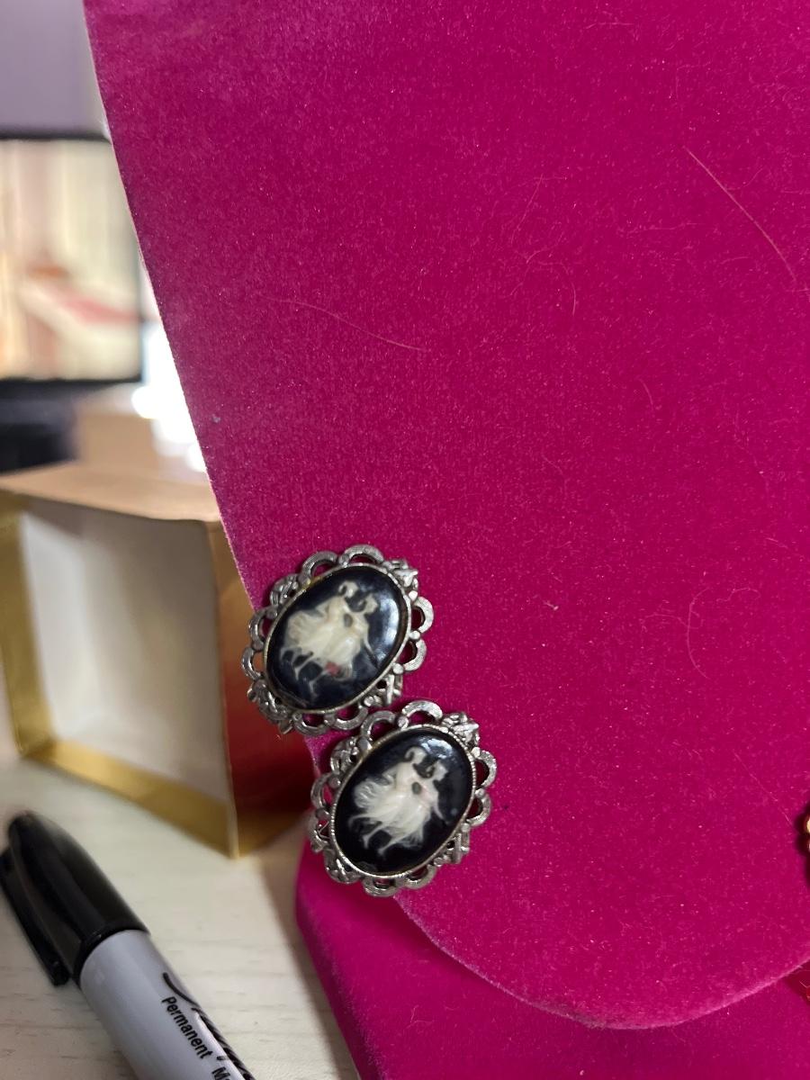 Silver toned oval earrings with blue back ground and two white ballerinas 1in